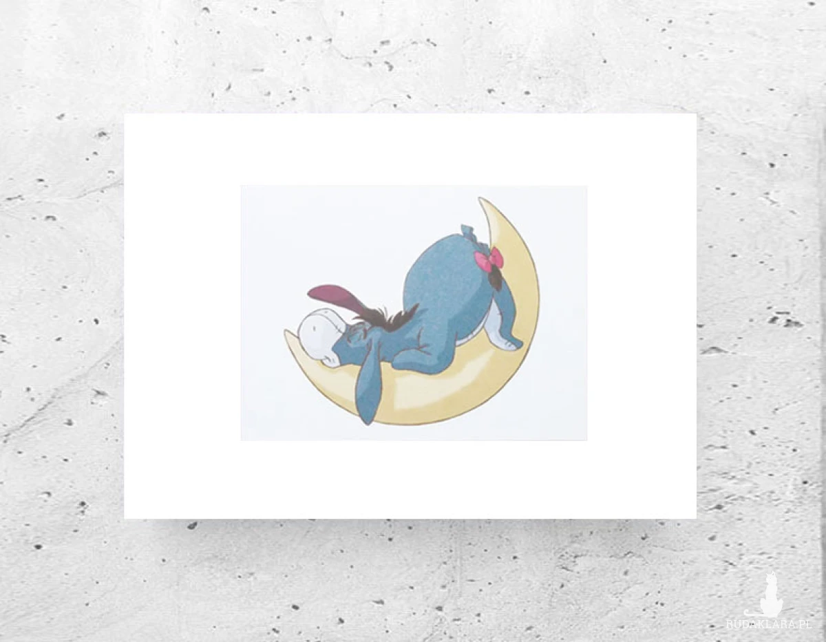 Nowy, kolorowy obrazek z osiołkiem o imieniu Kłapouchy z bajki o Kubusiu Puchatku. Dekoracja na ścianę do pokoju dziecięcego, kuchni, sypialni, jadalni, żłobka, bawialni, przedszkola, klubu malucha itp. Ładny plakat dla dziewczynki lub małego chłopczyka. Grafika na białym kartoniku w formacie A4. Poster wystarczy dać do ramki. Obrazek sprawdzi się w każdym stylu urządzania wnętrz.