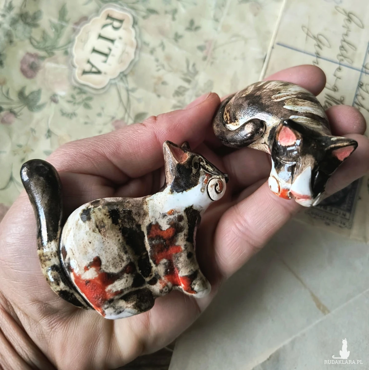 Kotki wykonane z gliny szamotowej, wypalone na biskwit, a następnie szkliwione w temperaturze ok 1260 stopni C. O wymiarach ok; 5 x 6 cm. Serdecznie polecam wszystkim miłośnikom kotków