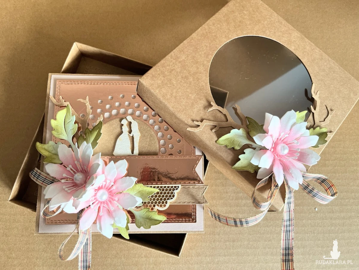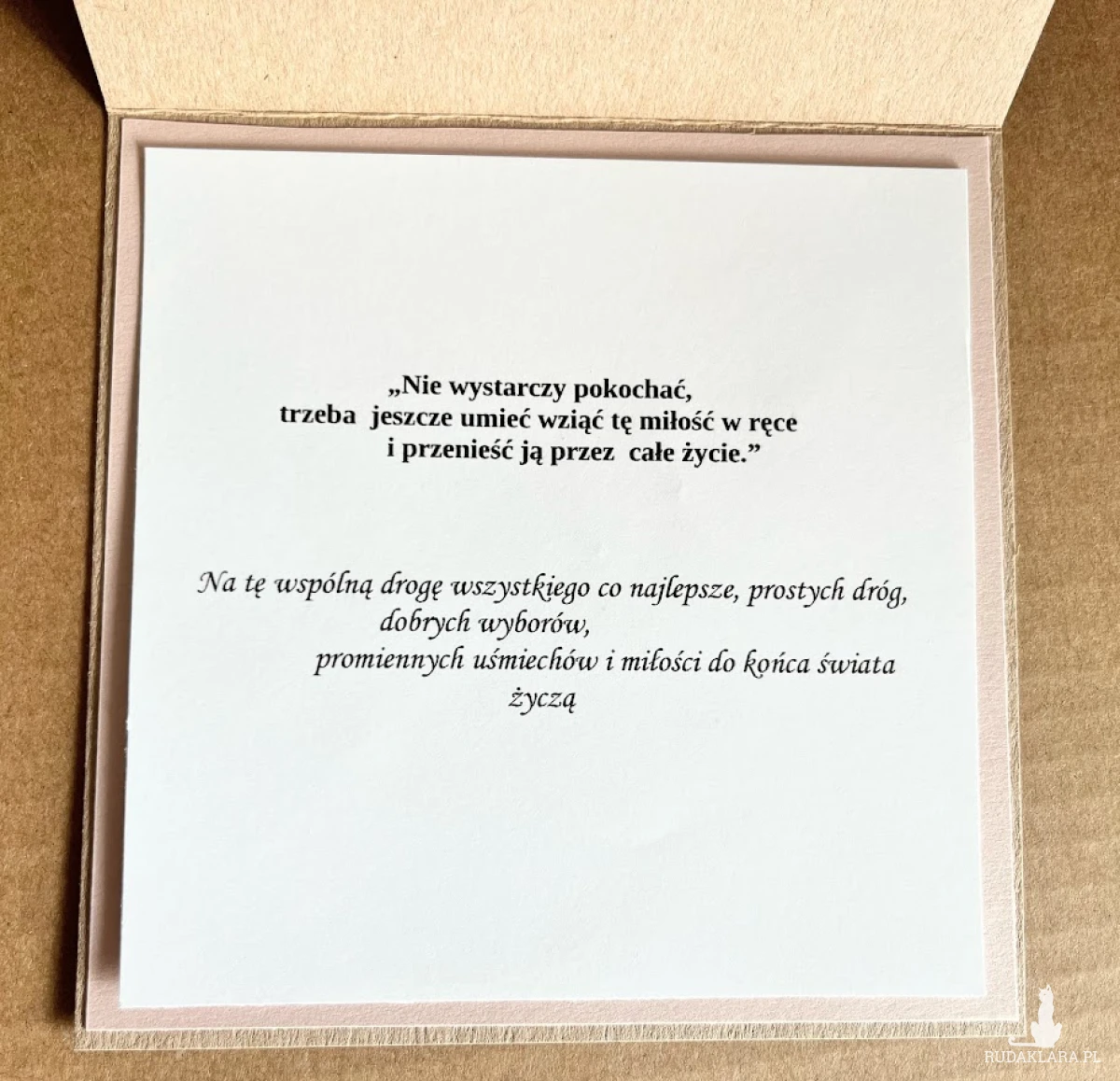 Kartka z okazji Ślubu wykonana ręcznie z niezwykłą starannością i dbałością o każdy detal. Na bazie z papieru kraftowego, w naturalnej brązowej kolorystyce z dodatkiem lustrzanego rożowego złota, z elegancką kwiatową kompozycją wraz z pudełkiem z okienkiem ozdobionym w tej samej stylizacji. Do kompletu dołączono torebkę w tej samej stylizacji.Wielkość torebki 18x23cm x 8cm. Rozmiar kartki 14,0 x 14,0 cm. Wewnątrz kartki znajdują się gotowe życzenia do własnoręcznego podpisu a na dnie pudełka kieszonka na małe co nieco.Pudełko z papieru kraftowego -rozmiar 15,5 x 15,5 cm .W tej postaci komplet dostępny od ręki. Jest możliwość personalizacji w uwagach do zamówienia podać imiona i datę ślubu oraz imiona skladających życzenia.