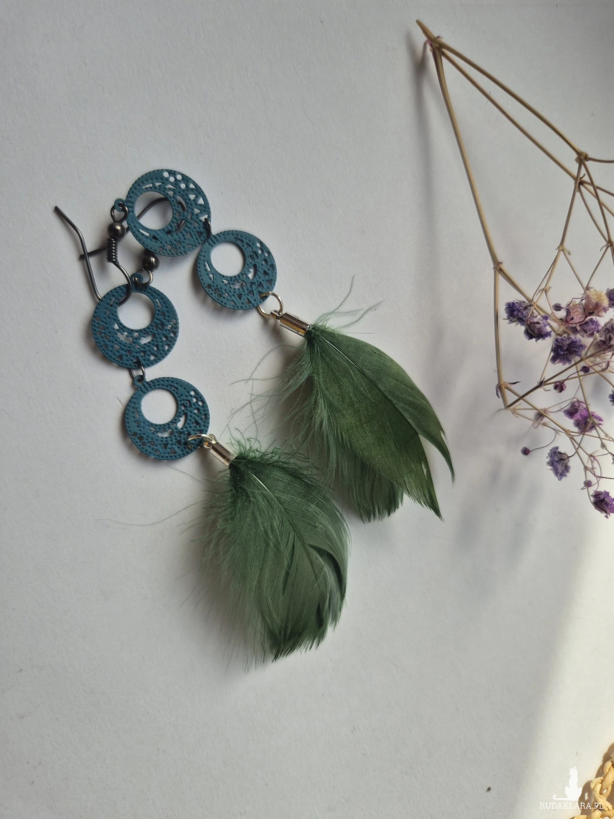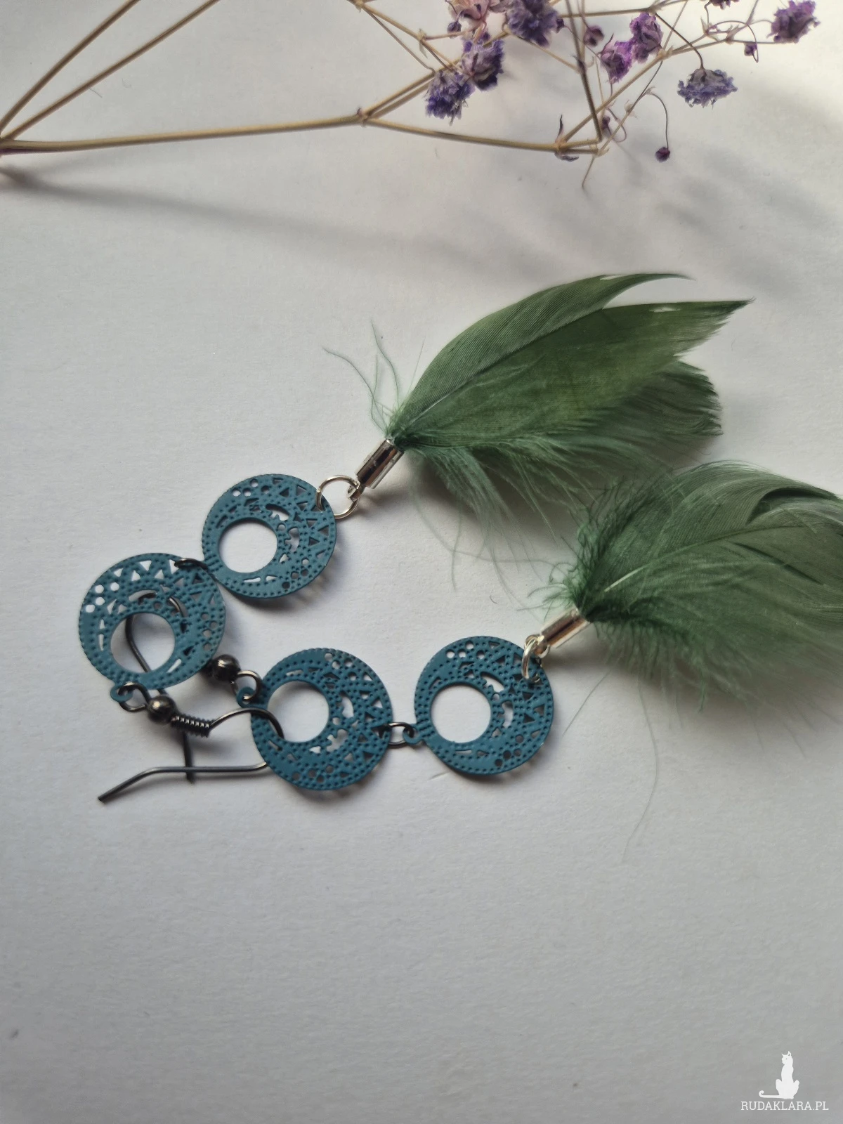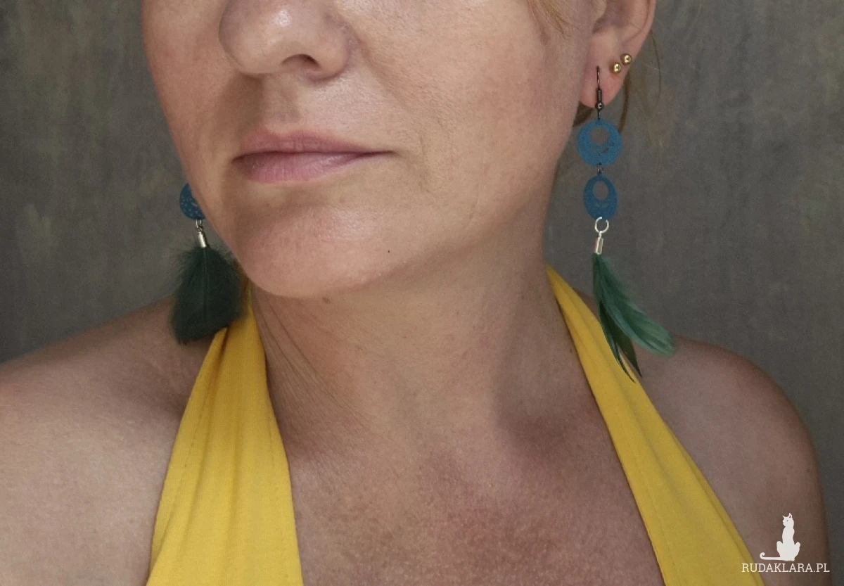 Kolczyki zielono-turkusowe pióra leciutkie zwracają uwagę robione ręcznie