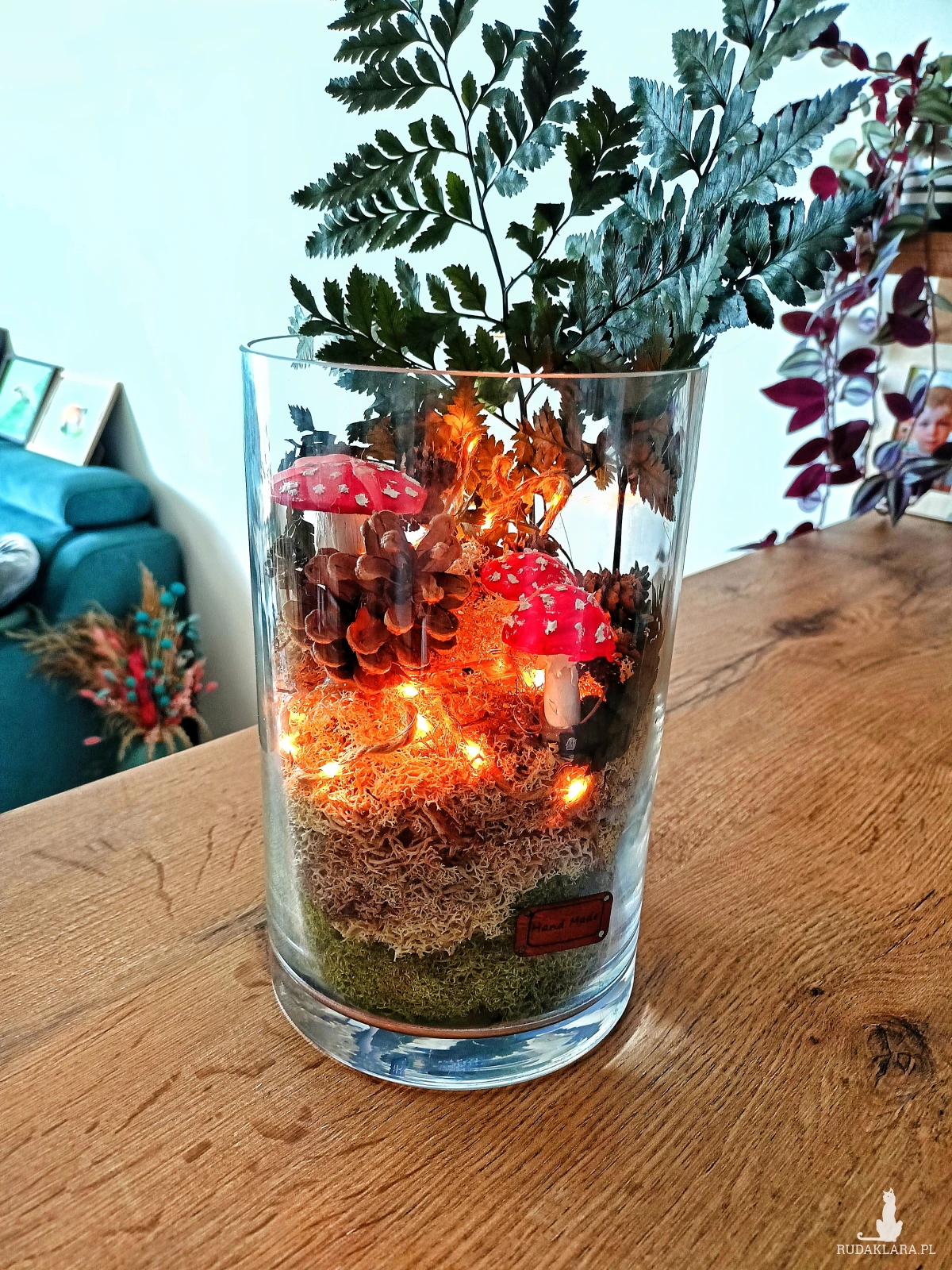 Wprowadź do swojego wnętrza odrobinę magii lasu dzięki tej ręcznie wykonanej kompozycji, która łączy naturalne piękno suszonych i stabilizowanych roślin z nastrojowym światłem imitującym świetliki.