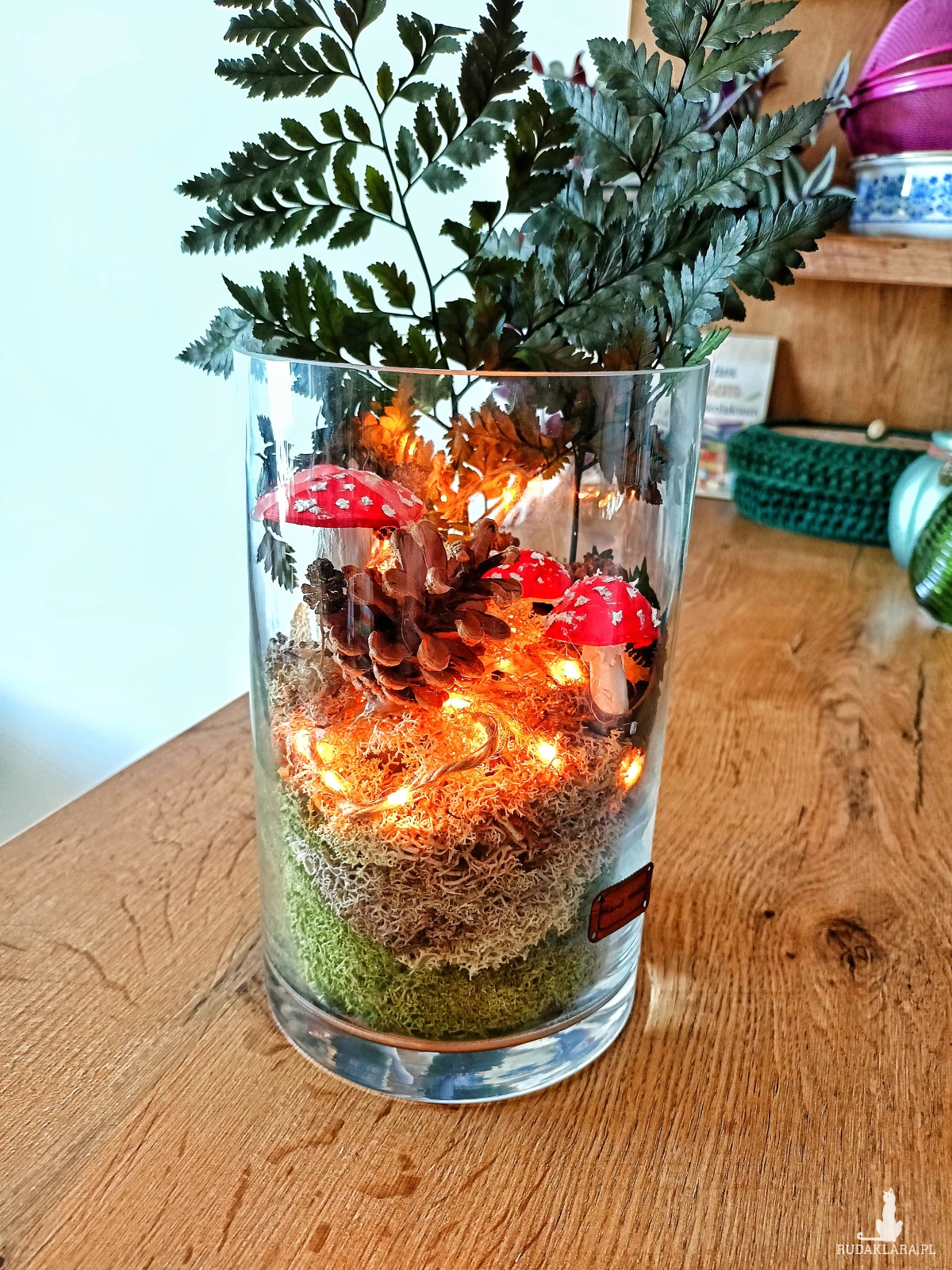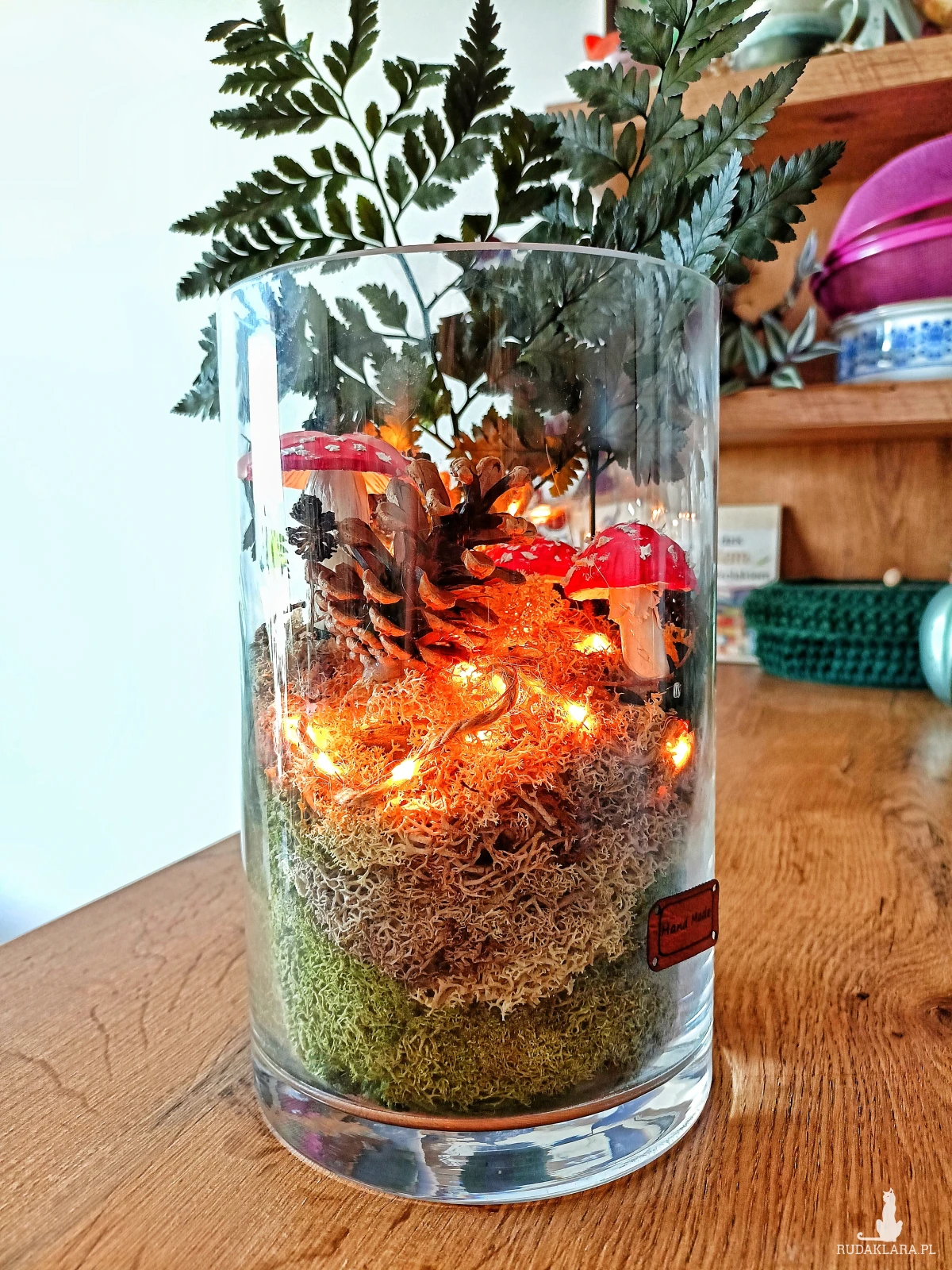 kompozycja las w szkle • las świetlików LED • dekoracja z chrobotka • mech stabilizowany • dekoracja leśna • las w słoju podświetlany • ozdoba w szkle bez podlewania • dekoracja boho rustykalna • rękodzieło • prezent dla miłośnika lasu • lampki LED w słoju • muchomory ręcznie robione