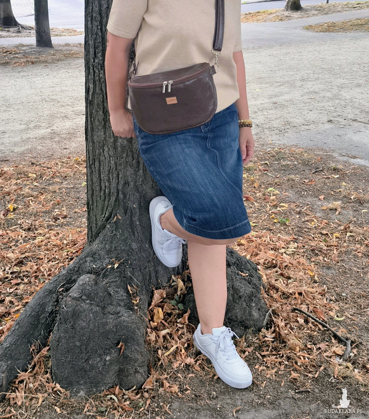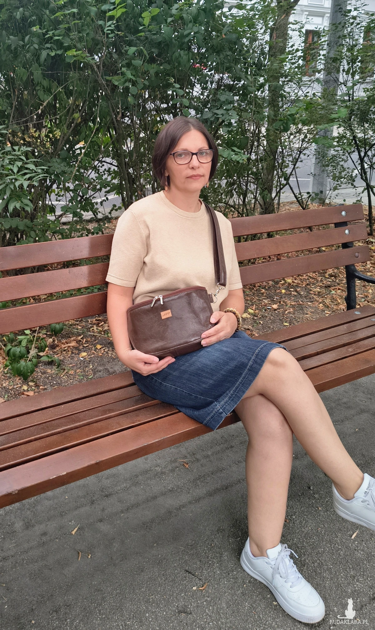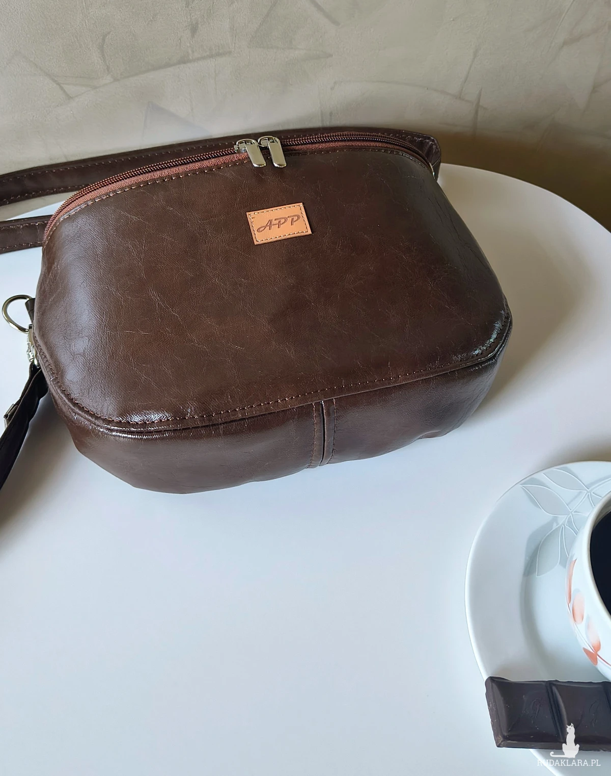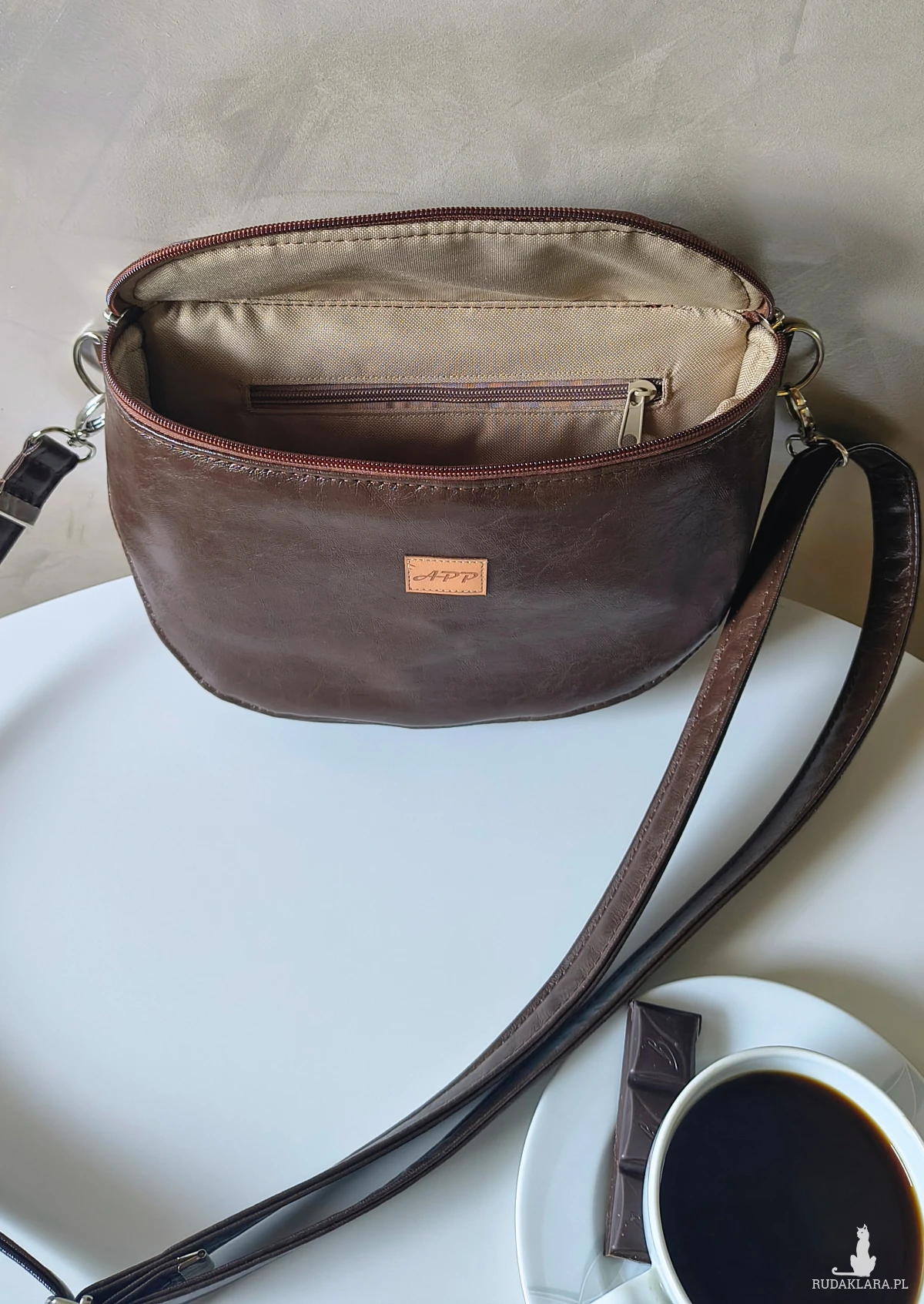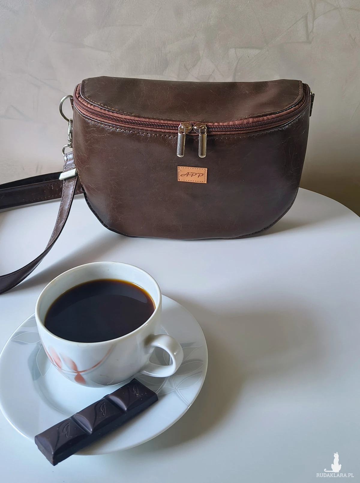 Jest to bardzo wygodna torebka, którą możemy nosić tradycyjnie na długim pasku lub na krótszym ze skosa, jak nerkę. Dzięki szerokiemu dnu jest dużo bardziej pojemna od tradycyjnej nerki. Wersja klasyczna. Do jej wykonania użyłam ekoskóry w kolorze czekolady. Jest ona odrobinę błyszcząca. Będzie pasować do stylu casual jak i do bardziej eleganckich stylizacji