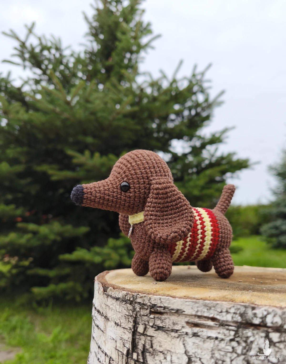 - Jamnik ma pasiasty sweterek, kolorystyka - nasączony czerwony i jasny żółty.
