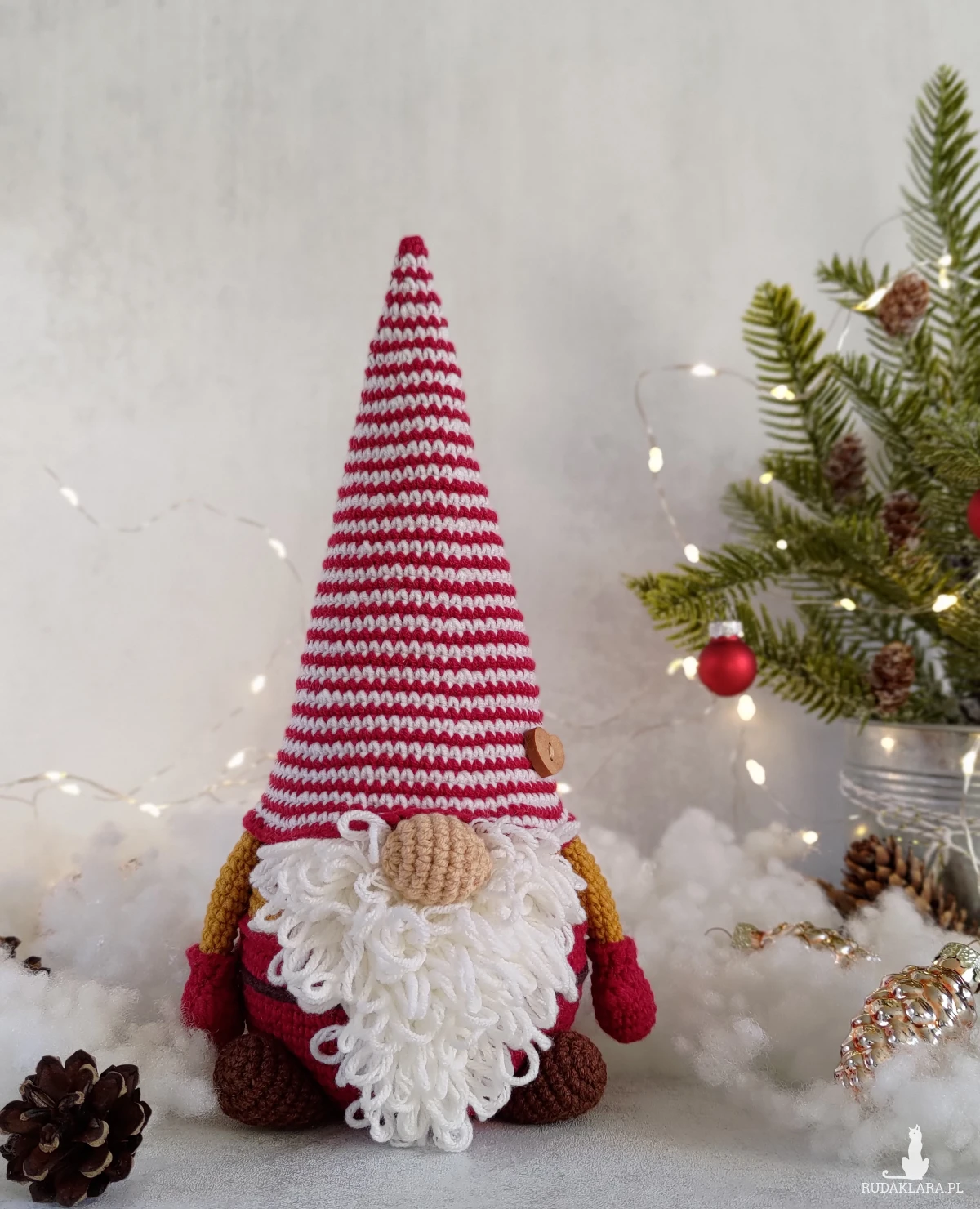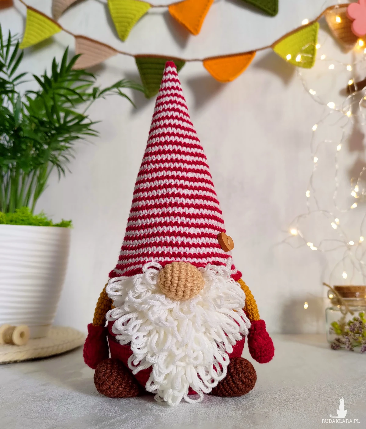 - Krasnal jest wykonany z włóczki półbawełnianej w kolorze winnym z musztardową bluzką.