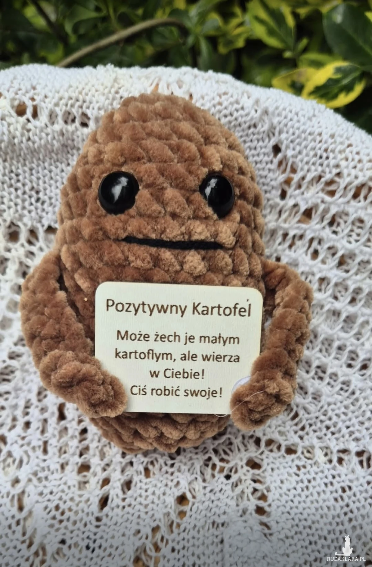 Pluszowy PlPozytywny Kartofel.Wykonany na szydelku z wloczki pluszowej,wypelniony kulką silikonową.Wysokosc okolo 10cm.