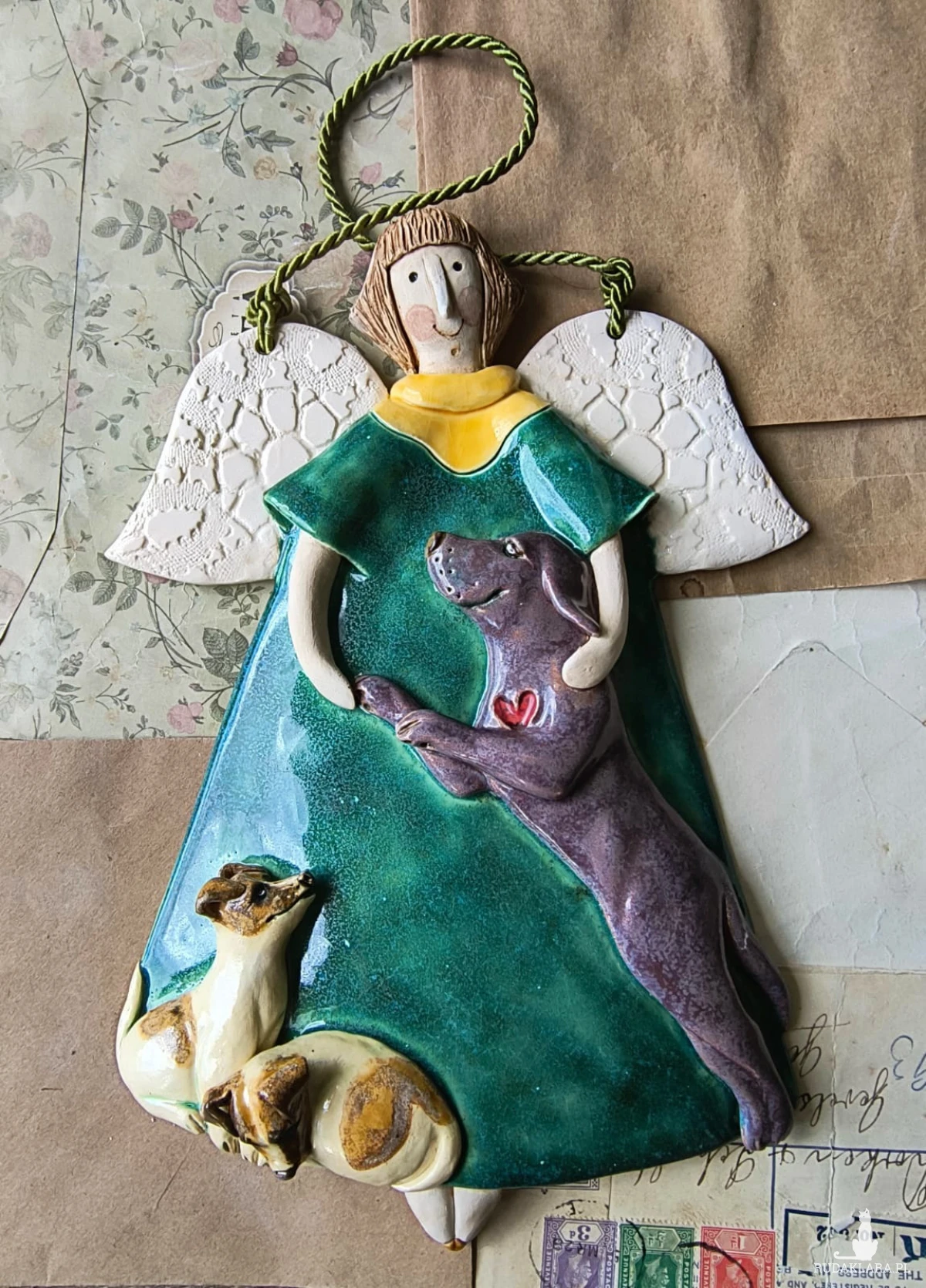 Uroczy aniołek ceramiczny wykonany z gliny szamotowej, wypalony na biskwit, a następnie szkliwiony w temperaturze 1260 stopni C. Wymiary ok 18,5 cm x 24,5 cm. Do powieszenia na ścianie na ozdobnym sznureczku. Idealny jako prezent okolicznościowy lub do ozdoby domu.