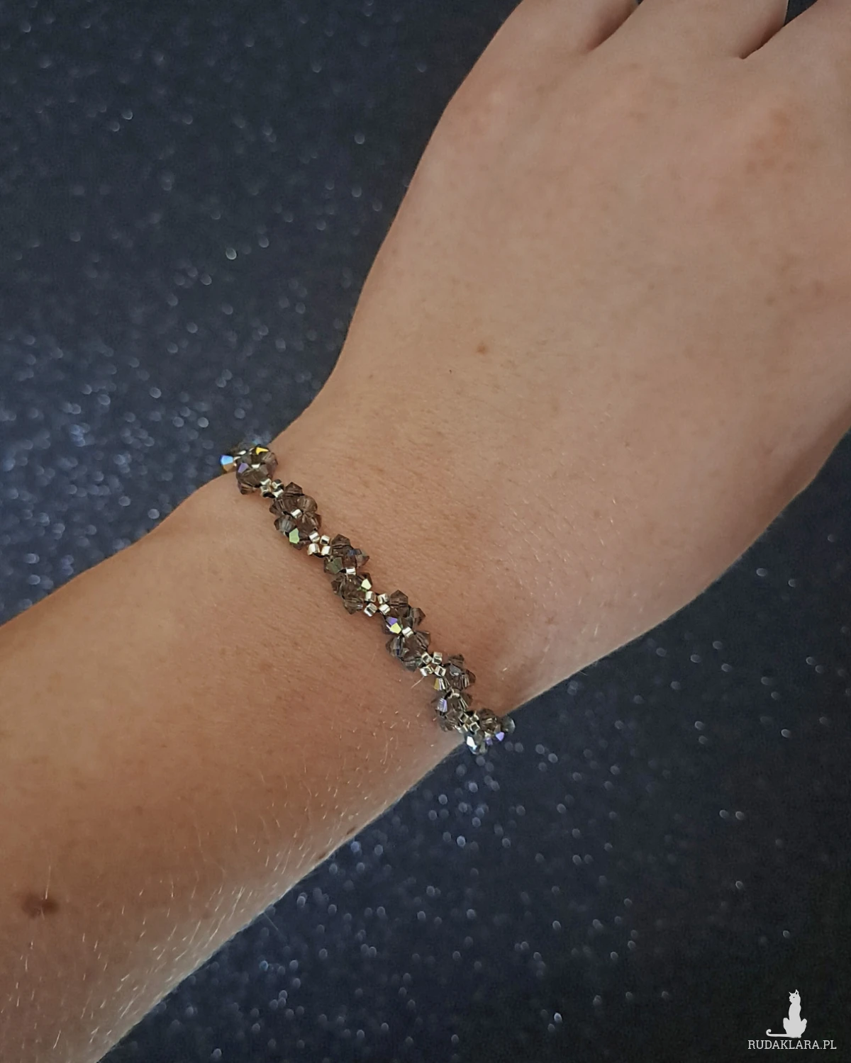 Każdy element tej bransoletki został zapleciony ręcznie z dbałością o detale. Wykonana z kryształków Preciosa w odcieniu Black Diamond w rozmiarze 3 mm, srebrnych koralików Miyuki Delica i trwałych, hipoalergicznych elementów ze stali nierdzewnej. Grubość bransoletki to ok. 0,7 cm, a dostępny rozmiar pasuje na nadgarstek 14,5–16,5 cm.
