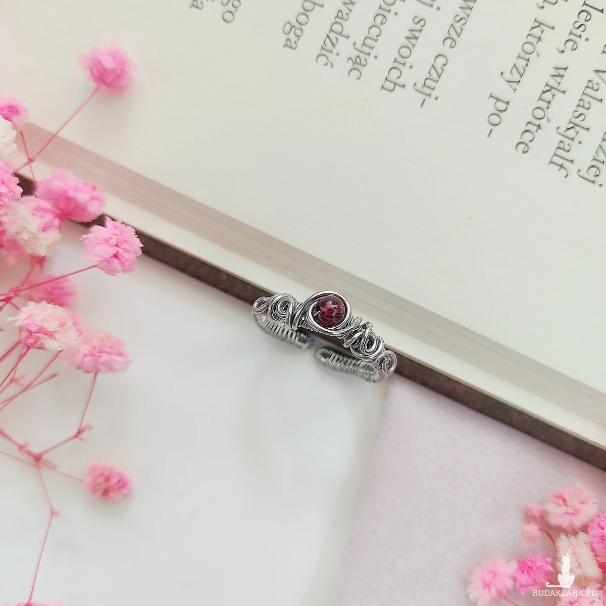 Pierścionek Granat ręcznie robiony. Wykonany techniką wire wrapping z drutów ze stali chirurgicznej.