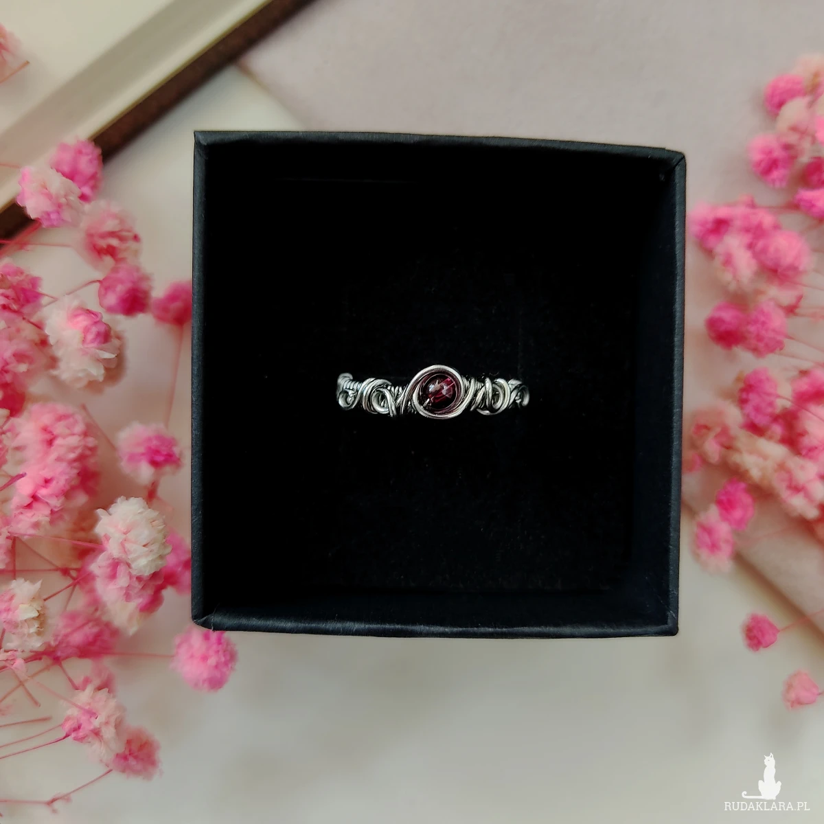 Baza pierścionka została stworzona z wysokiej jakości stali chirurgicznej, która jest odporna na korozję, nie odbarwia się i jest bezpieczna dla skóry wrażliwej. Dzięki temu pierścionek może być noszony codziennie, bez obaw o utratę blasku czy uszkodzenie. Stal chirurgiczna w połączeniu z techniką wire wrapping pozwala na stworzenie misternych splotów, które nie tylko pięknie oprawiają granat, ale także nadają całej kompozycji wyjątkowego charakteru.