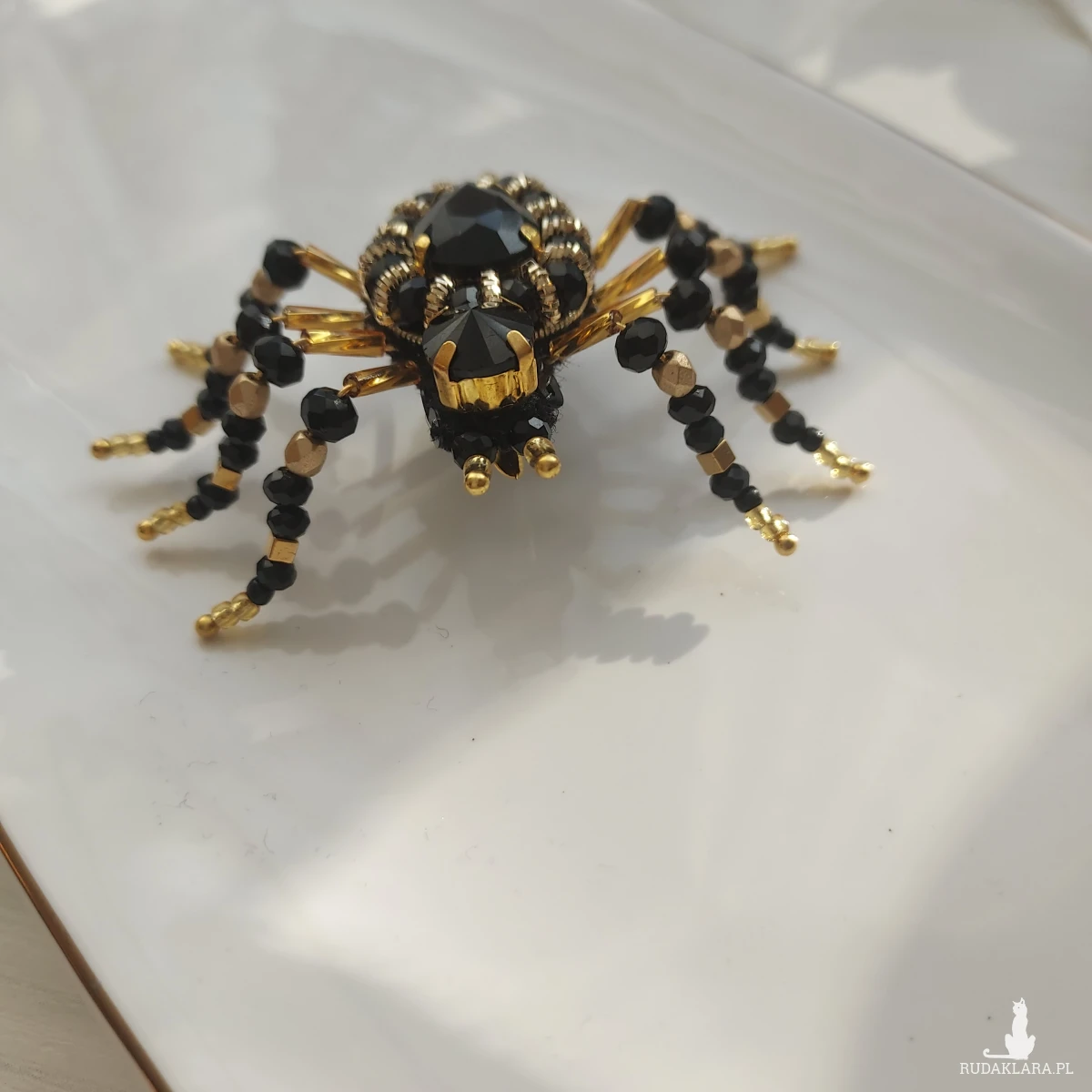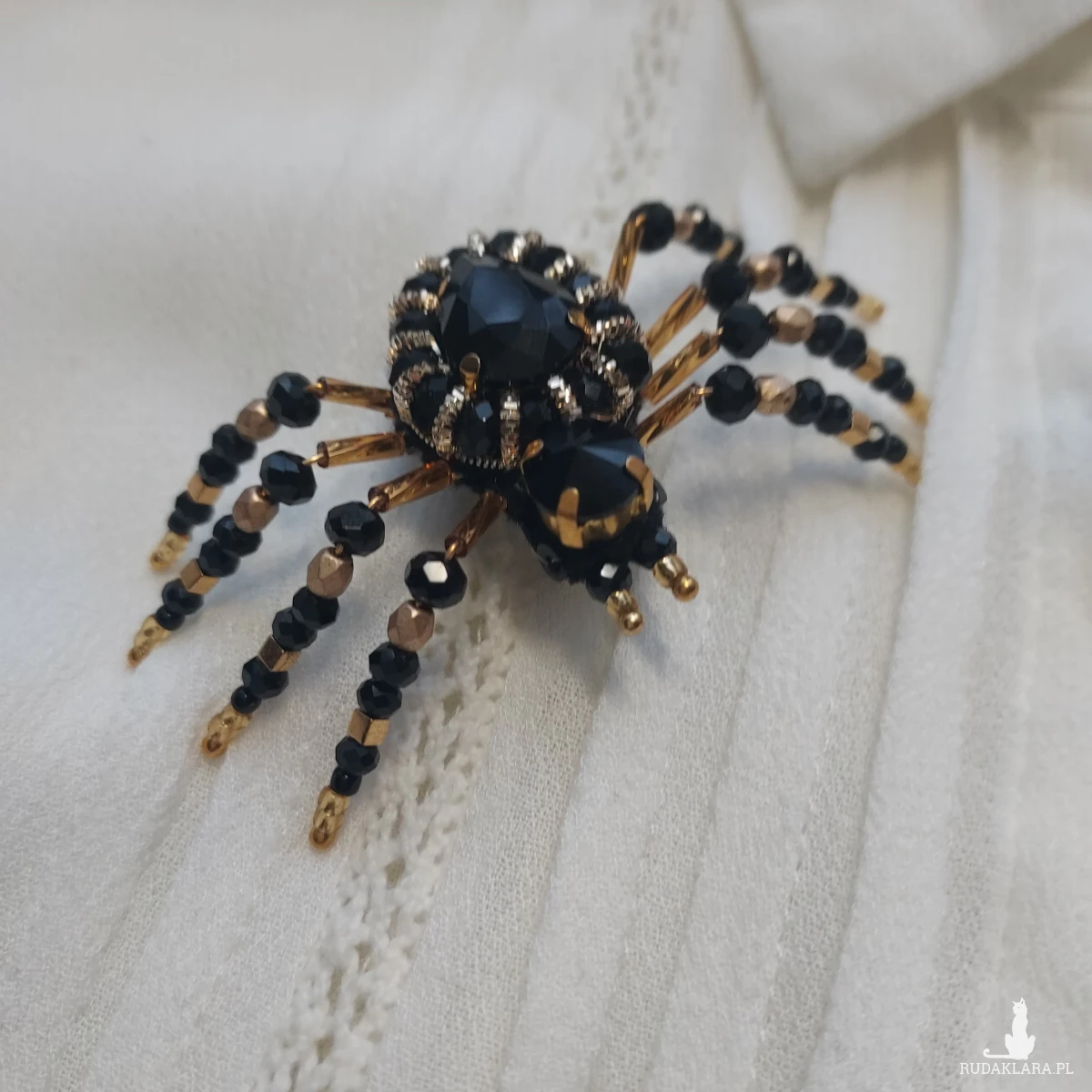 Broszka PAJĄK w kolorze złotym oraz czarnym przyciąga uwagę orginalnym wyglądem, niepowtarzalnym blaskiem kryształków.