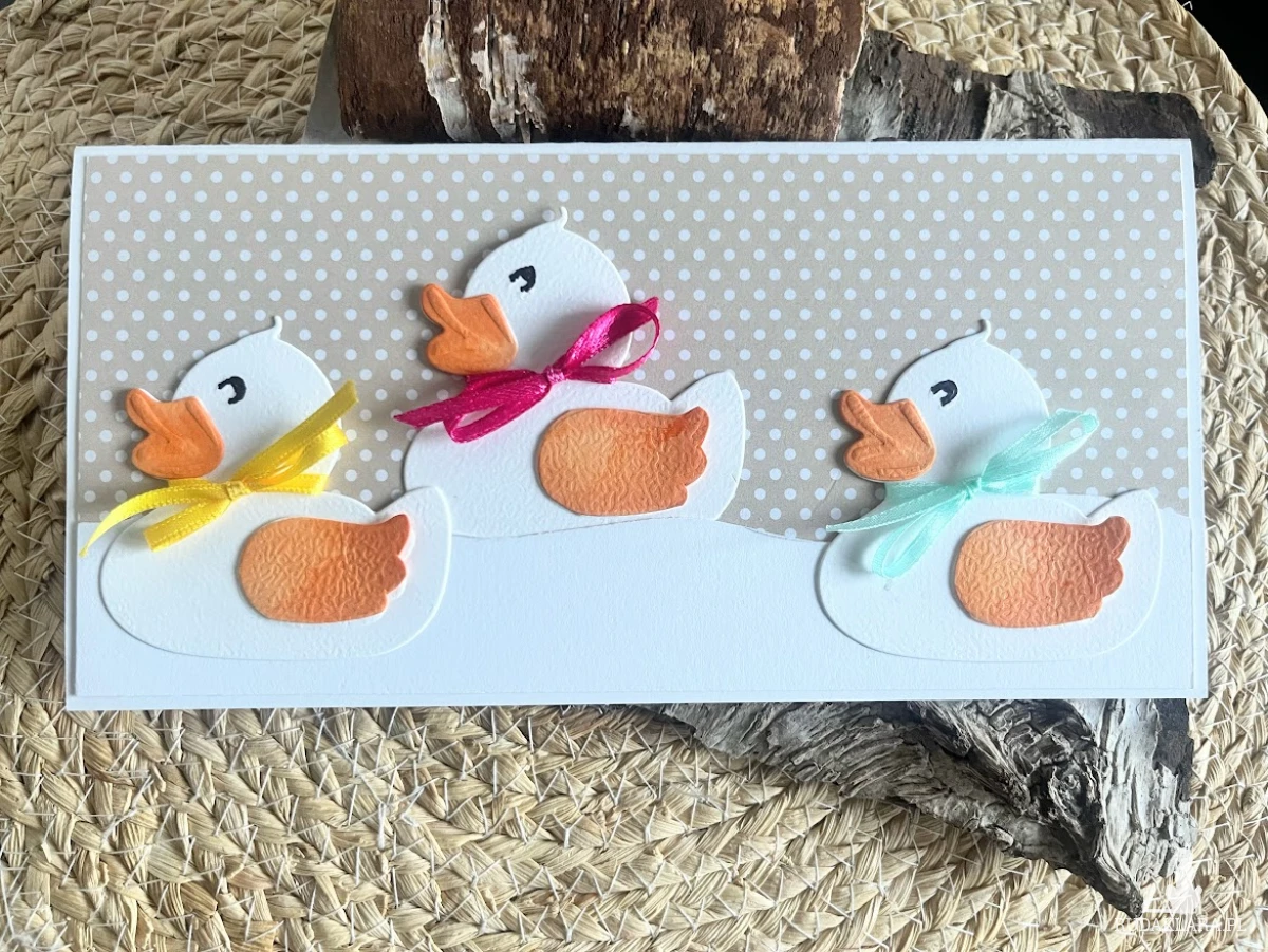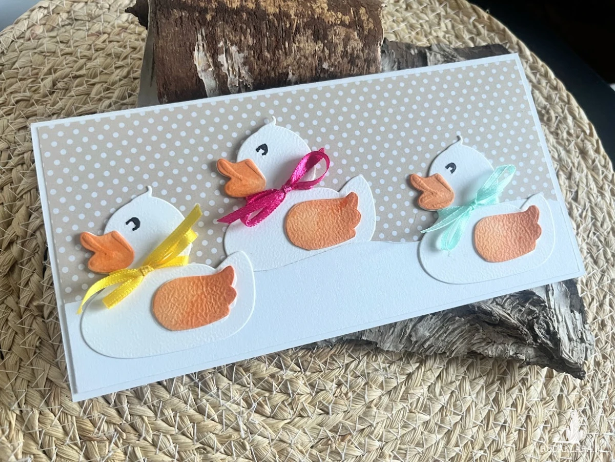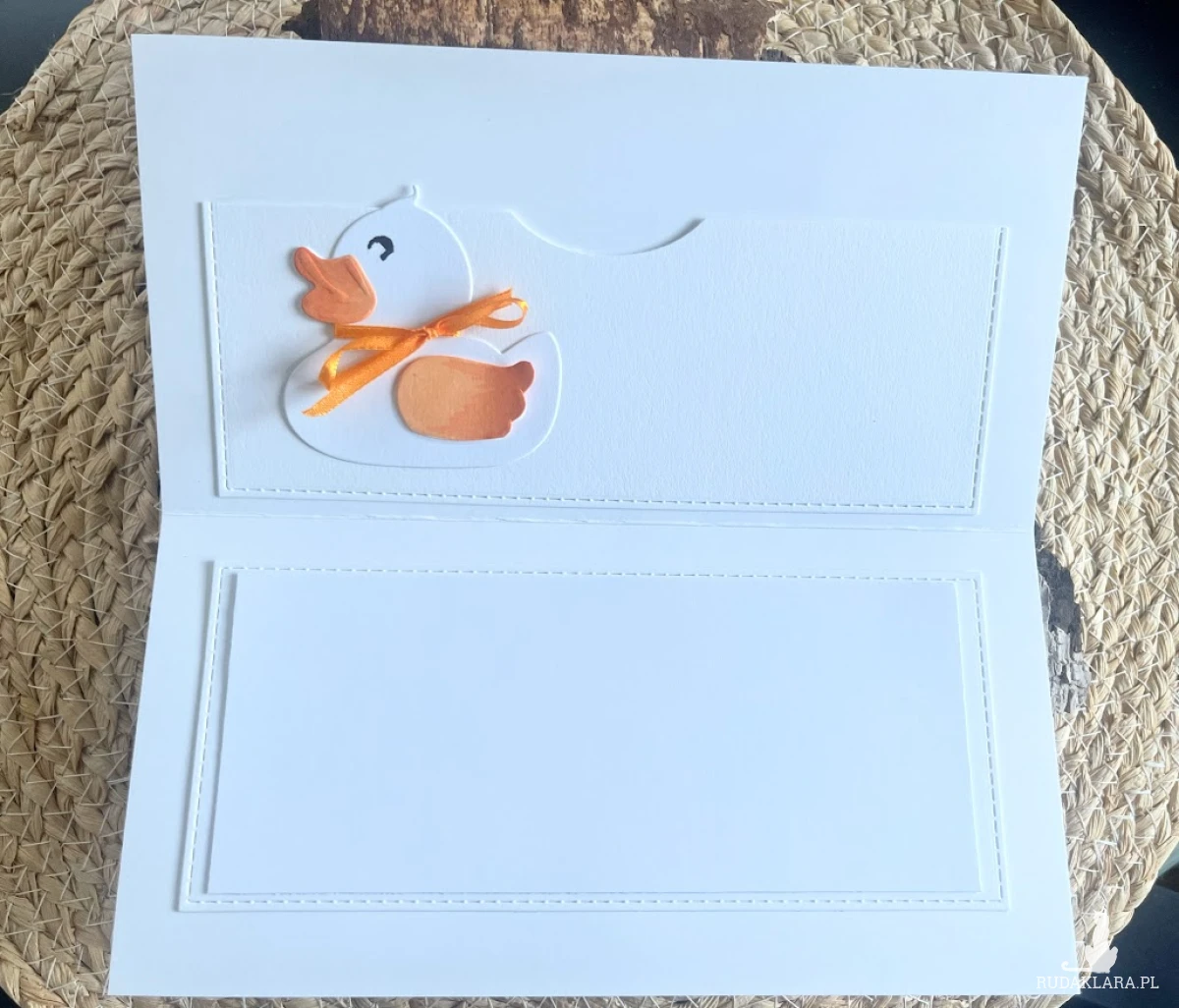 Niepowtarzalna kartka z okazji narodzin/ roczku dla dziecka z uroczymi kaczuszkami.Wykonana z wysokiej jakości papierów do scrapbookingu,umiarkowanie zdobiona. Wykonana na białej bazie . Wielkość kartki 21x 10,5cm. Wewnątrz kartki jest umieszczona kieszonka na małe co nieco oraz jest miejsce na wypisanie własnych życzeń. Jest możliwość wydrukowania życzeń (podczas zamawiania w uwagach proszę zamieśćić życzenia , imię dziecka lub liczbę) Do kartki dołaczono kopertę o wym.22x11cm.