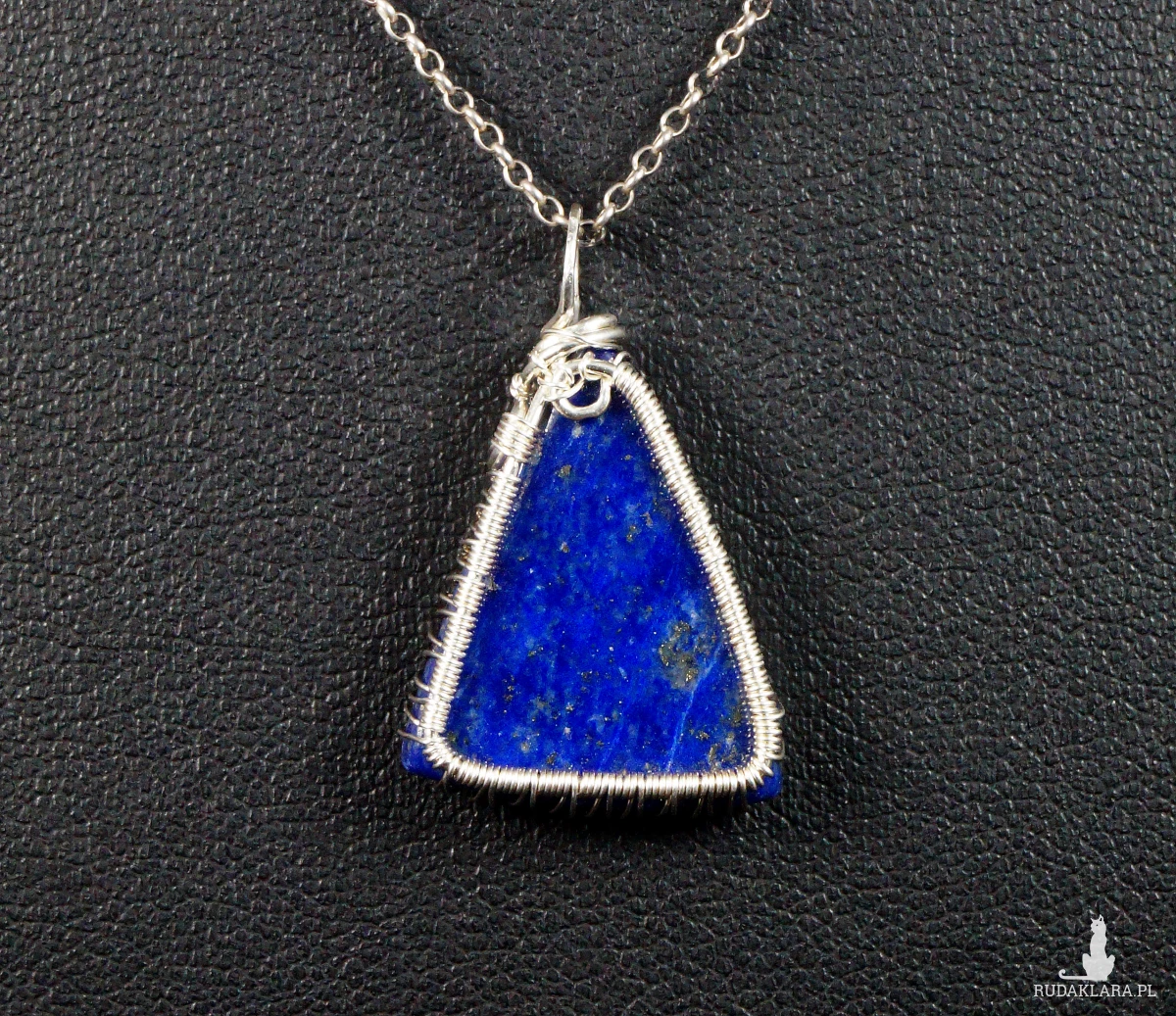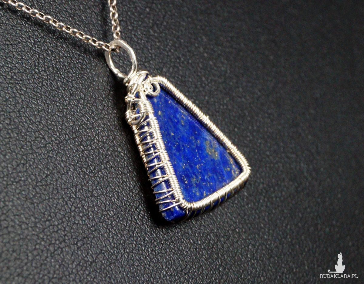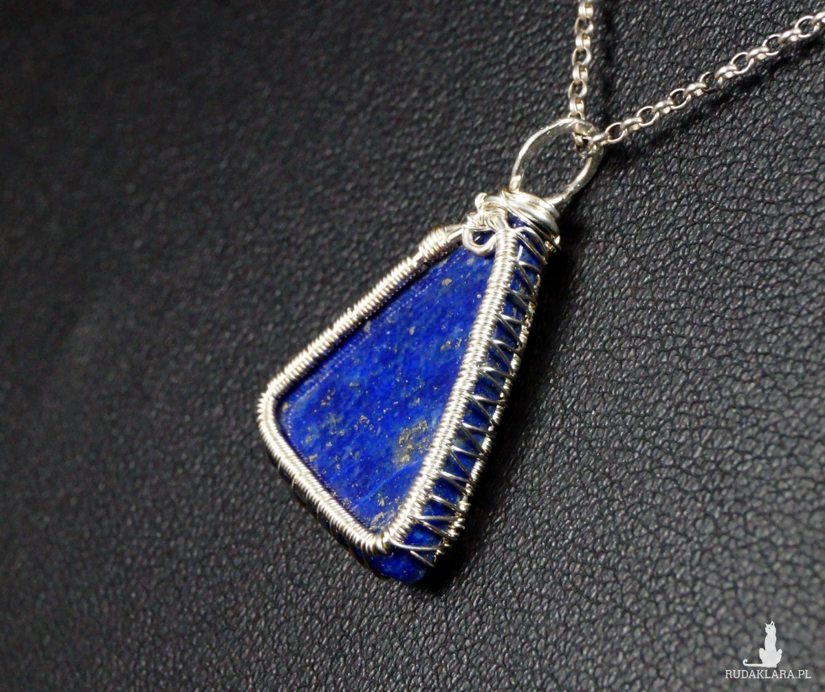 Bajeczny, misternie pleciony wisior z niebiesko złotym kaboszonem laspi lazuli. Wisior zaprojektowany i wykonany przeze mnie od podstaw bardzo pracochłonną i precyzyjną techniką wire-wrapping ze srebra próby 925, 930 oraz 999,