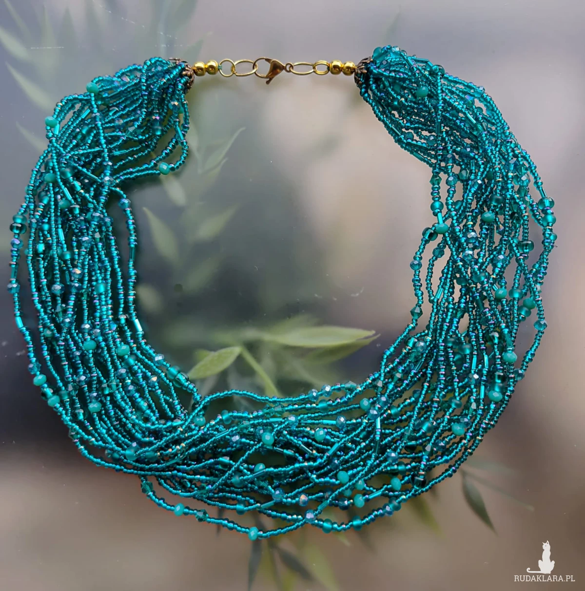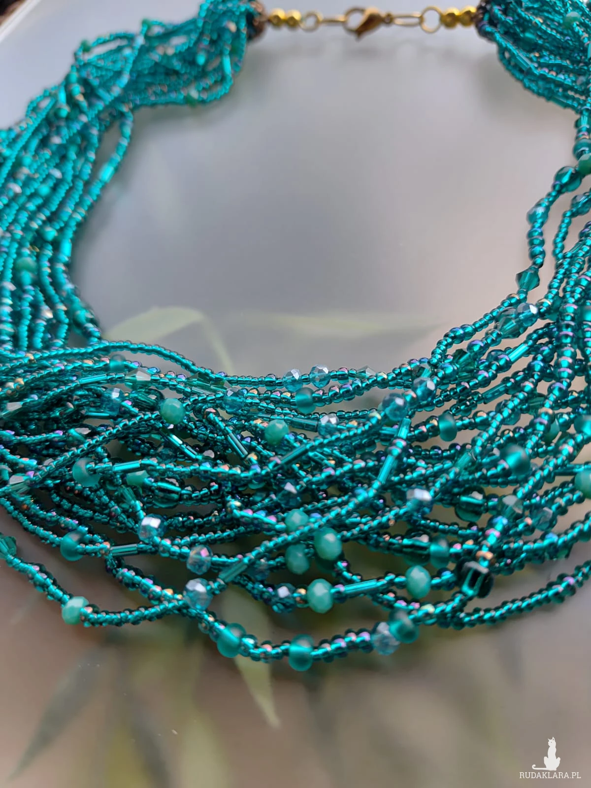 Naszyjnik w kolorze pięknej zieleni, kryształki szklane oponki szlifowane i inne koraliki szklane rurki i kuleczki 2 mm, Wykończenie w kolorze zlotym, filigranowe czapeczki i zapięcie ze stali nierdzewnej. Objętość 48 cm