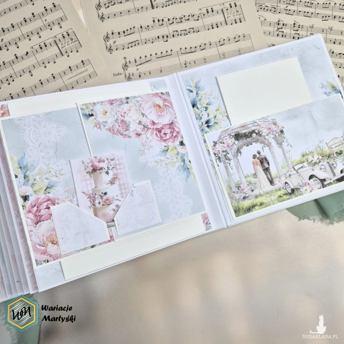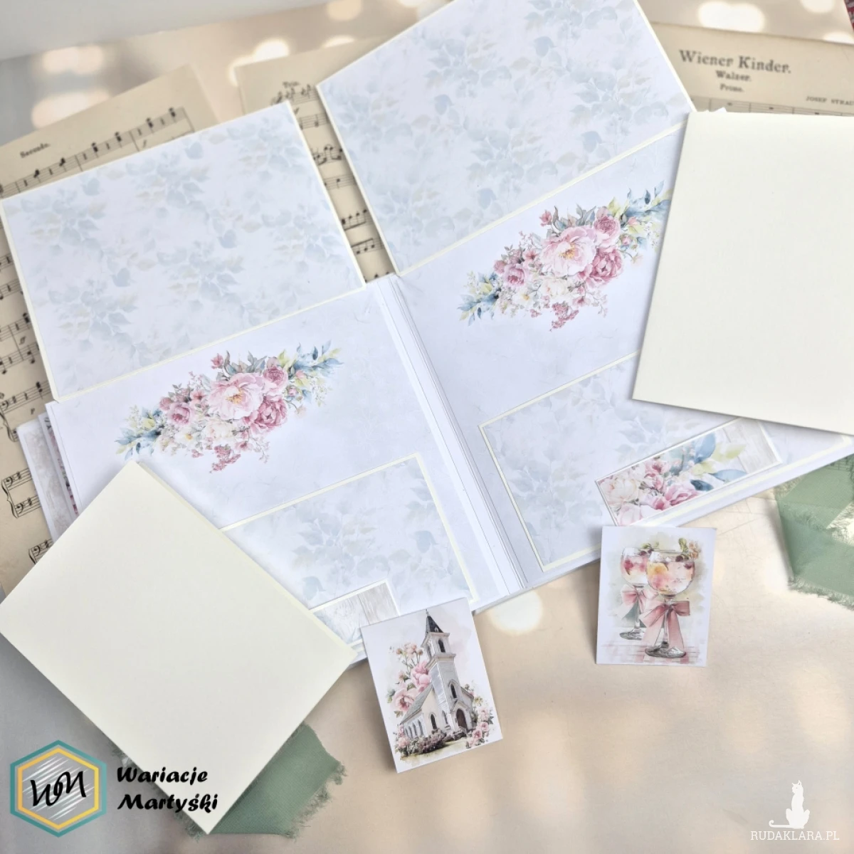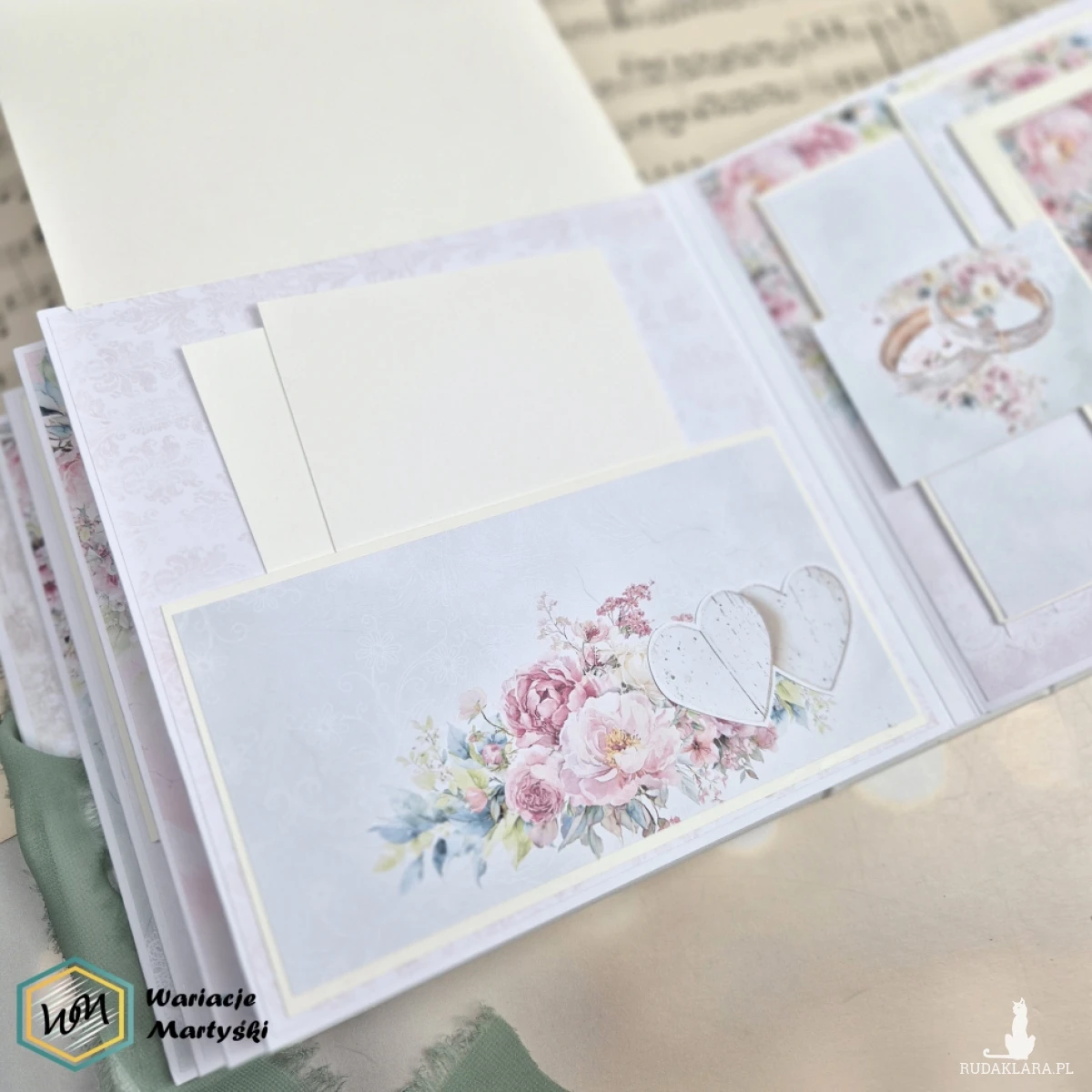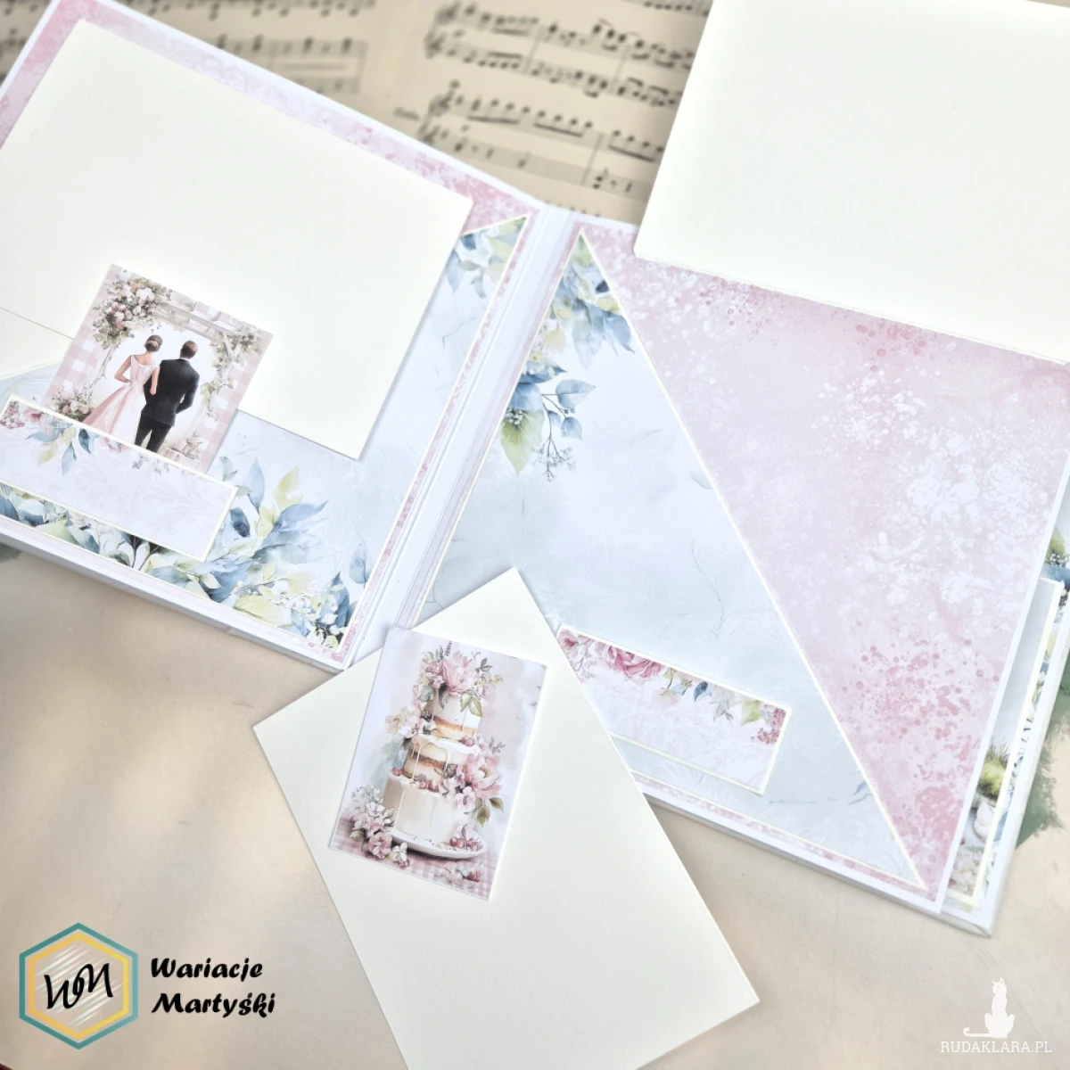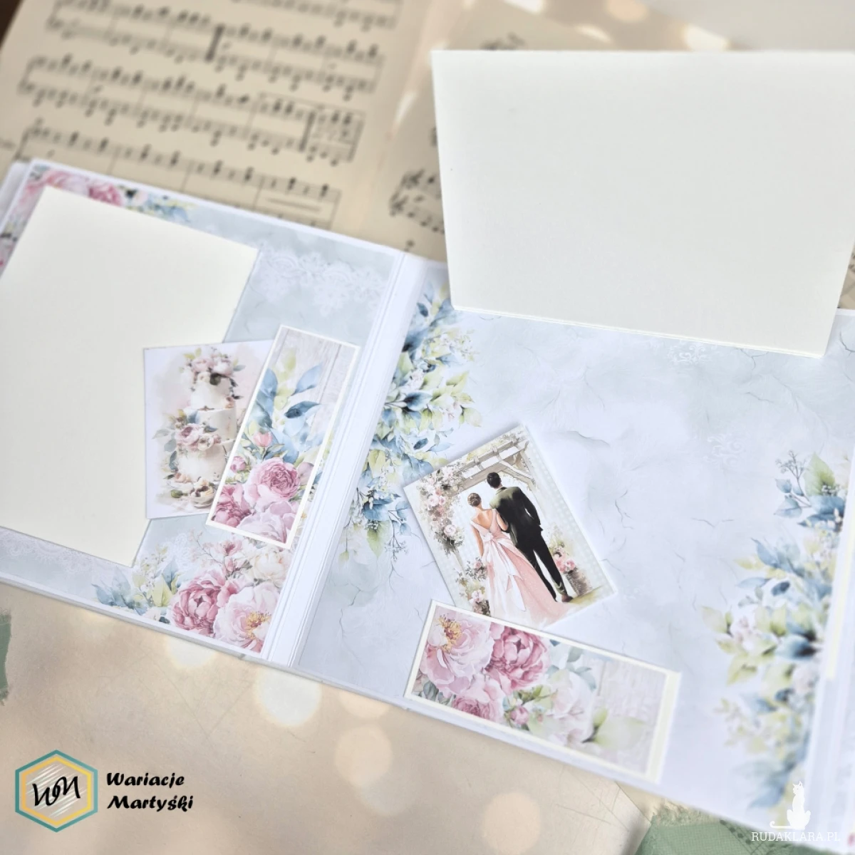 Ten album to spójna i przemyślana całość – od pierwszej strony aż po dopasowane, ręcznie ozdobione pudełko. Delikatna paleta pastelowych barw, romantyczne wzory i subtelne dodatki tworzą wyjątkową oprawę na najważniejsze wspomnienia z dnia ślubu.