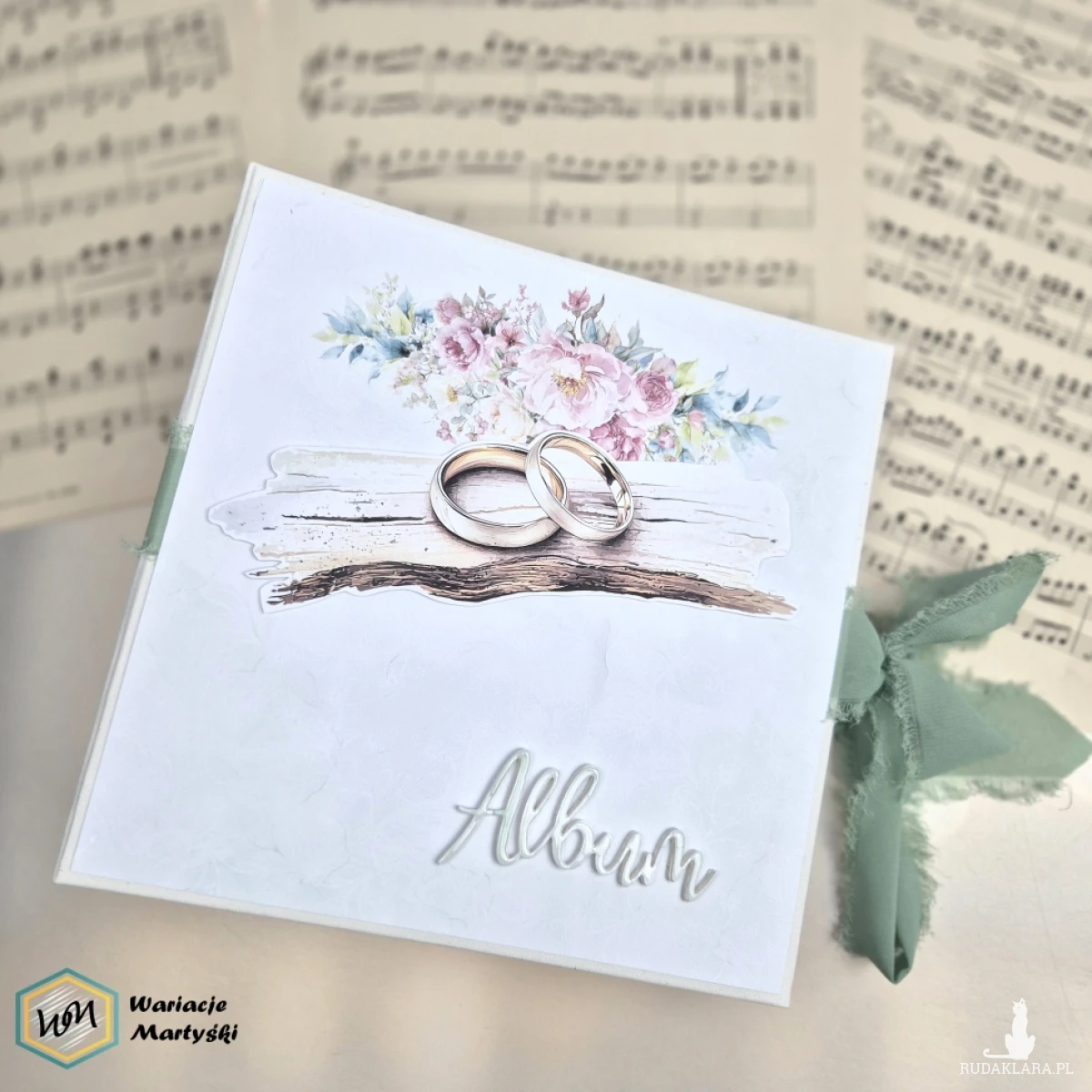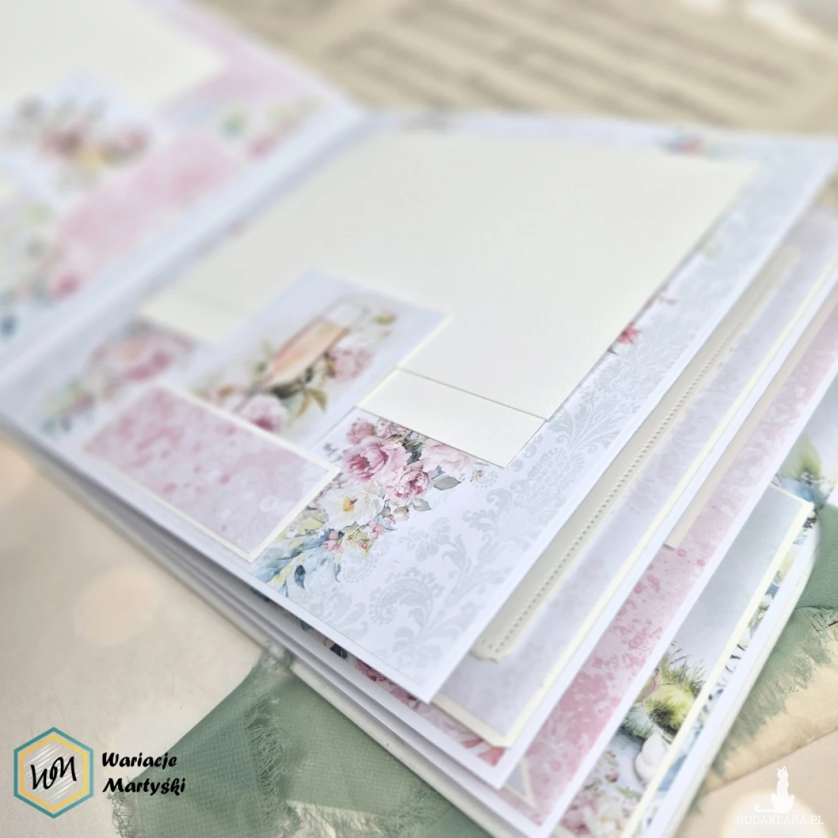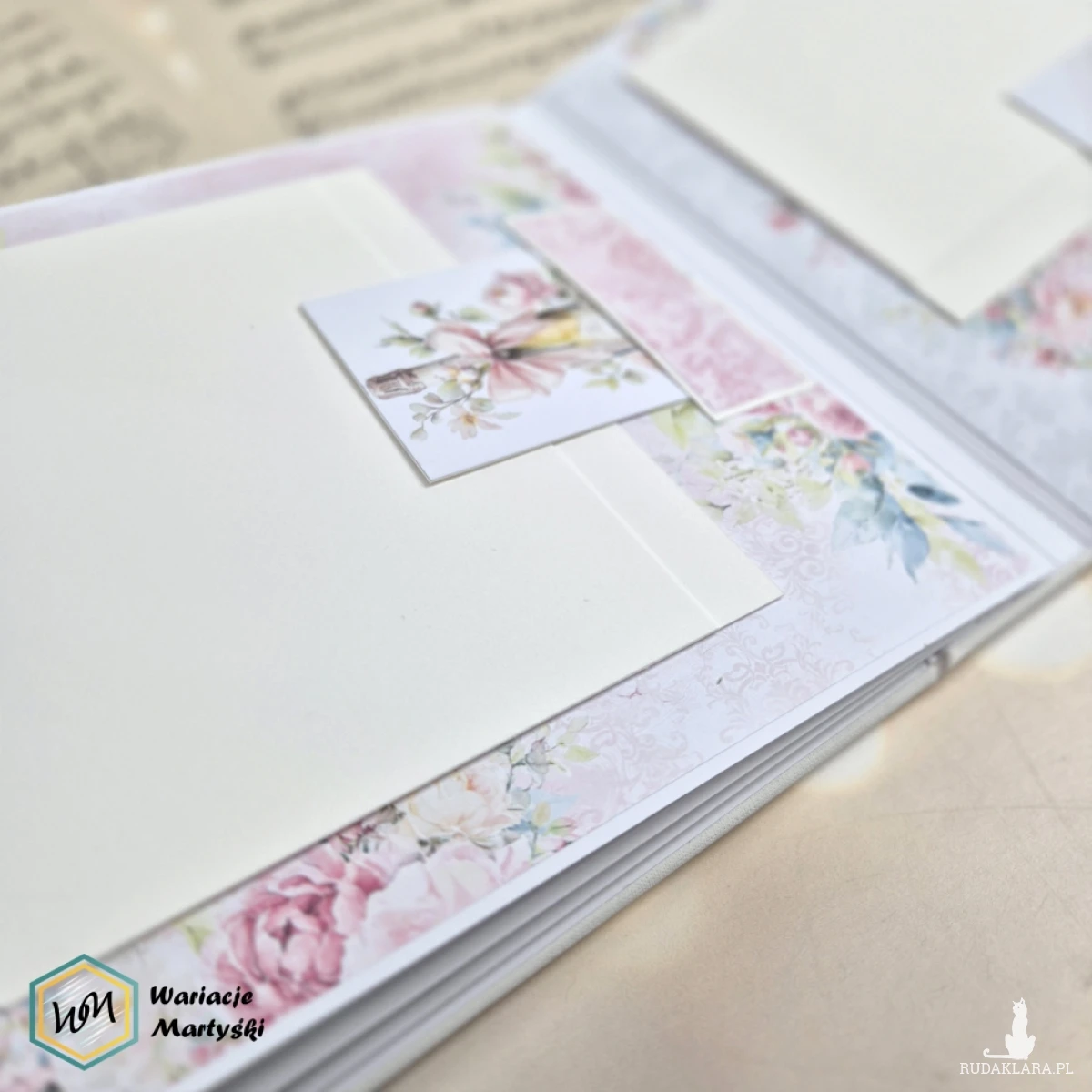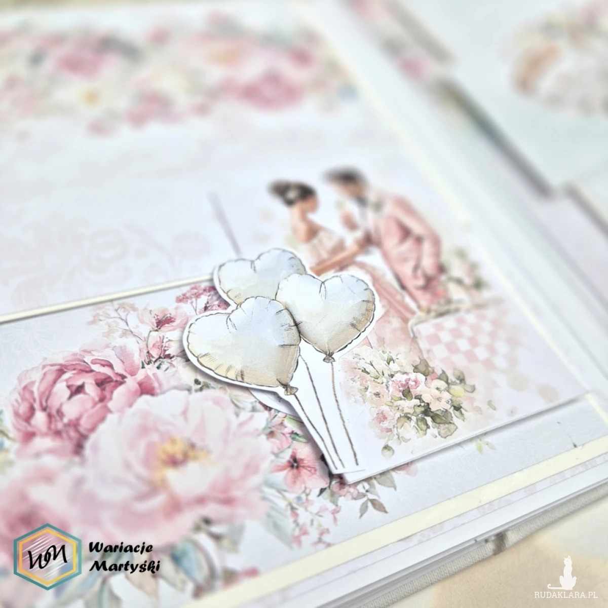 Ten album to spójna i przemyślana całość – od pierwszej strony aż po dopasowane, ręcznie ozdobione pudełko. Delikatna paleta pastelowych barw, romantyczne wzory i subtelne dodatki tworzą wyjątkową oprawę na najważniejsze wspomnienia z dnia ślubu.