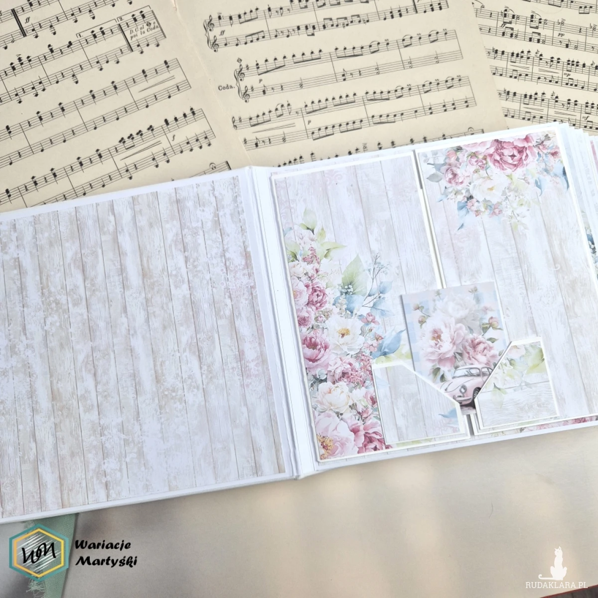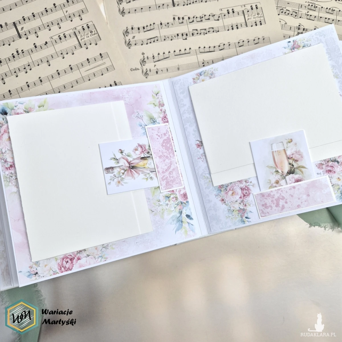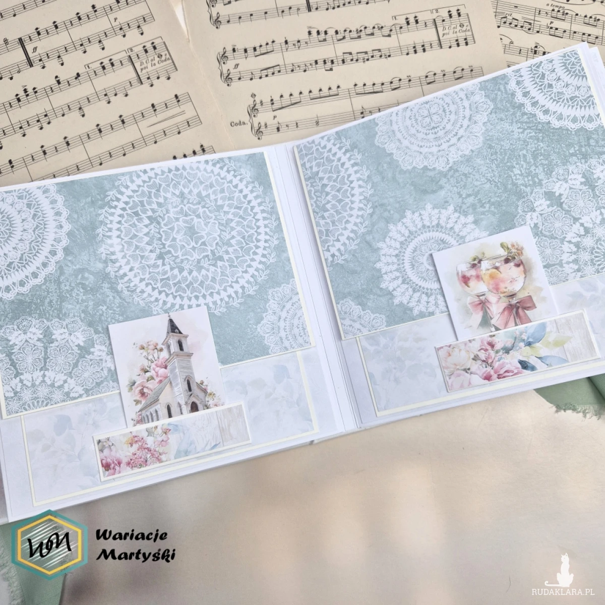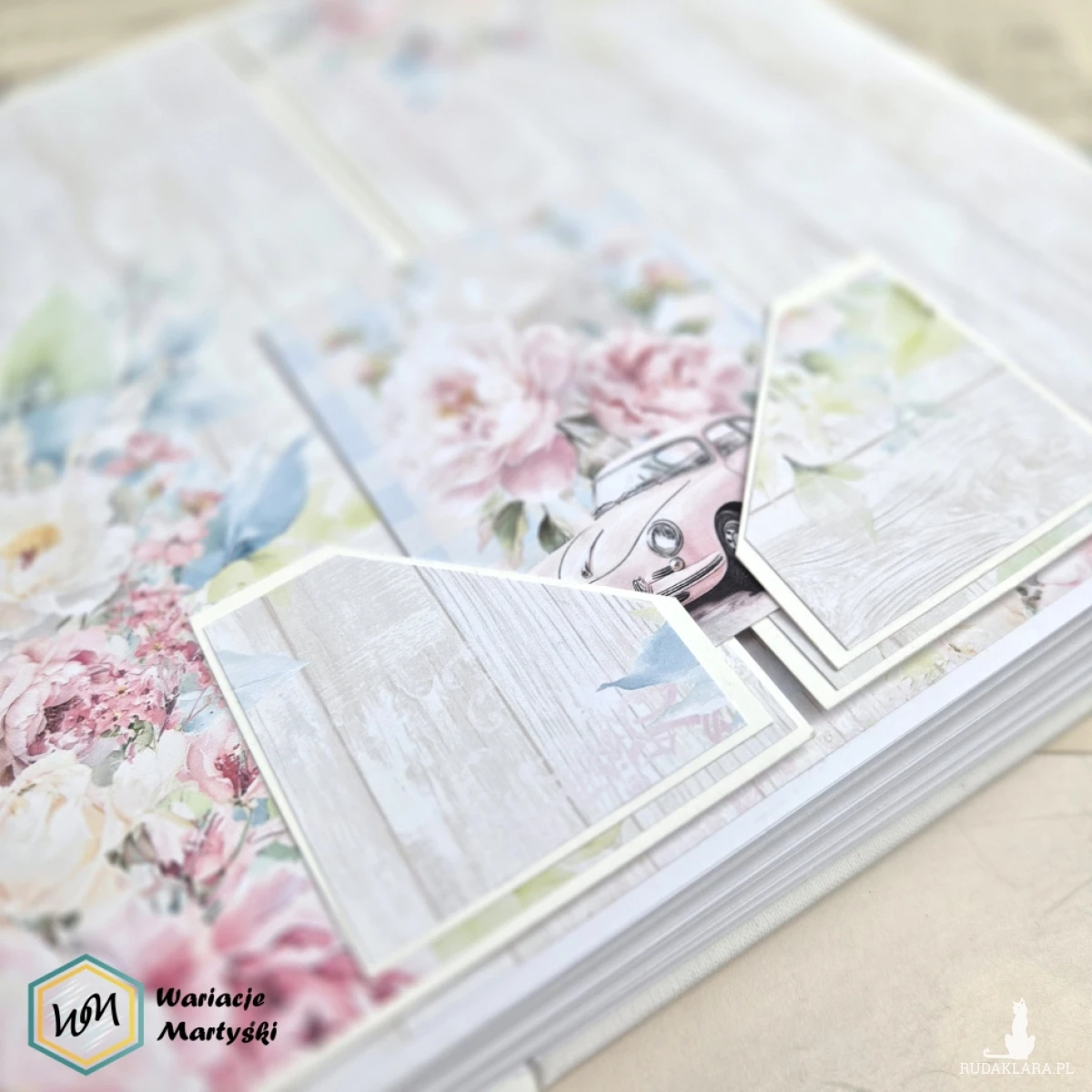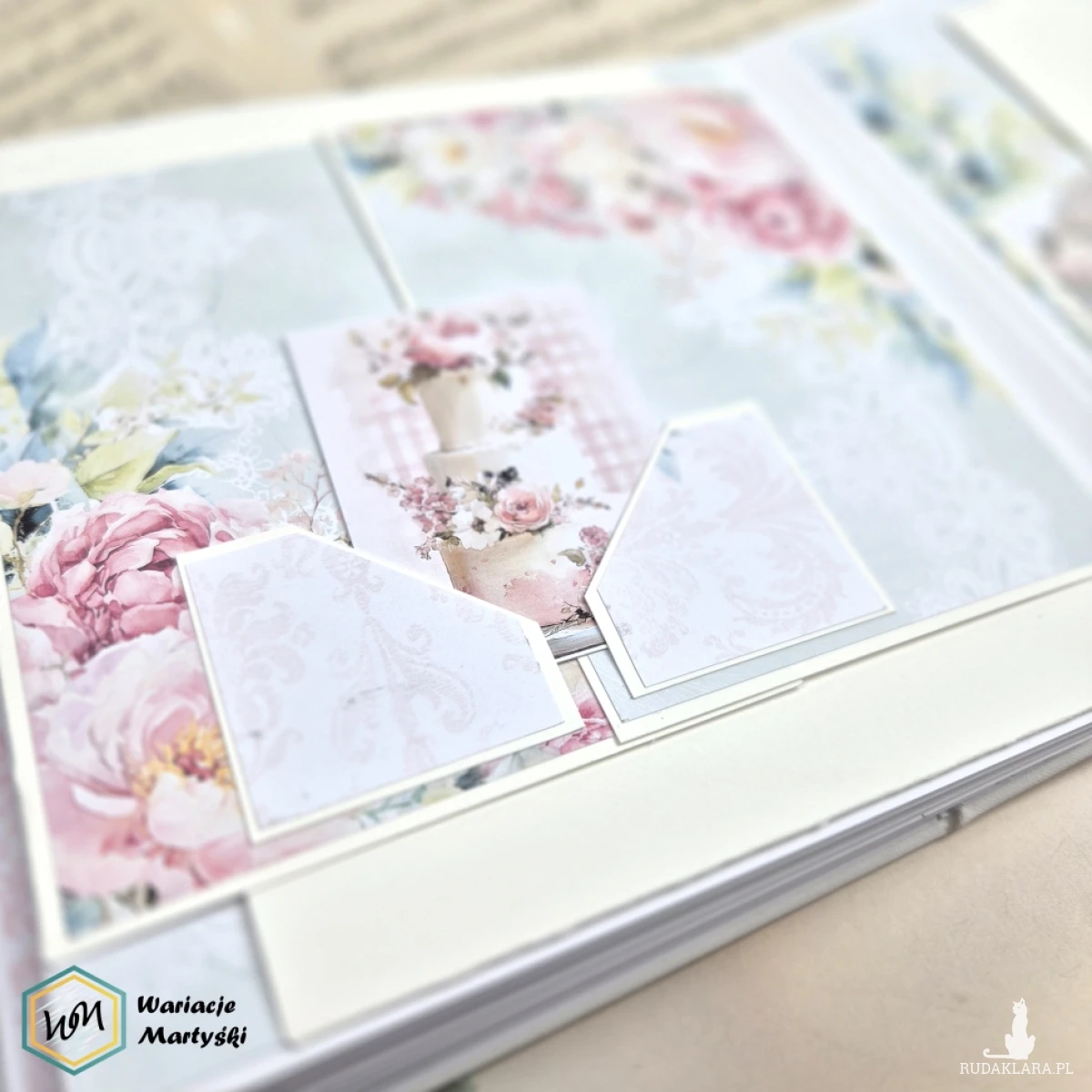 Ten album to spójna i przemyślana całość – od pierwszej strony aż po dopasowane, ręcznie ozdobione pudełko. Delikatna paleta pastelowych barw, romantyczne wzory i subtelne dodatki tworzą wyjątkową oprawę na najważniejsze wspomnienia z dnia ślubu.