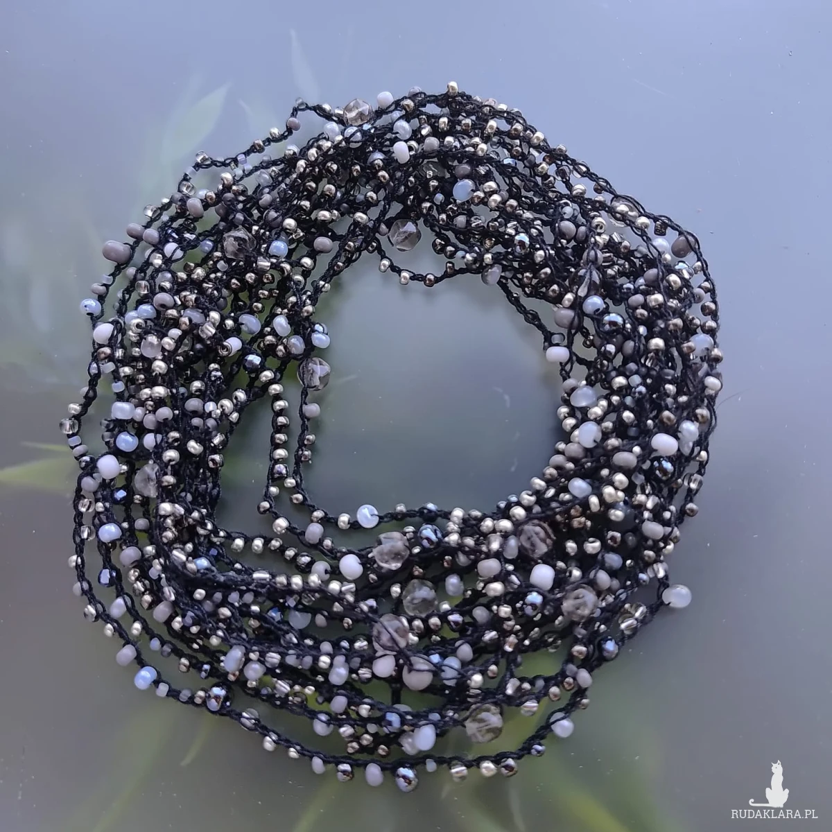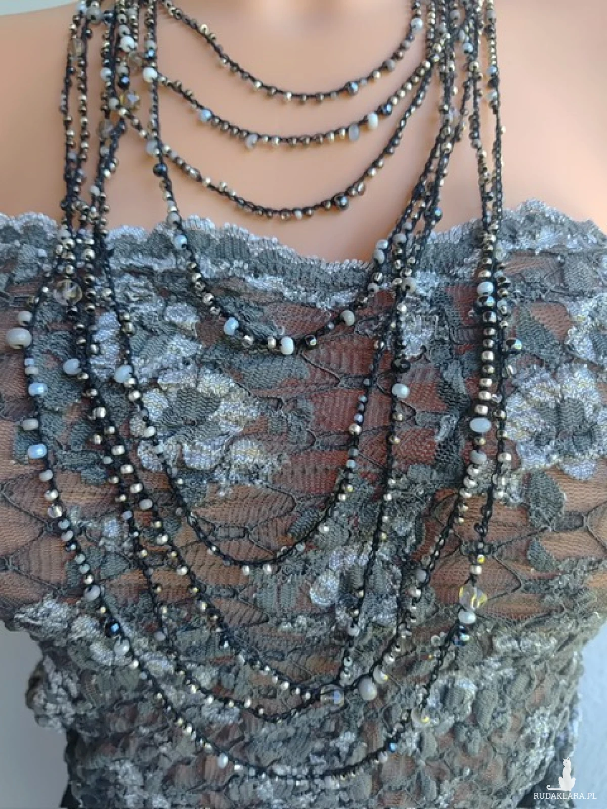 Naszyjnik, Korale długie szare, szklane różnej wielkości na bawełnianej nitce w kolorze czarnym. Cztery oddzielne sznurki bez zapięcia , które można nosić oddzielnie, można dowolnie skracać owijając dwukrotnie wokół szyi. Bardzo dobrze pasują do wielu stylizacji.