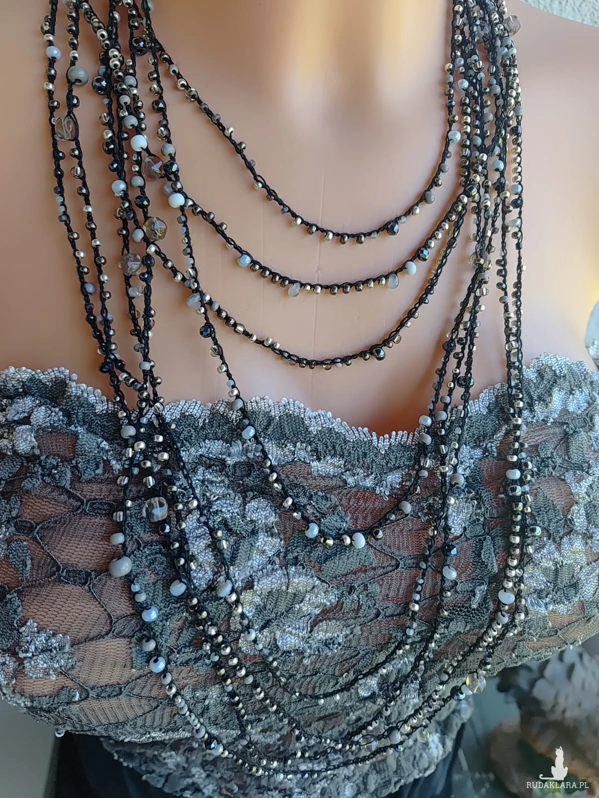 Naszyjnik Czarne Długie Korale Szare Srebrne