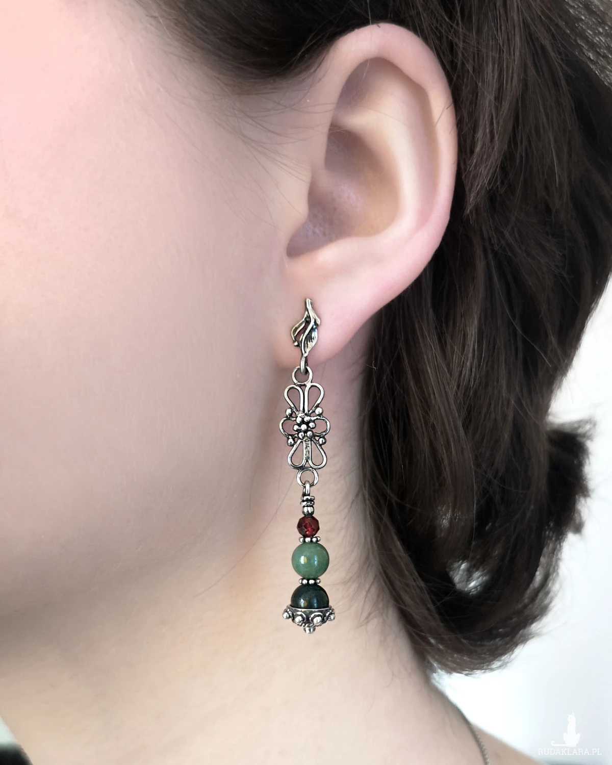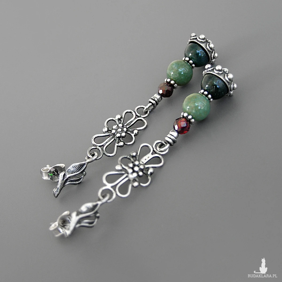 Kolczyki Scarlett, agat mszysty, granat, srebro 925, kolekcja Przeminęło z Wiatrem