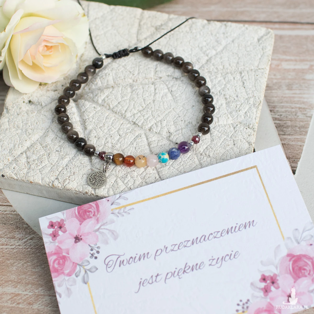 Bransoletkę wysyłam zapakowaną w ozdobny kartonik i woreczek z organzy, z dołączoną etykietą opisową.