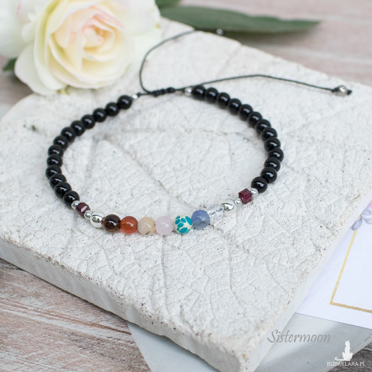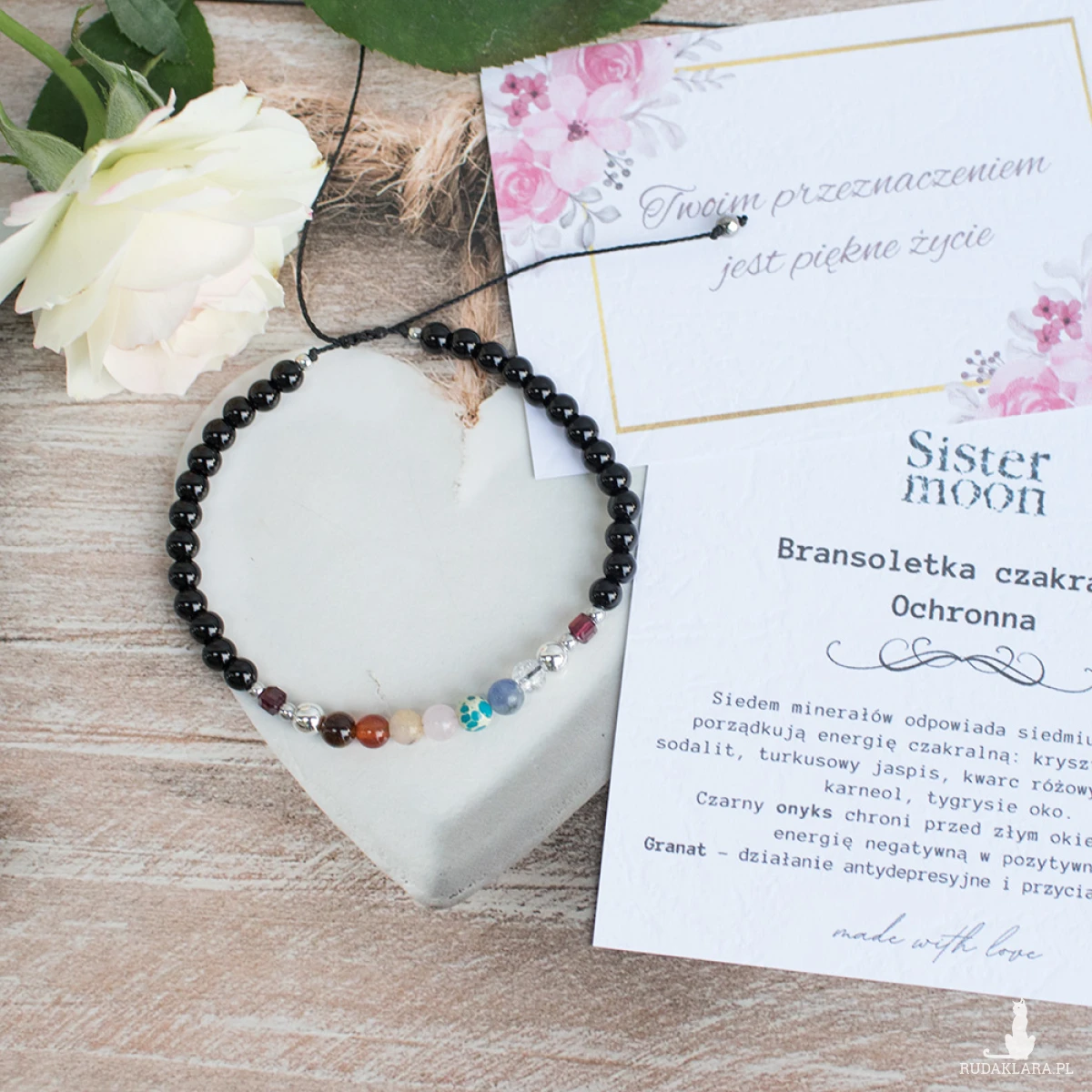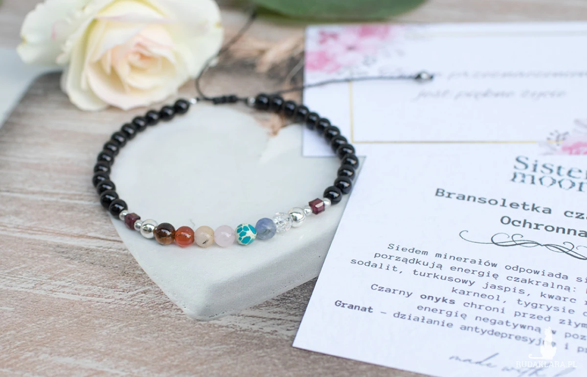 Minimalistyczna bransoletka czakralna Ochronna wykonana ręcznie ze starannie wyselekcjonowanych minerałów o średnicy 2, 3 i 4 mm. Siedem minerałów odpowiada siedmiu czakrom (kryształ górski, sodalit, turkusowy jaspis, kwarc różowy, opal żółty, karneol, tygrysie oko), ich zadaniem jest porządkowanie i harmonijny rozwój energii czakralnej. Ósmy minerał – czarny onyks, będący bazą bransoletki, odpycha negatywną energię, wzmacnia umysł i chroni psychikę. Dodatek dwóch kulek granatu dla ochrony przed depresją i przyciągania sukcesu.