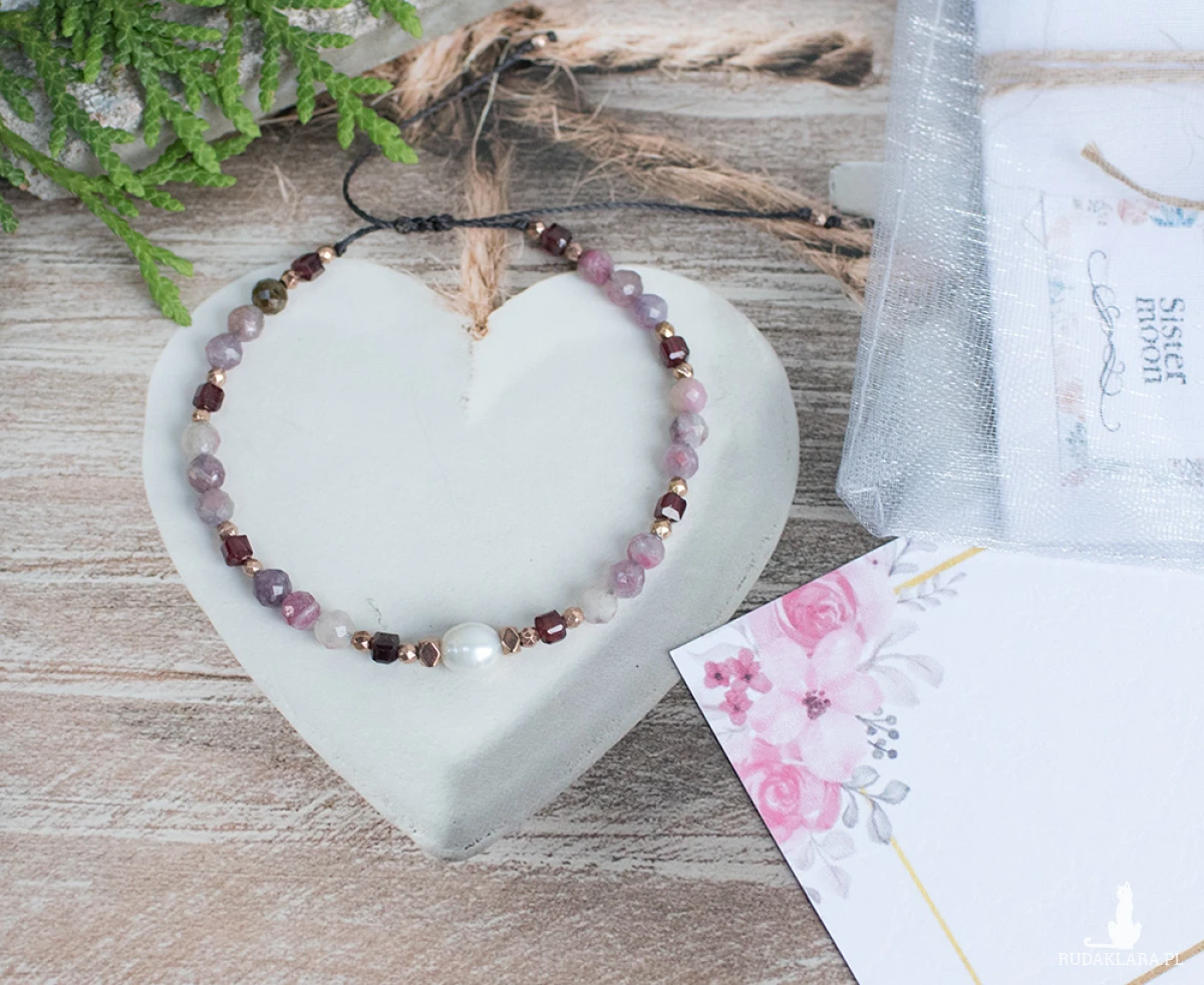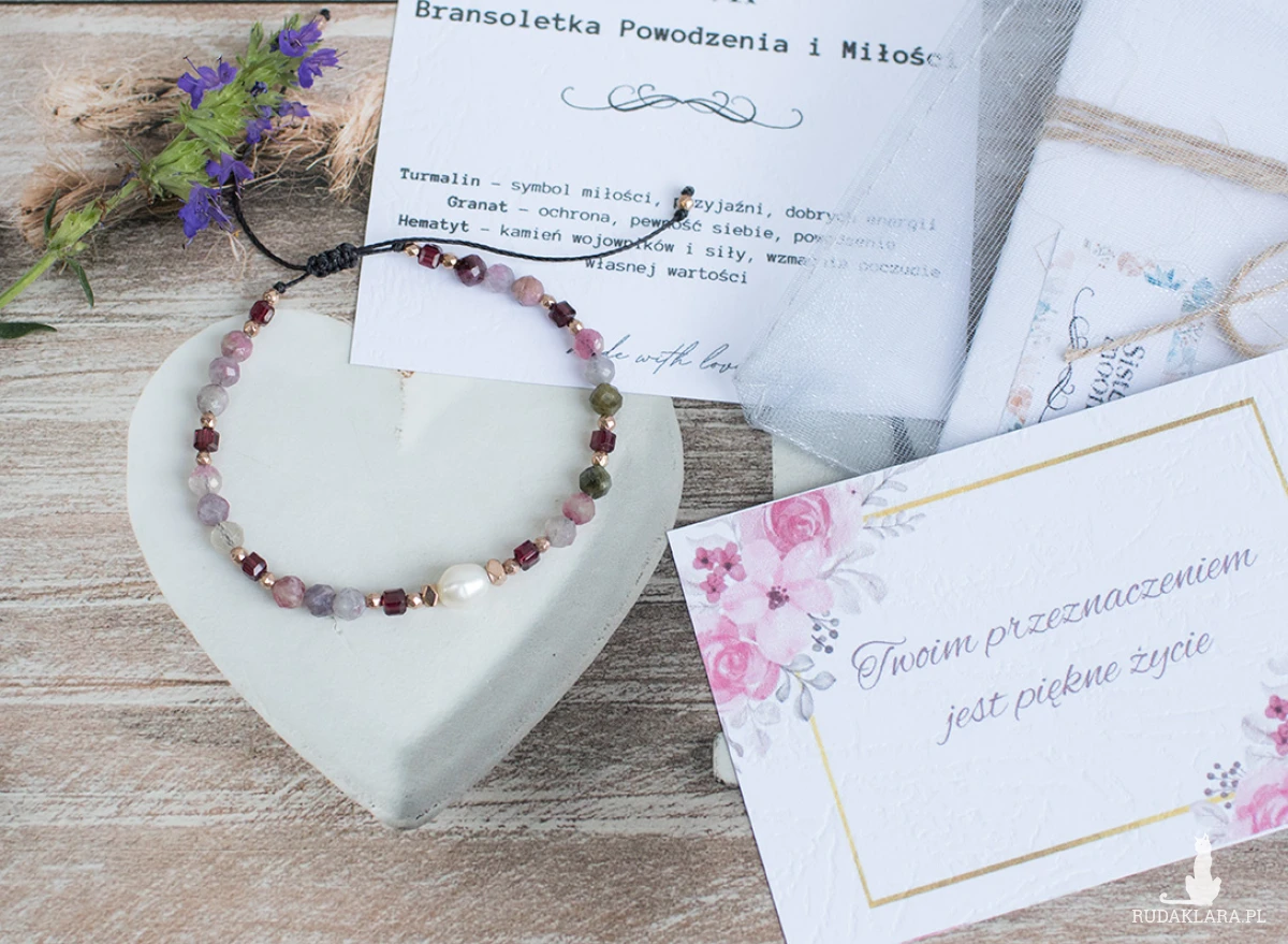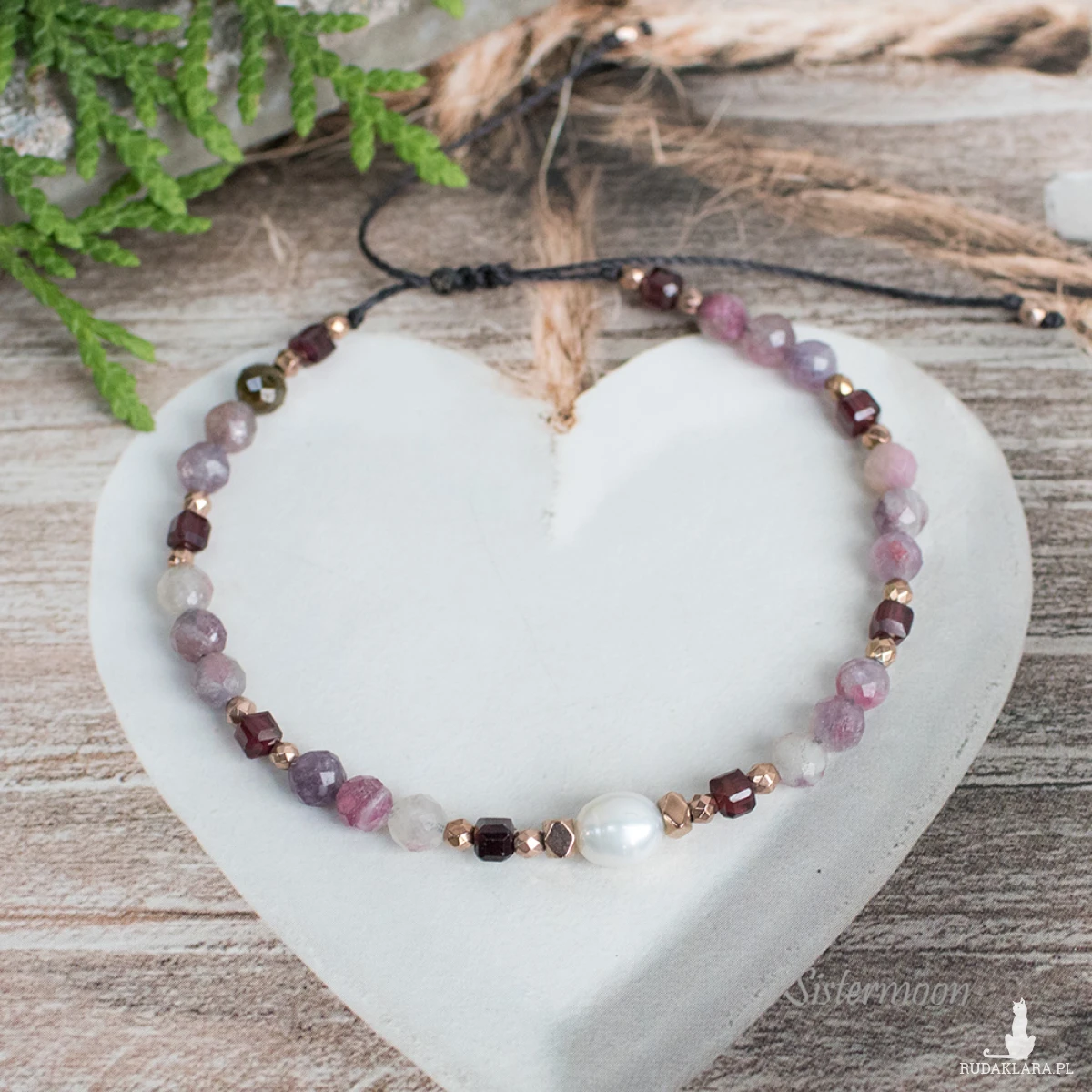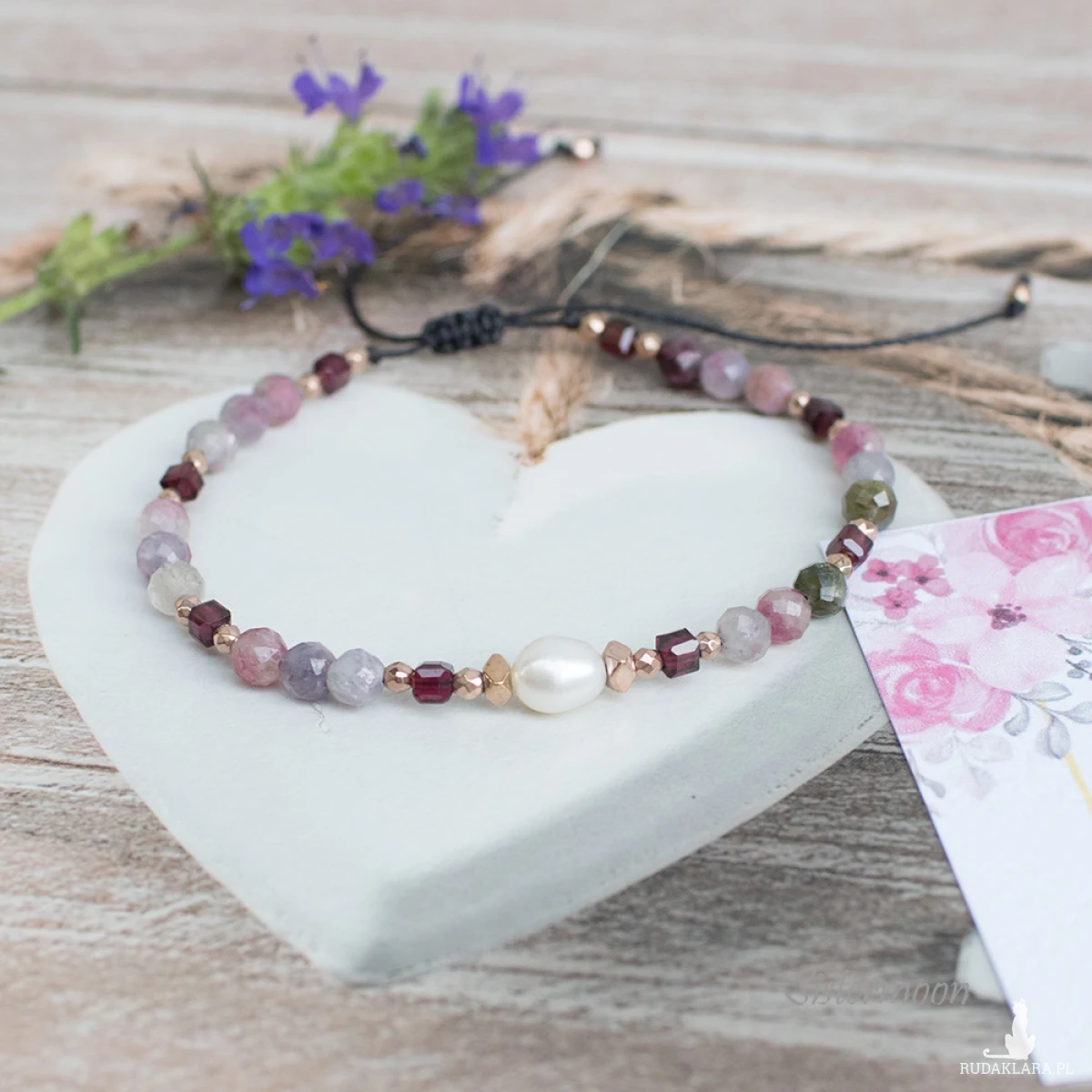 Bransoletka Turmaliny Powodzenia i Miłości wykonana ręcznie ze starannie wyselekcjonowanych minerałów o średnicy 4 mm: turmaliny, kostki fasetowanych granatów, złote fasetowane hematyty oraz mocny nieblaknący sznurek z przesuwnym zapięciem makramowym. Pasuje na nadgarstek o obwodzie 15-18 cm. Na życzenie możliwość wykonania bransoletki na konkretny obwód nadgarstka.