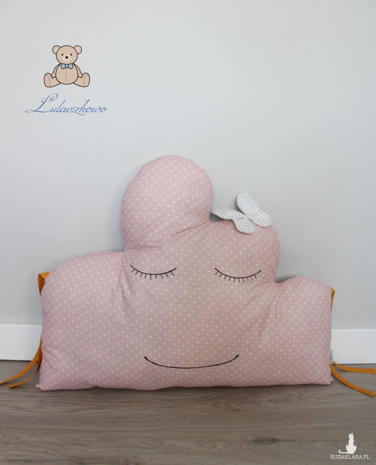 Poduszka dekoracyjna do pokoju dziecięcego w kształcie chmurki udekorowanej motylkiem, a także moduł do ochraniacza modułowego do łóżeczka dziecięcego, w kolorze jasnego różu w kropeczki.