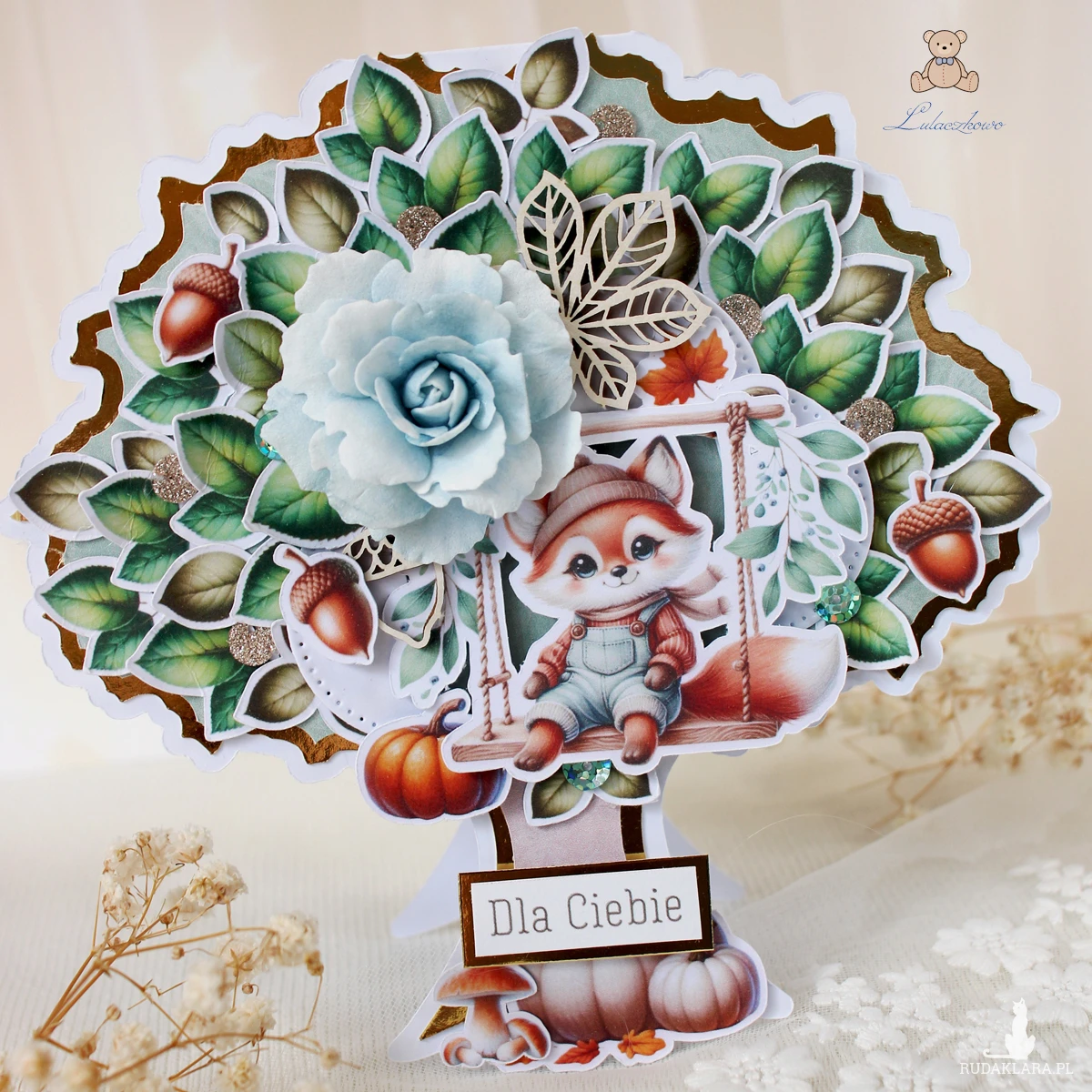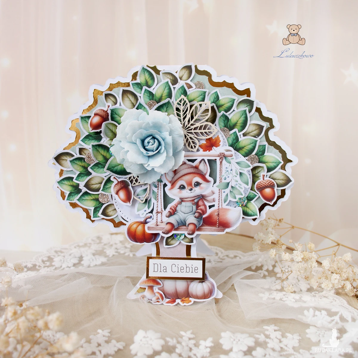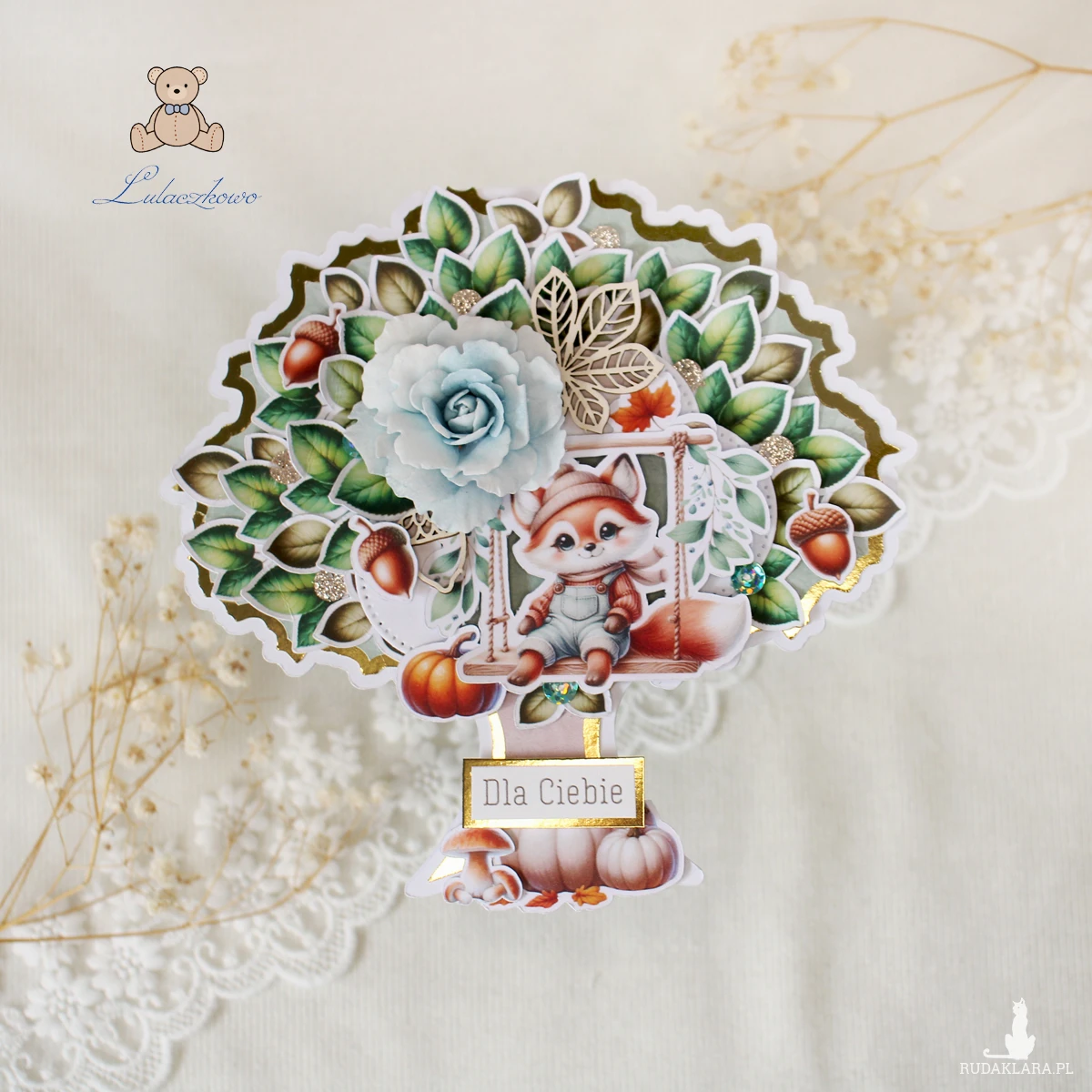 Piękna i nietuzinkowa, dziecięca kartka urodzinowa, wykonana z miksu dziecięcych kolekcji papierów, utrzymana w odcieniach zieleni, brązu i bieli z dodatkiem błyszczących, złotych akcentów. Kartka wykonana ręcznie z dbałością o każdy szczegół. Na środku znajduje się grafika uroczego liska siedzącego na huśtawce, ozdobiona kompozycją kwiatową z ręcznie wykonaną, foamiranową różą, dodatkowo zdobiona tekturkami, a także napisem "Dla Ciebie" (na życzenie mogę dodać również imię dziecka, lub całkowicie zmienić napis na inny).