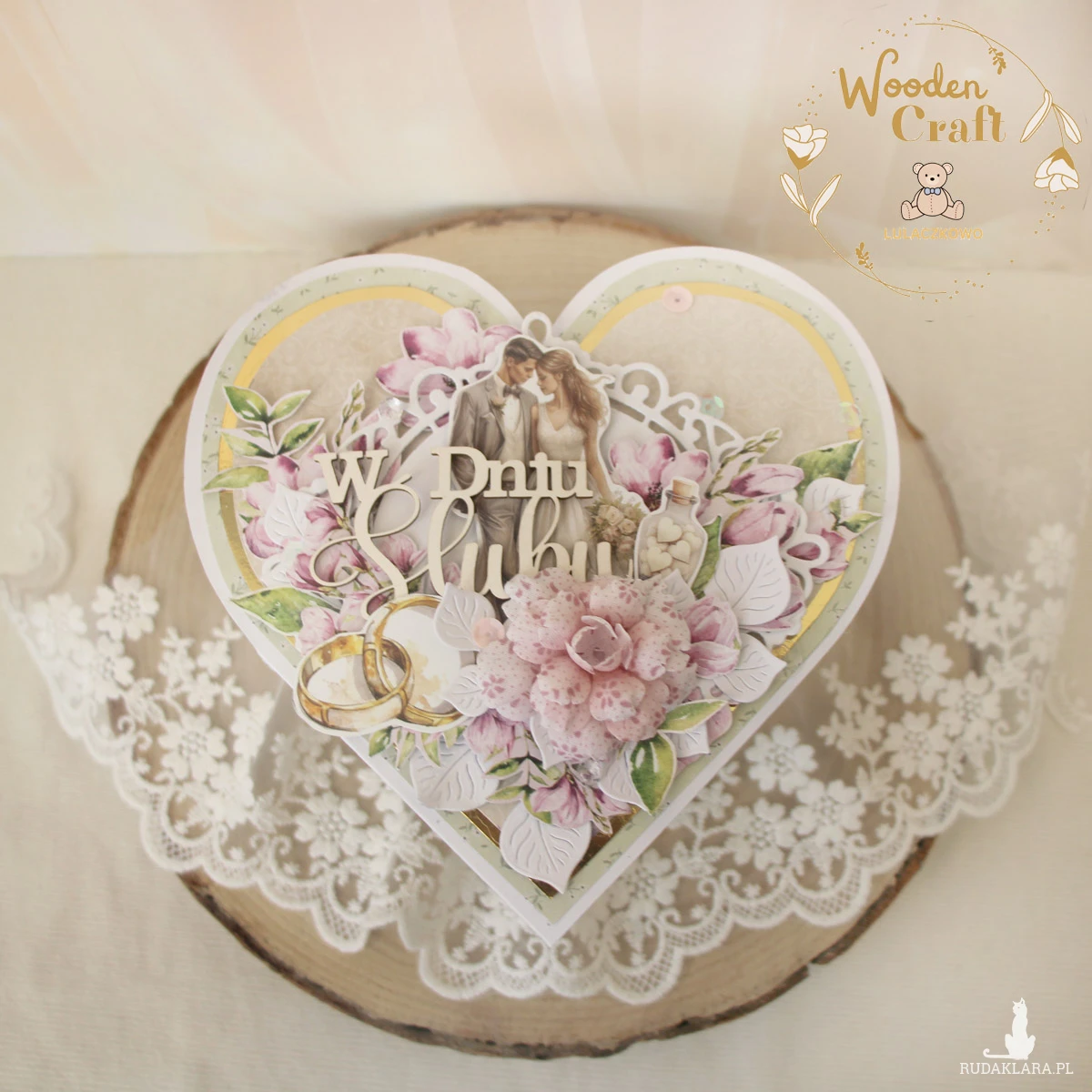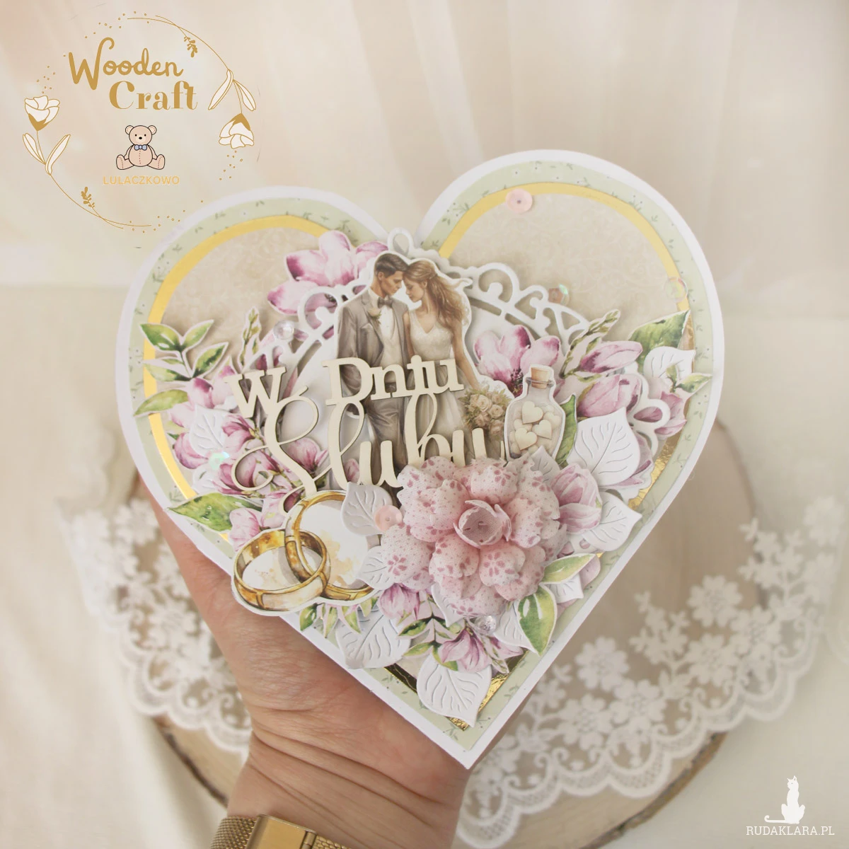 Romantyczna i elegancka kartka ślubna w kształcie serca, utrzymana w odcieniach oliwkowej zieleni i beżu i różu, z dodatkiem błyszczących złotych akcentów. Bogato zdobiona, wykonana ręcznie z dbałością o każdy szczegół z miksu kolekcji papierów do scrapbookingu. Kartka ozdobiona grafiką Pary Młodej, otoczona kompozycją kwiatową z ręcznie robioną materiałową różą, ozdobiona połyskującymi cekinami i kryształkami, a także tekturkowym napisem "W Dniu Ślubu".