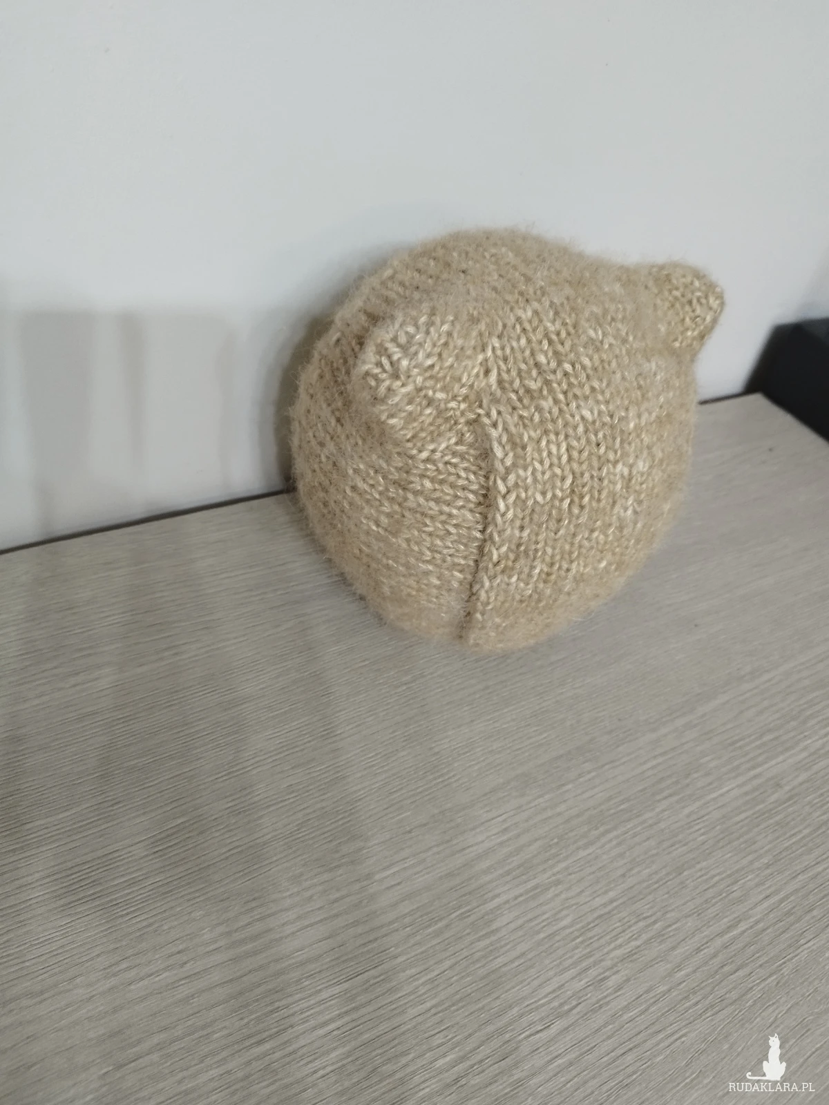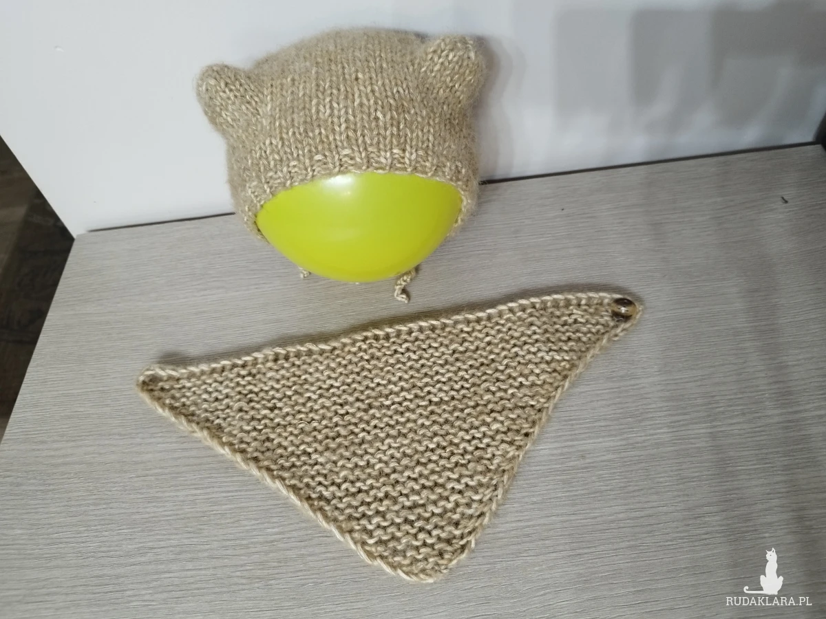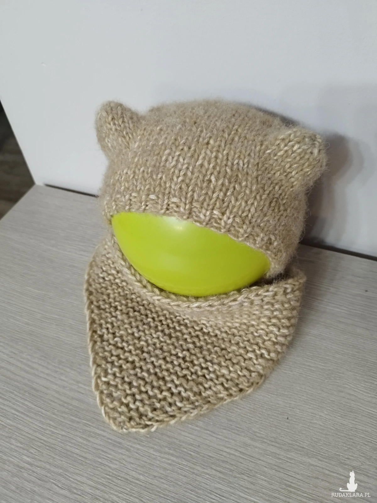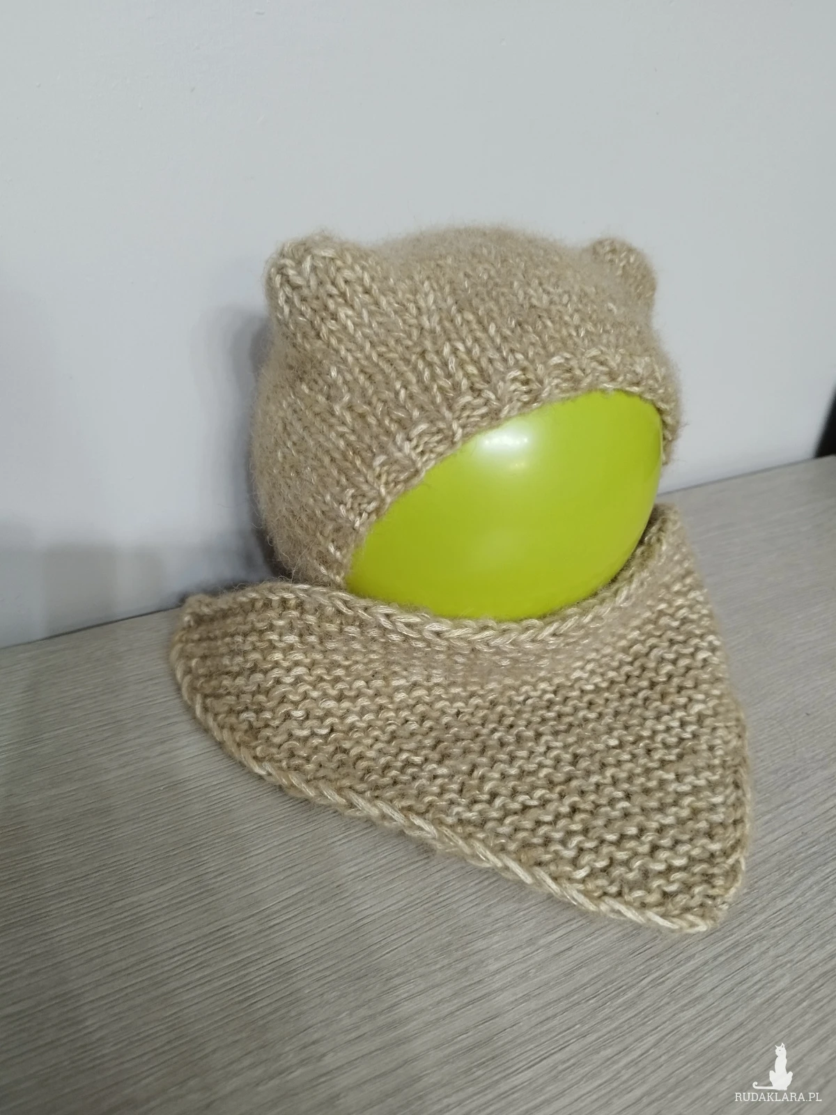 Komplet zrobiony na drutach: czapka z uszami na obwód głowy ok 46-48cm z wiązaniem, chusta zapinana na guzik z tyłu , szerokość 37cm. Skład: alpaka, jedwab, bawełna i wełna merino