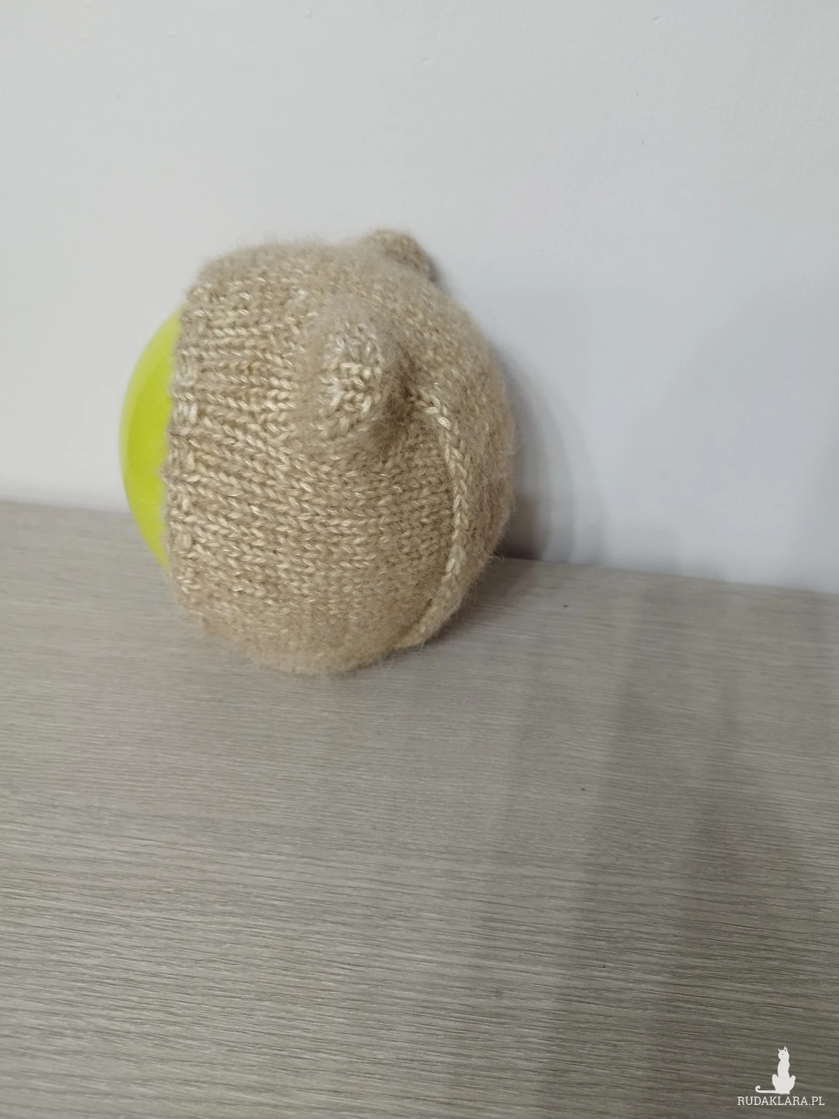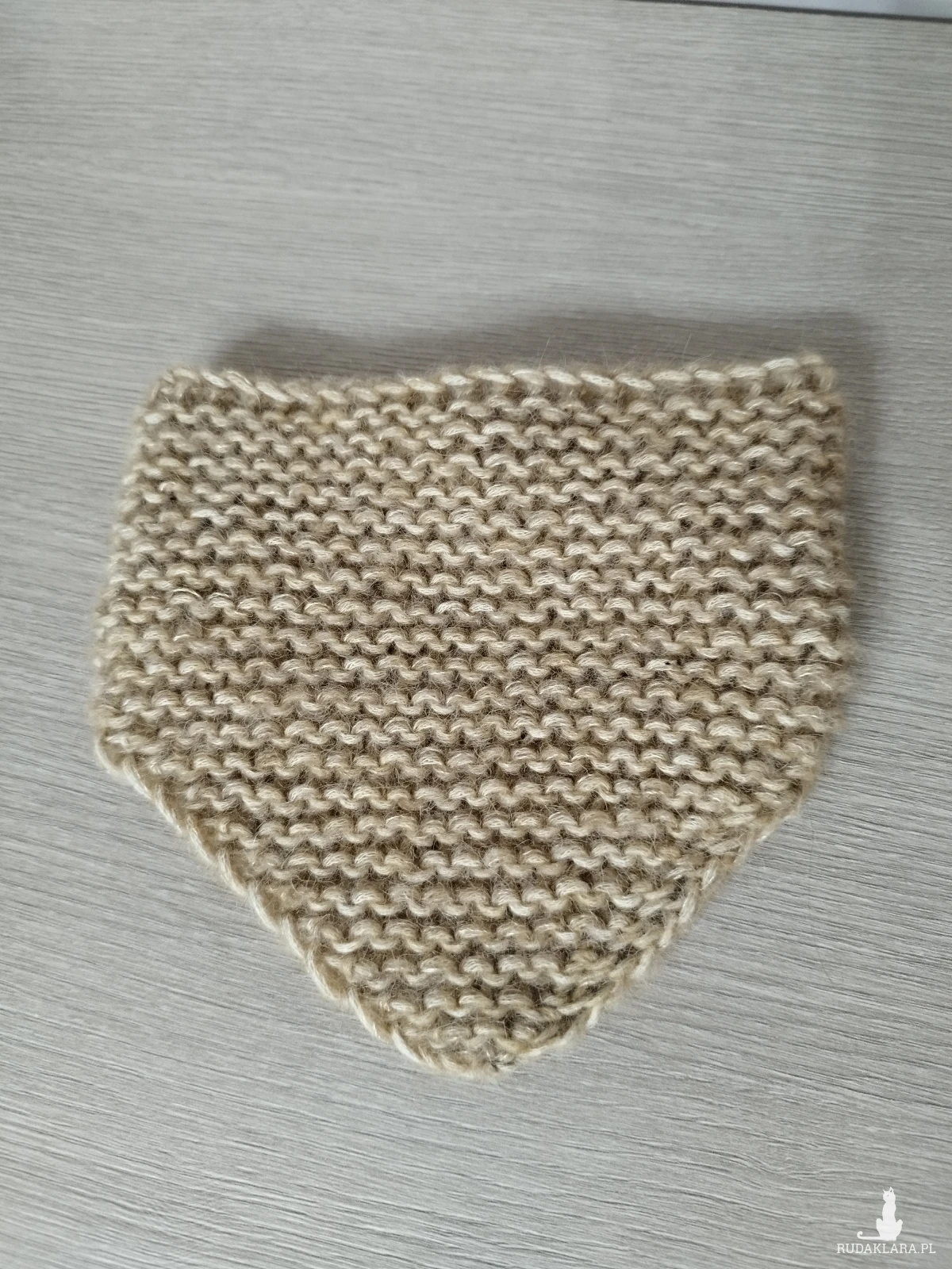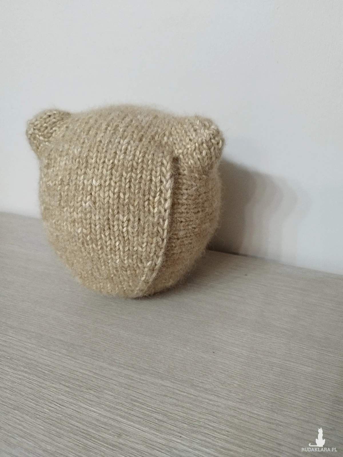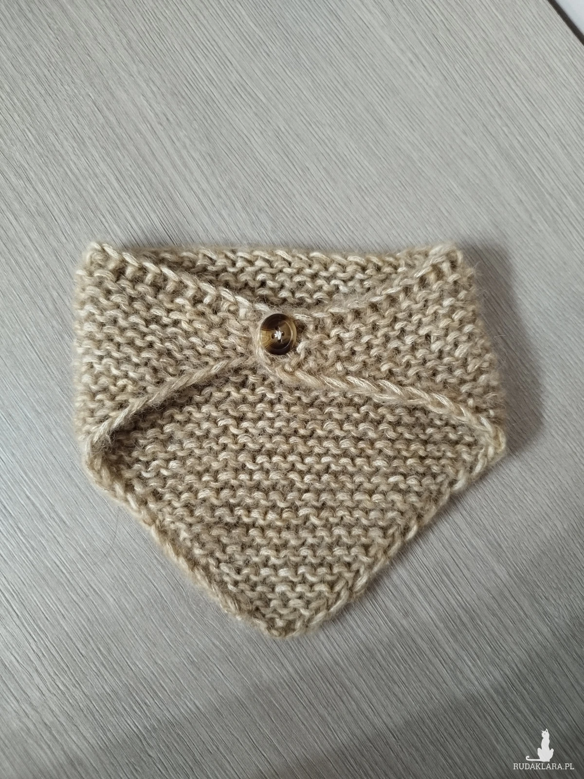 Komplet zrobiony na drutach: czapka z uszami na obwód głowy ok 46-48cm z wiązaniem, chusta zapinana na guzik z tyłu , szerokość 37cm. Skład: alpaka, jedwab, bawełna i wełna merino