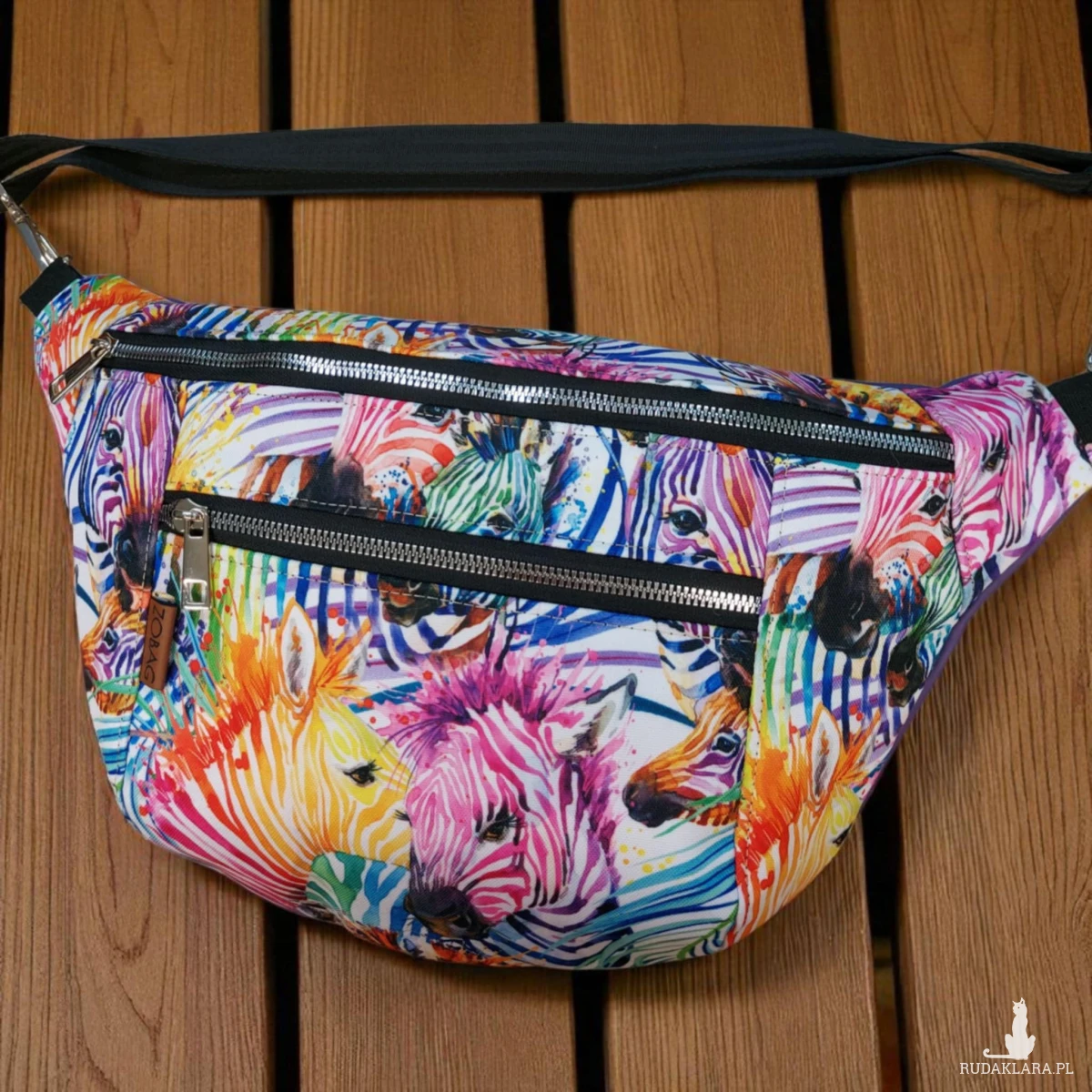 Saszetka-nerka uszyta z tkaniny wodoodpornej wzór oraz na tyle fioletowa ekoskóra.