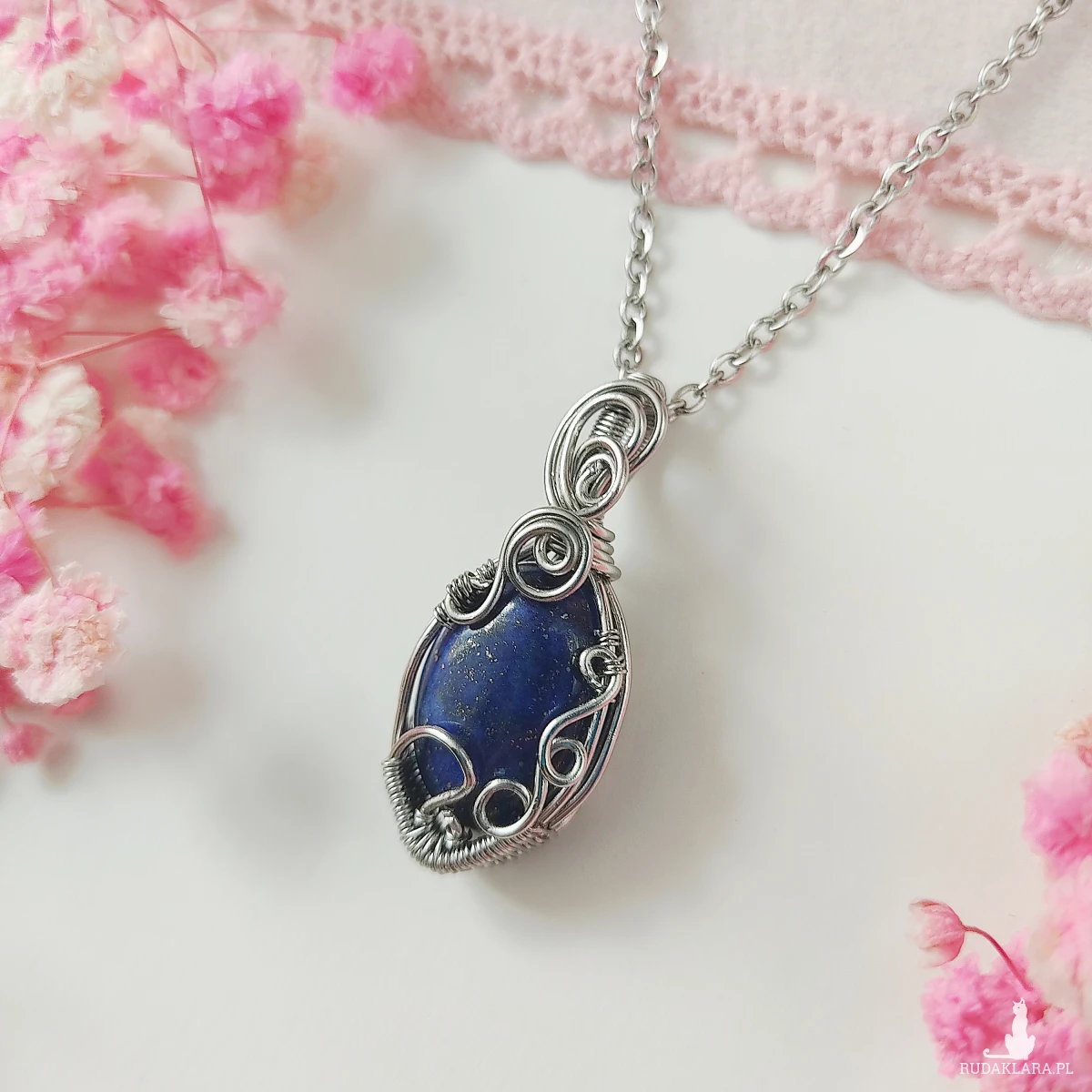 Naszyjnik Lapis Lazuli ręcznie wykonany z drutów ze stali chirurgicznej metodą wire wrapping.