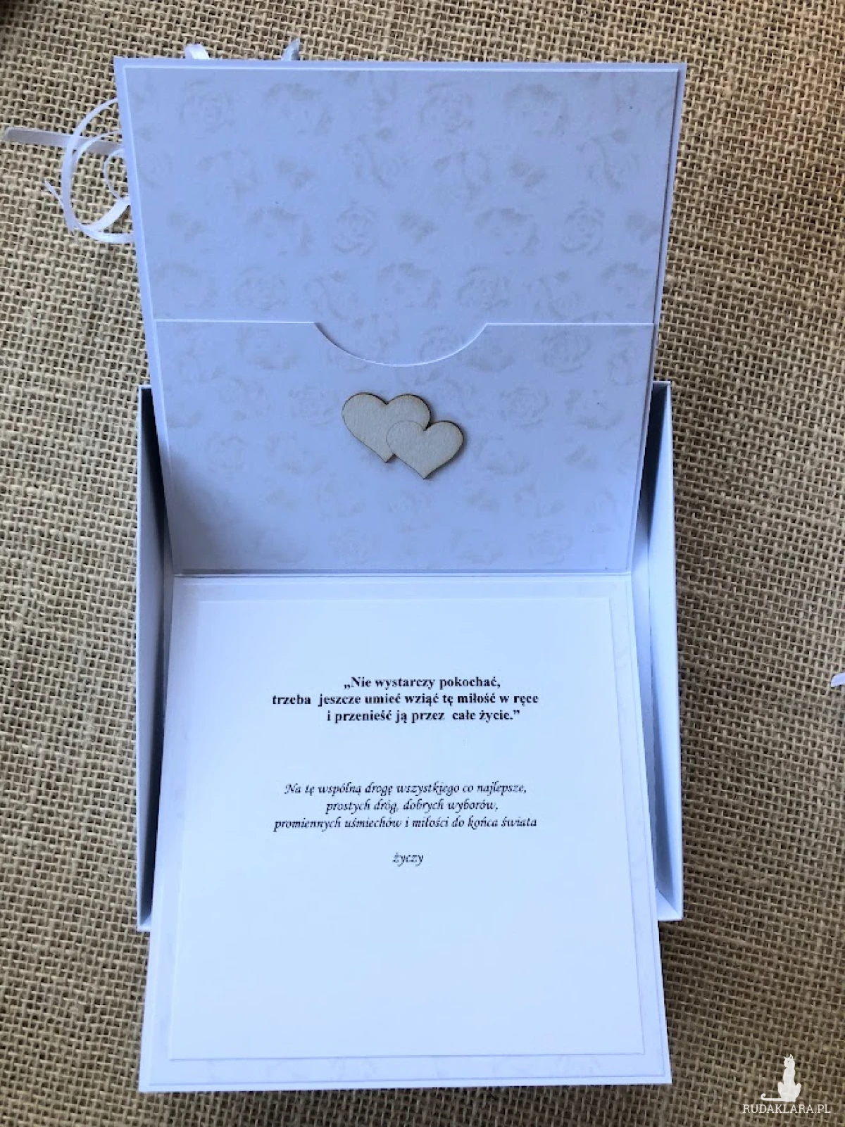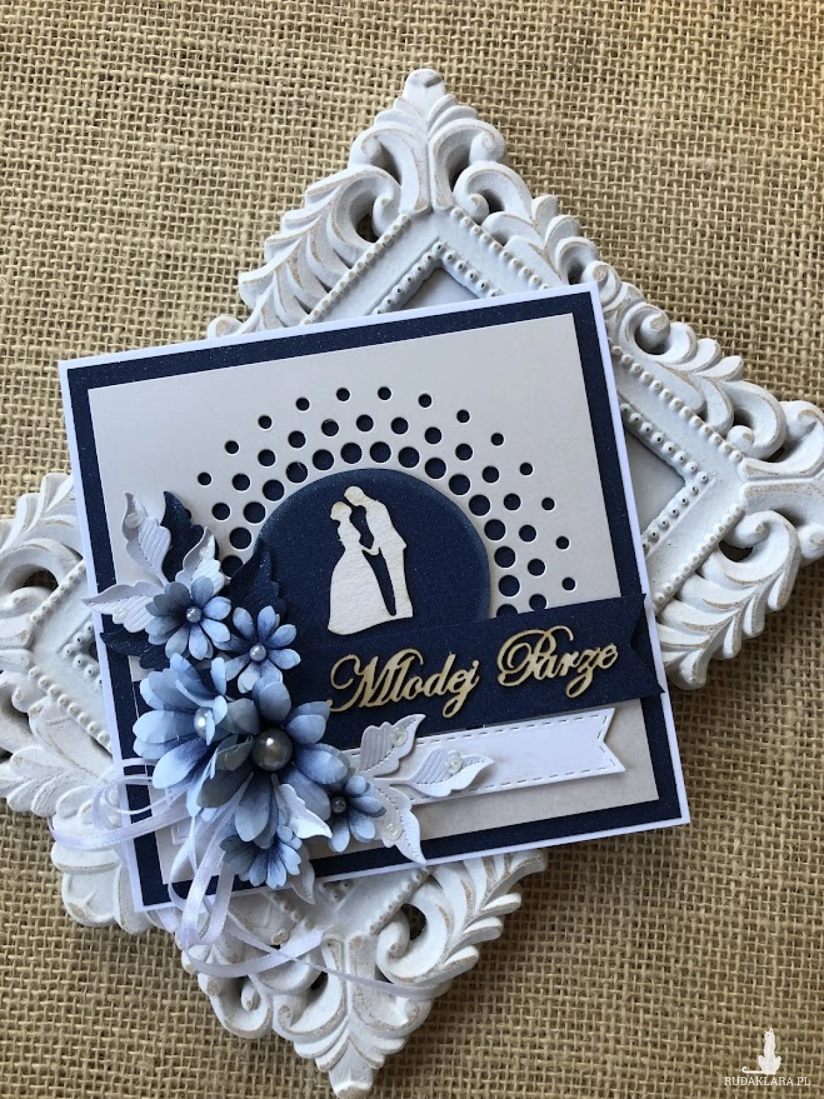 Kartka z okazji ślubu wykonana ręcznie z niezwykłą starannością i dbałością o każdy detal. Na bazie z papieru scrapowego białego. Całość utrzymana w kolorystyce bieli z dodatkiem granatu i srebra z elegancką kwiatową kompozycją, piękną ażurową bazą Rozmiar ok 14 x 14 cm. Wewnątrz kartki znajdują się gotowe życzenia oraz umieszczono kieszonkę na małe co nieco lub kupon lotto. .W komplecie pudełko z papieru scrapowego (rozmiar 15,5 x 15,5 cm) ozdobione tak jak kartka .W tej postaci komplet dostępny od ręki.