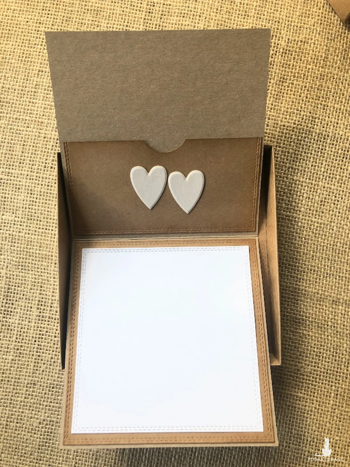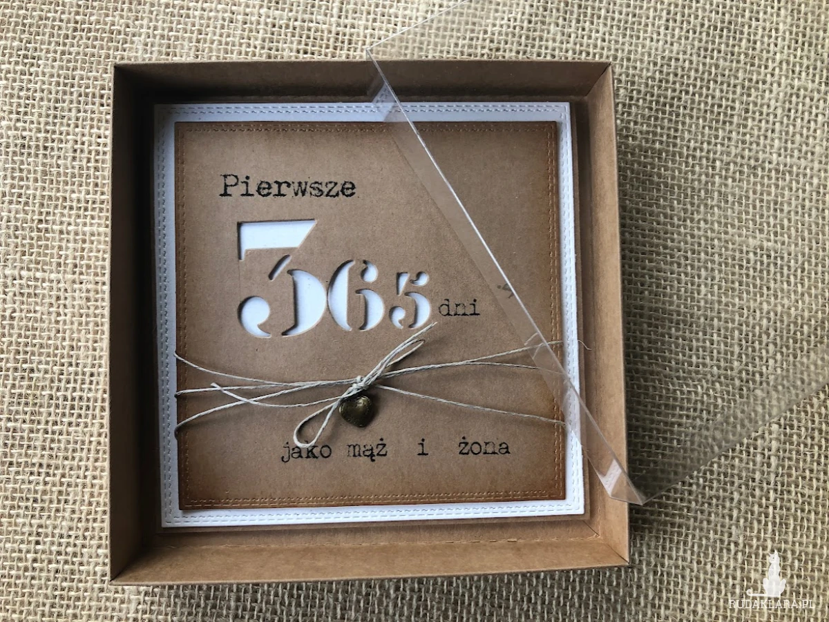Kartka z okazji pierwszej rocznicy ślubu.Kartka w pudełku w stylu kraftowym. Wymiar kartki 14,0 x 14,0 ,pudełka 15,5 x 15,5 z kwadratowym okienkiem.Wewnątrz kartki miejsce na wypisanie życzeń oraz kieszonka na małe co nieco. Pudełko przewiązane tagiem. Produkt gotowy do natychmiastowej wysyłki