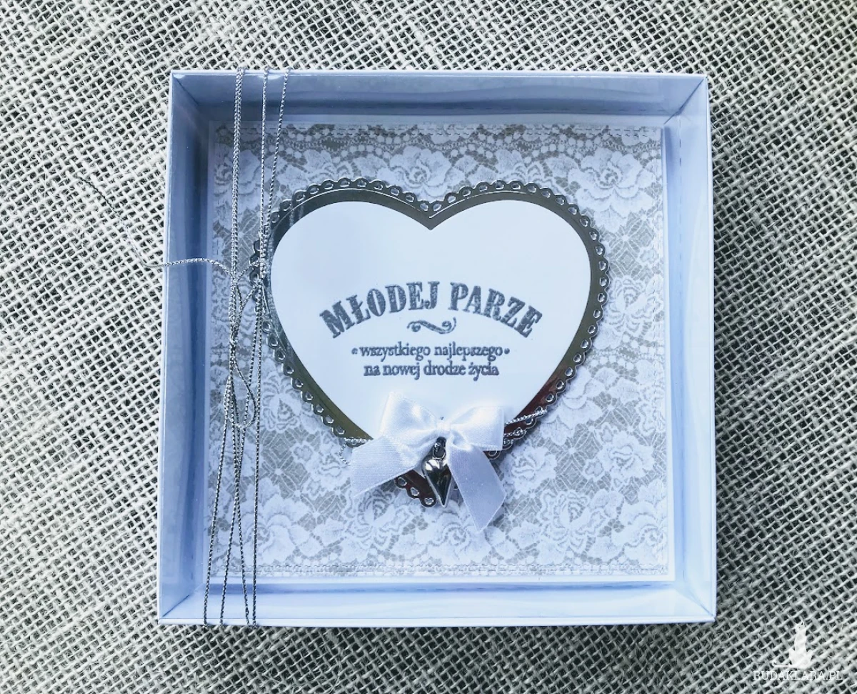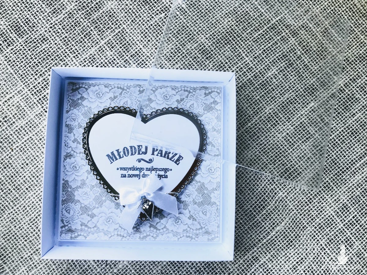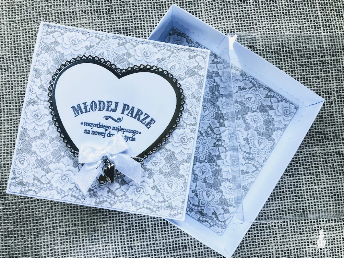 Kartka z okazji Ślubu wykonana ręcznie z niezwykłą starannością i dbałością o każdy detal. Na bazie białego papieru scrapowego,w biało - szaro -srebrnej kolorystyce kolorystyce. Kartka o wymiarach 13,5x13,5 wewnątrz której znajduje sie miejsce na małe co nieco lub kupon lotto oraz bilecik z gotowymi życzeniami do własnoręcznego podpisu.Do kartki dołączono białe pudełko o wymiarze 15,5x 15,5 z transparentnym wieczkiem obwiązanym srebrnym sznurkiem..W tej postaci komplet dostepny od ręki.Polecam