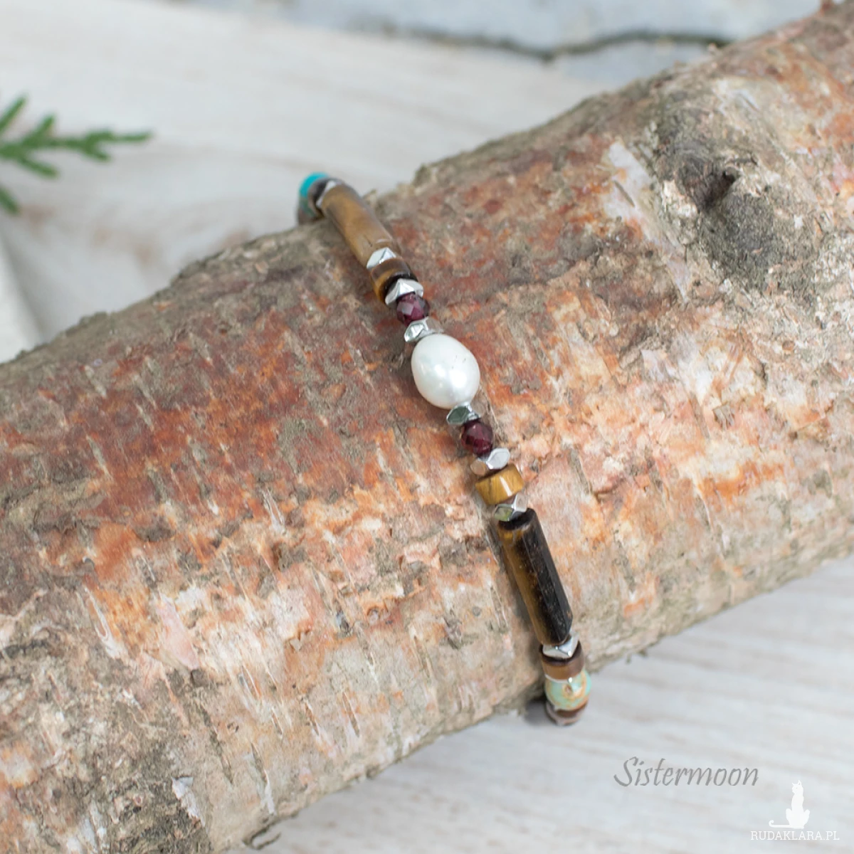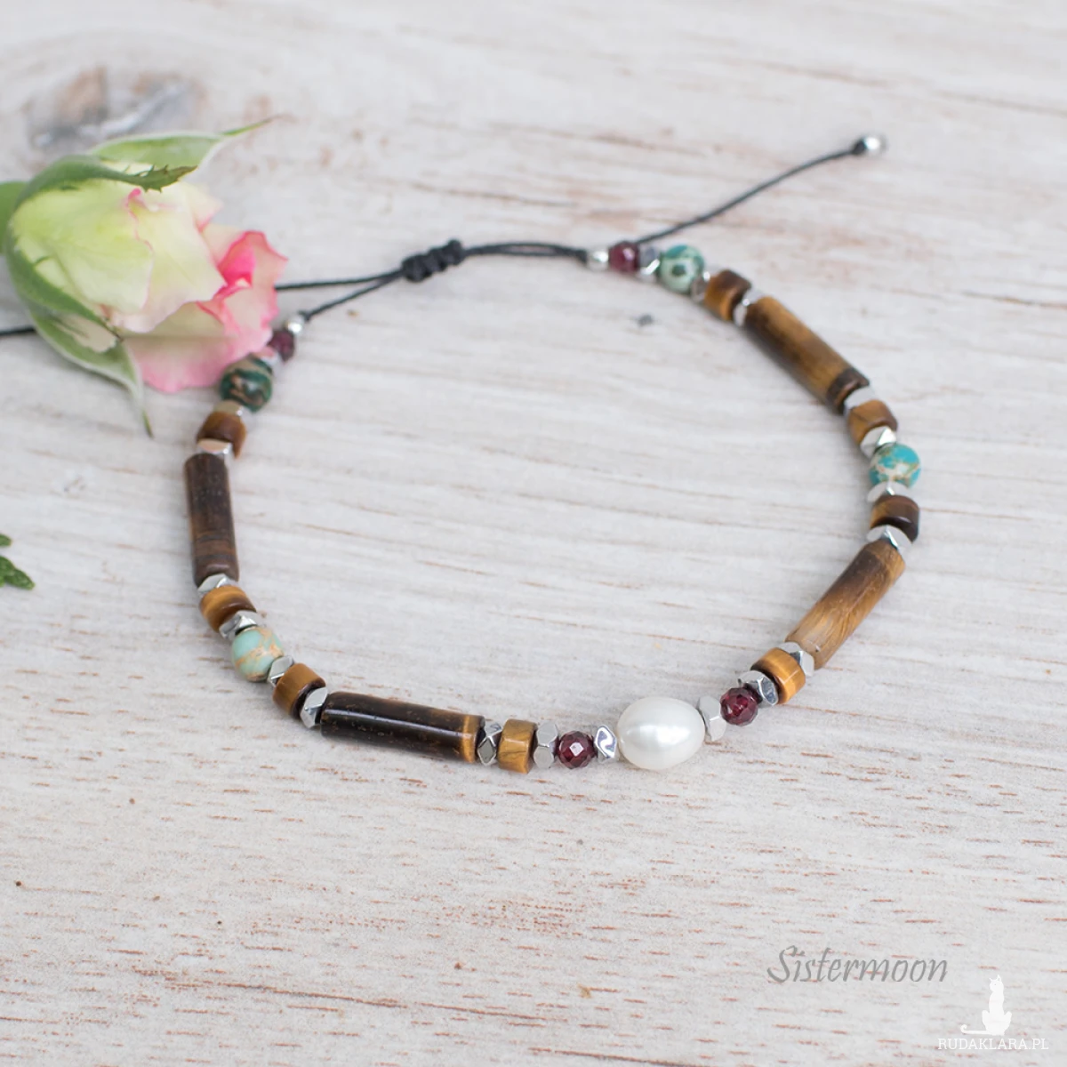Bransoletka dobrych życzeń w turkusie i brązie. Damska bransoletka z minerałami – idealna na prezent. Pełna mocy i z ukrytym znaczeniem. Bransoletka wykonana ze starannie dobranych minerałów: perełka rzeczna, jaspis turkusowy, tygrysie oko, granat, hematyty, minerały o średnicy 2, 3 i 4 mm.