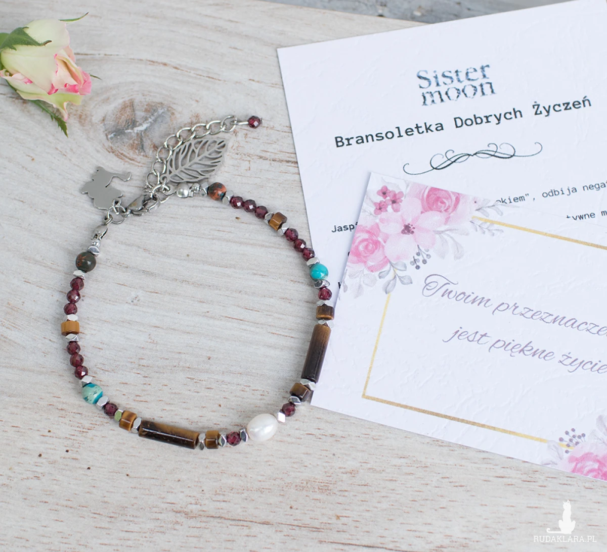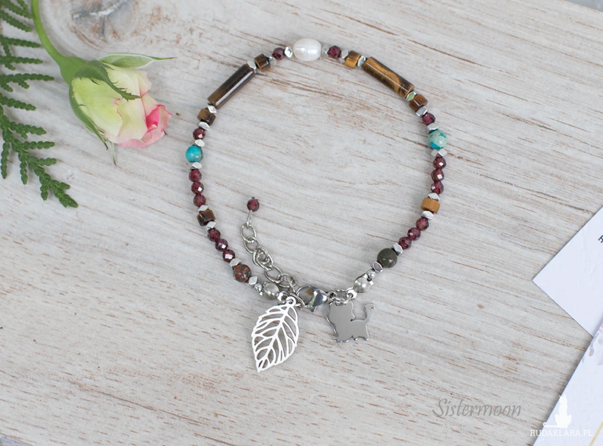 Bransoletka tygrysie oko dobrych życzeń. Damska bransoletka z minerałami – idealna na prezent. Pełna mocy i z ukrytym znaczeniem. Bransoletka wykonana ze starannie dobranych minerałów: perełka rzeczna, jaspis turkusowy, tygrysie oko, granat, hematyty, minerały o średnicy 2, 3 i 4 mm. Zawieszki: kot i listek, stal szlachetna.