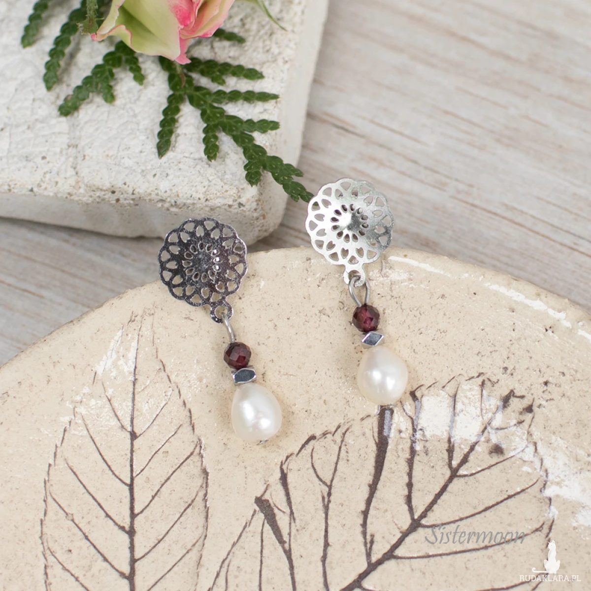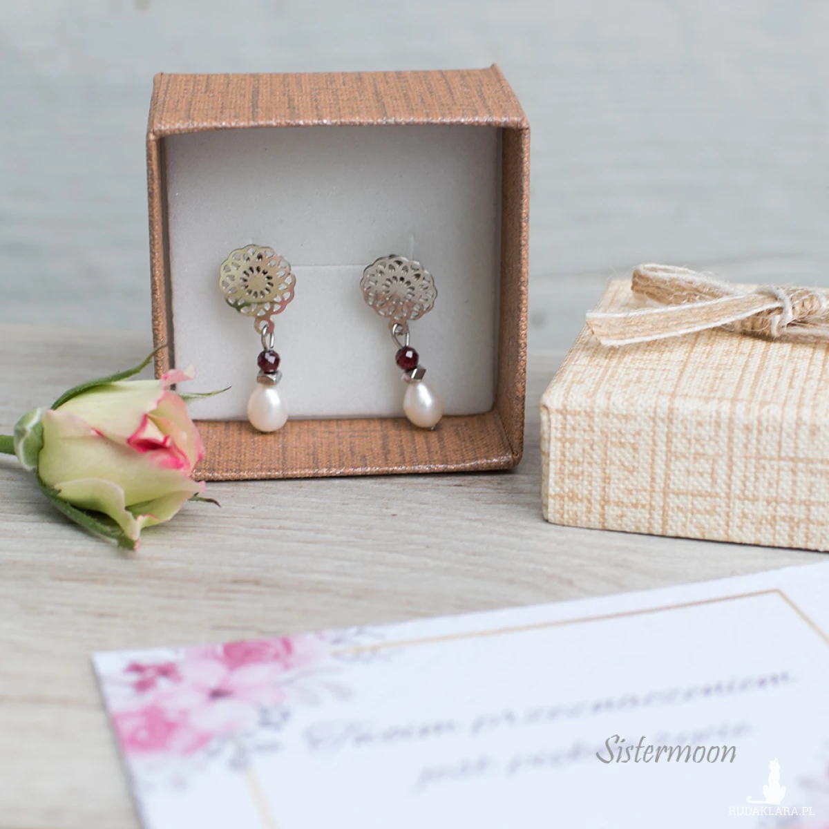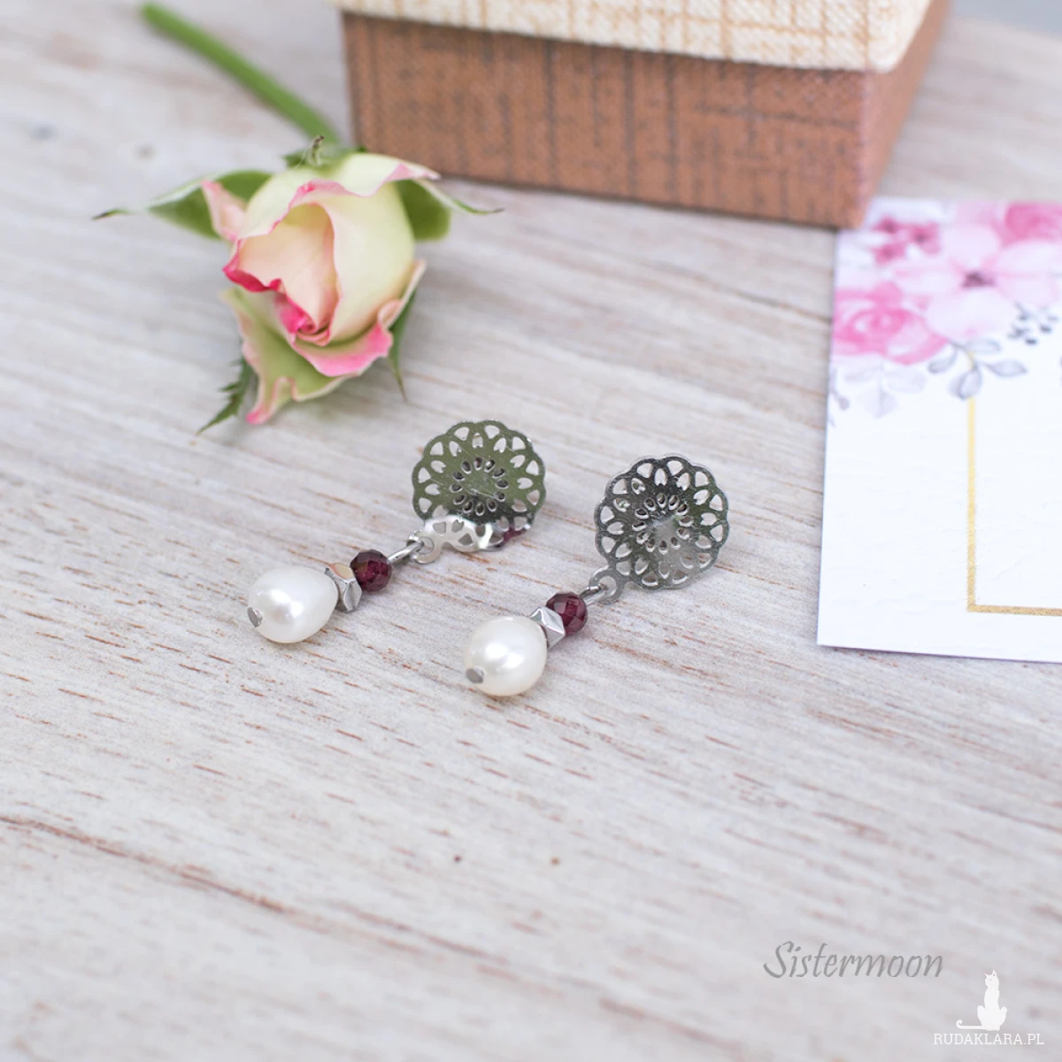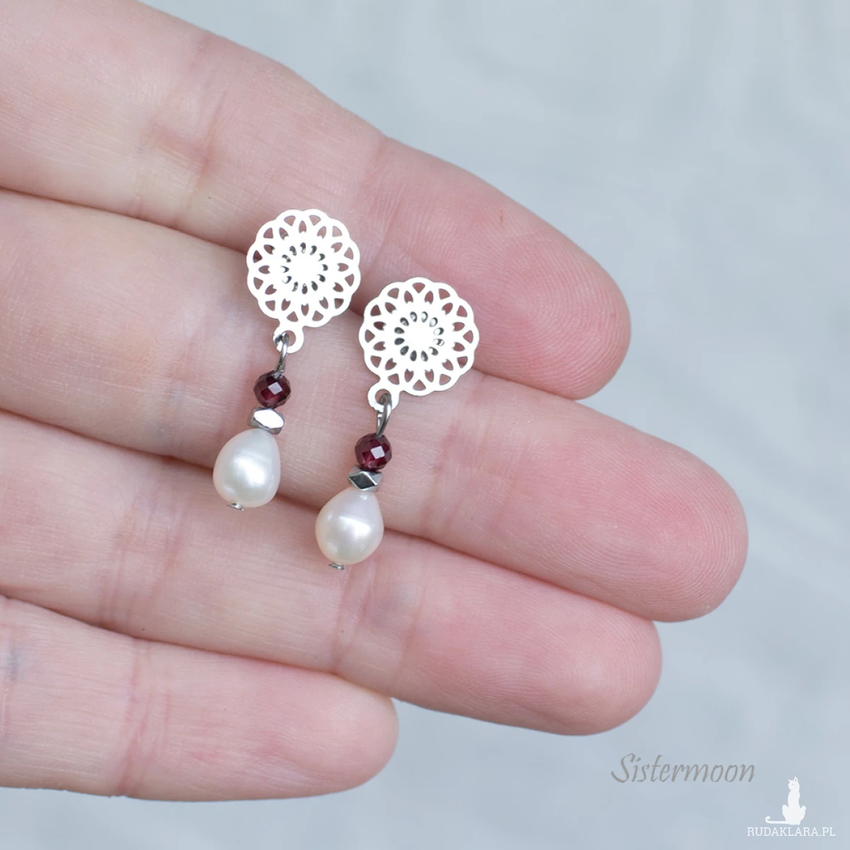 Małe kolczyki z perłami. Kolczyki są lekkie i delikatne, eleganckie, z perełkami rzecznymi, hematytami i granatami, wykonane na bazie stali szlachetnej. Zapięcia – sztyfty stalowe ażurowe.