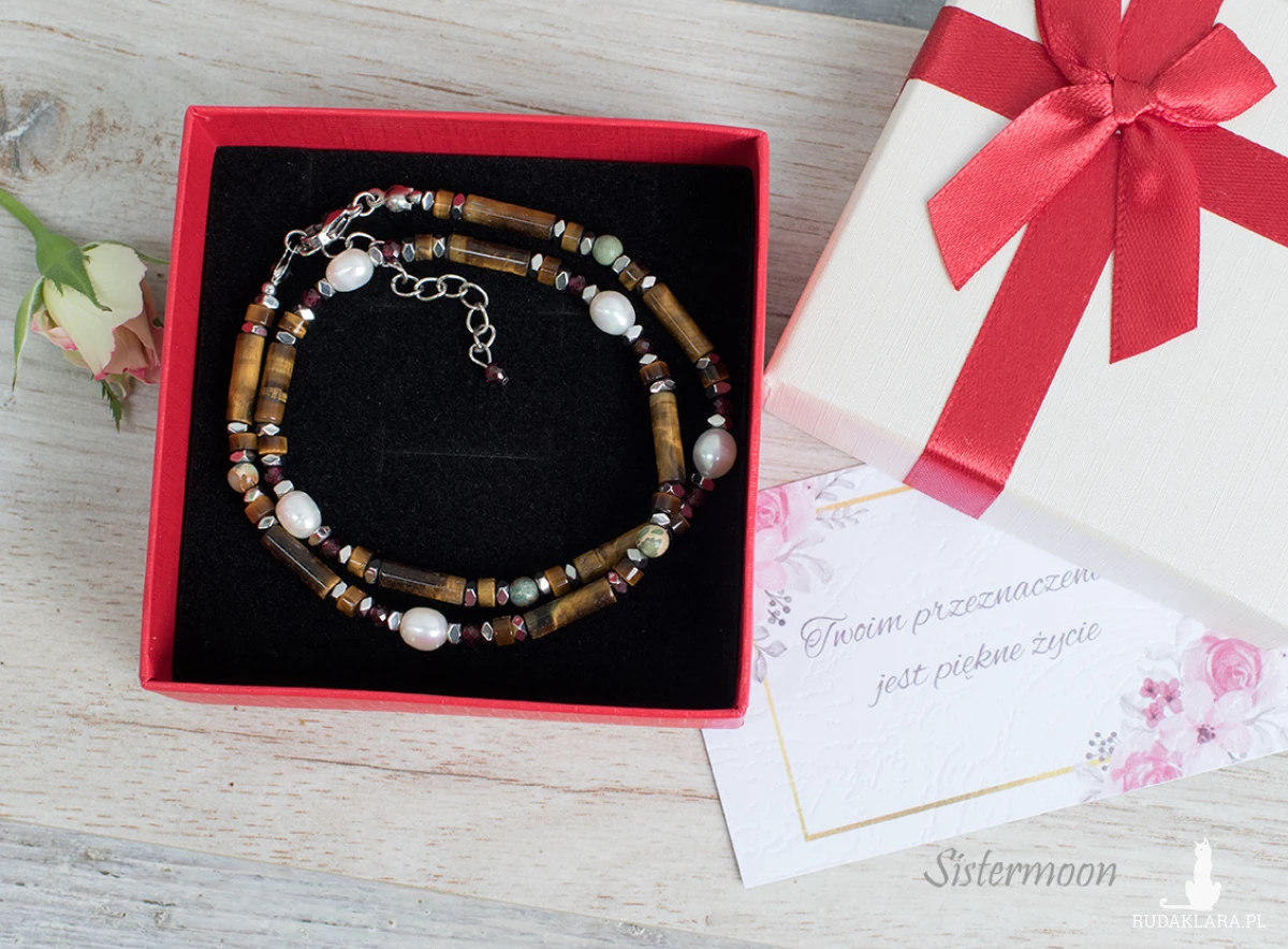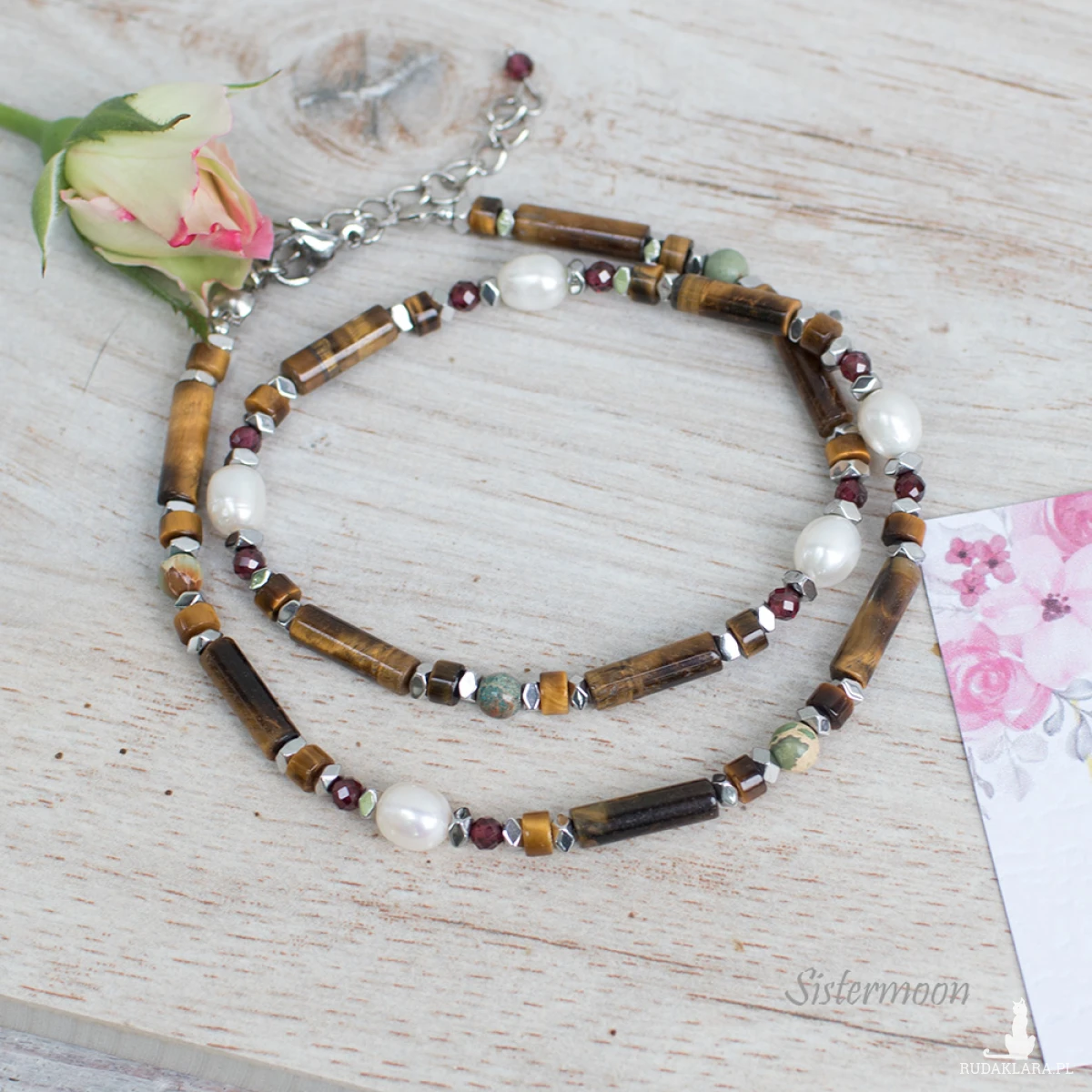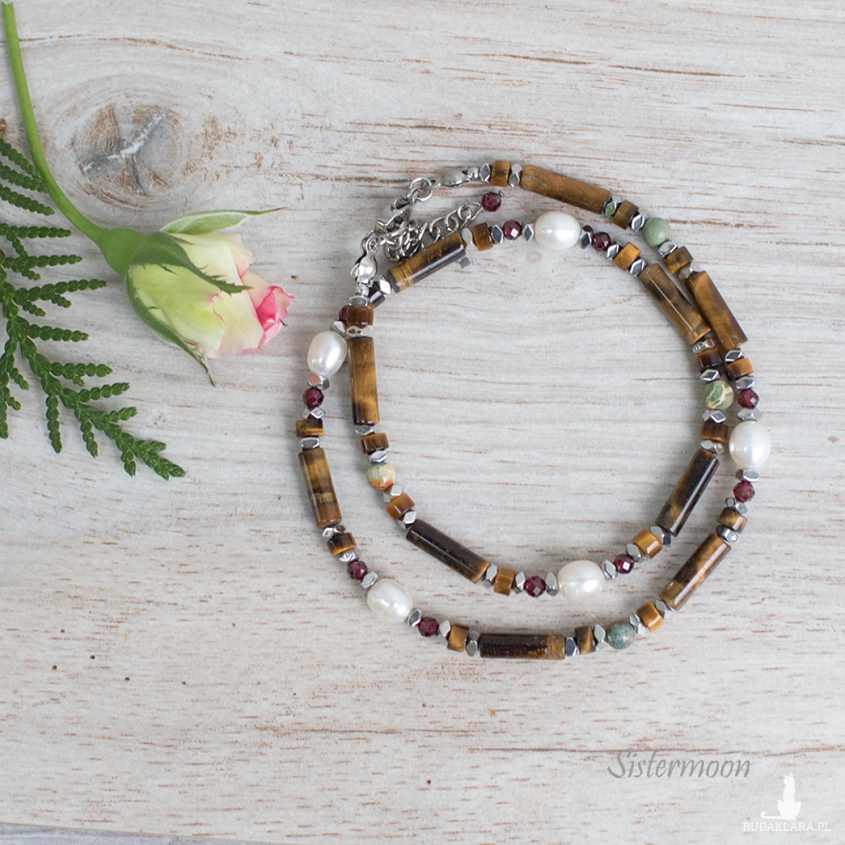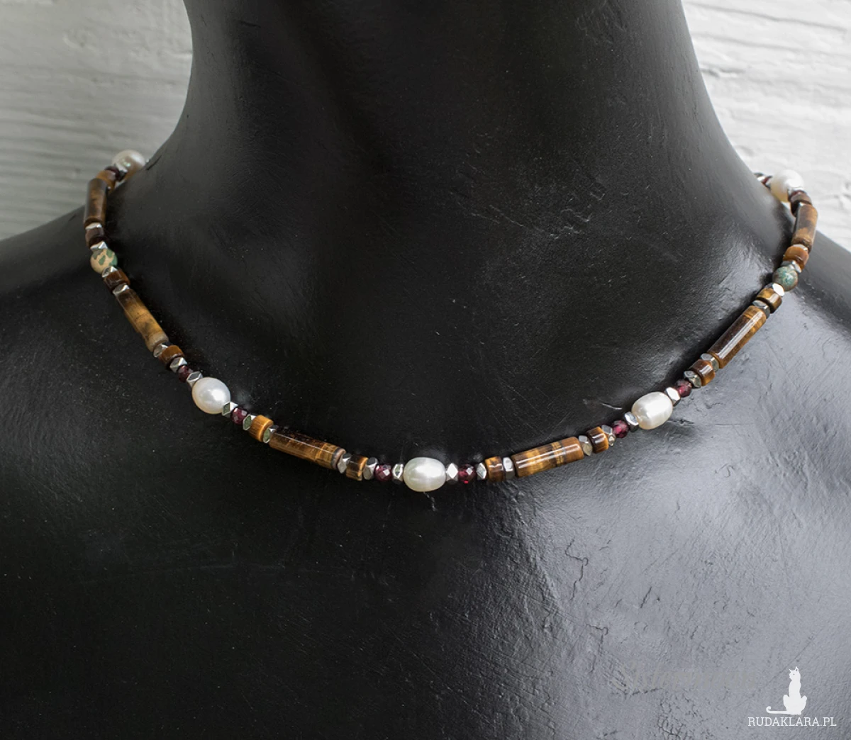 Wykonanie: Elementy wysokiej jakości ze stali szlachetnej, białe perełki rzeczne, tygrysie oko, granaty, hematyty. Zapinanie na karabińczyk z łańcuszkową przedłużką. Długość: 40 cm plus 4 cm łańcuszek.