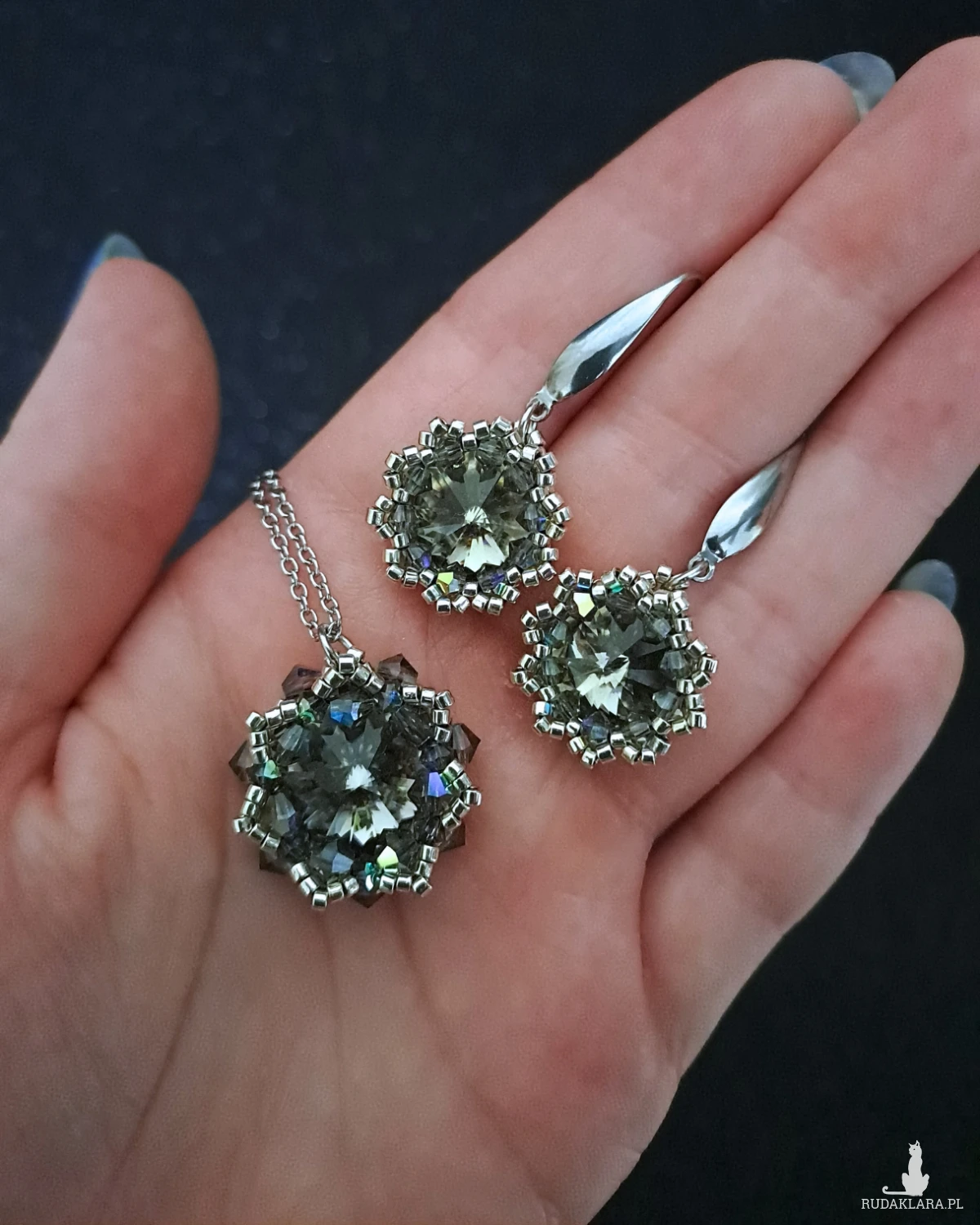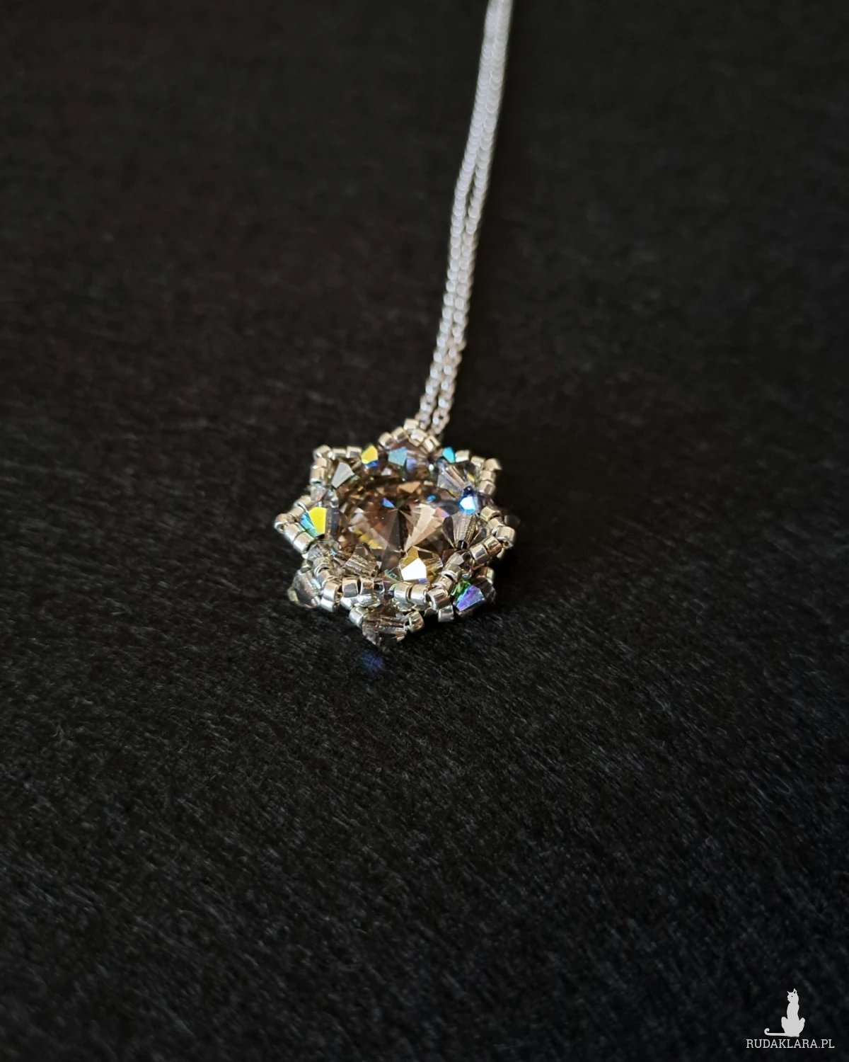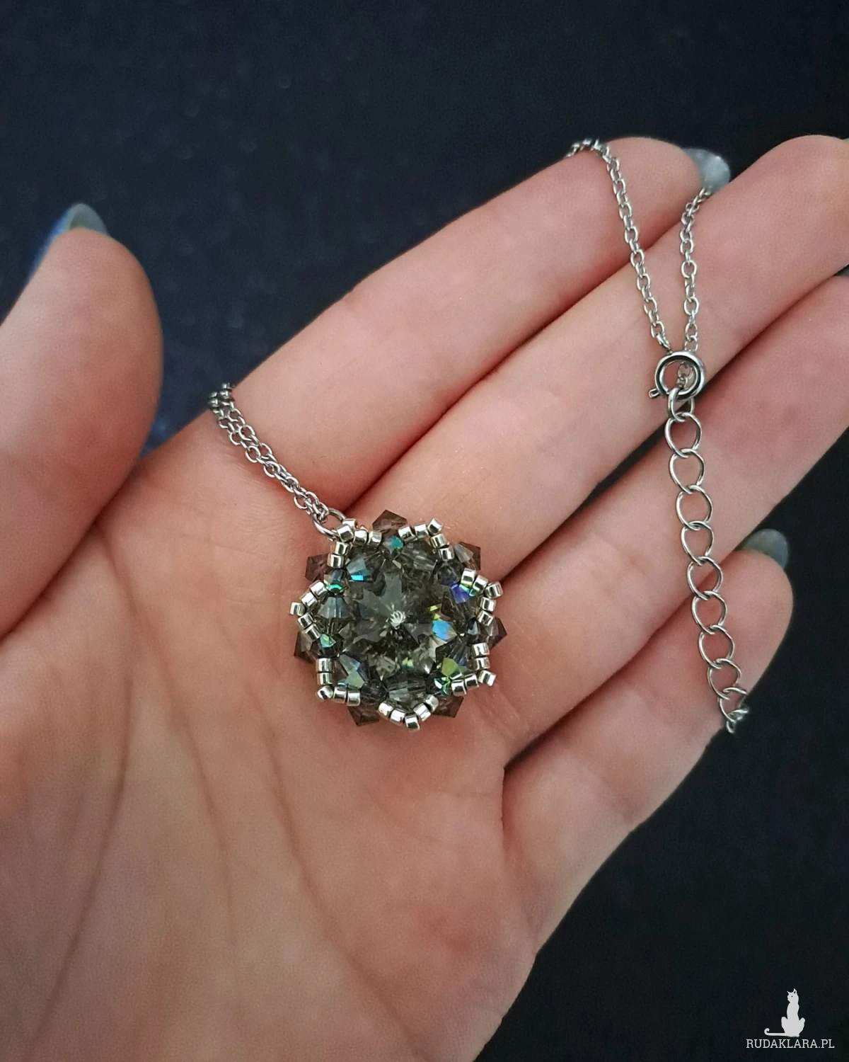 Zawieszka naszyjnika (ok. 2,7 × 2,5 cm) została wykonana z kryształu Preciosa Crystal Maxima, otoczonego kryształkami Bicone i srebrnymi koralikami Miyuki. Całość zawieszona jest na stalowym łańcuszku typu ankier o długości 45 cm + 5 cm przedłużka.