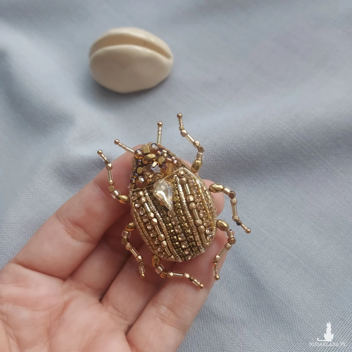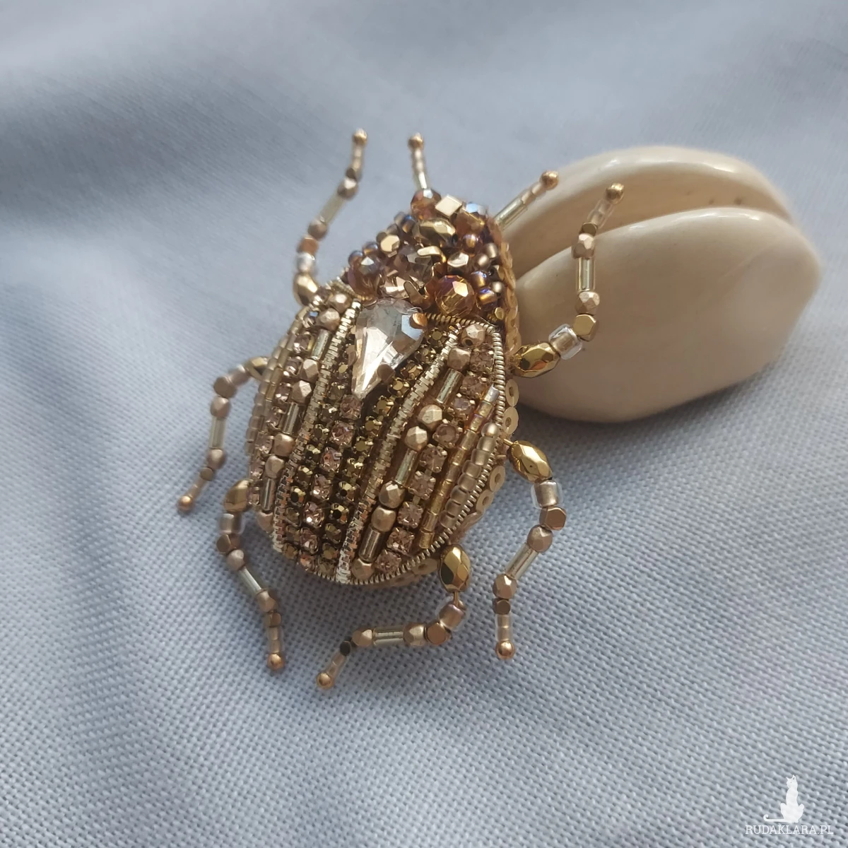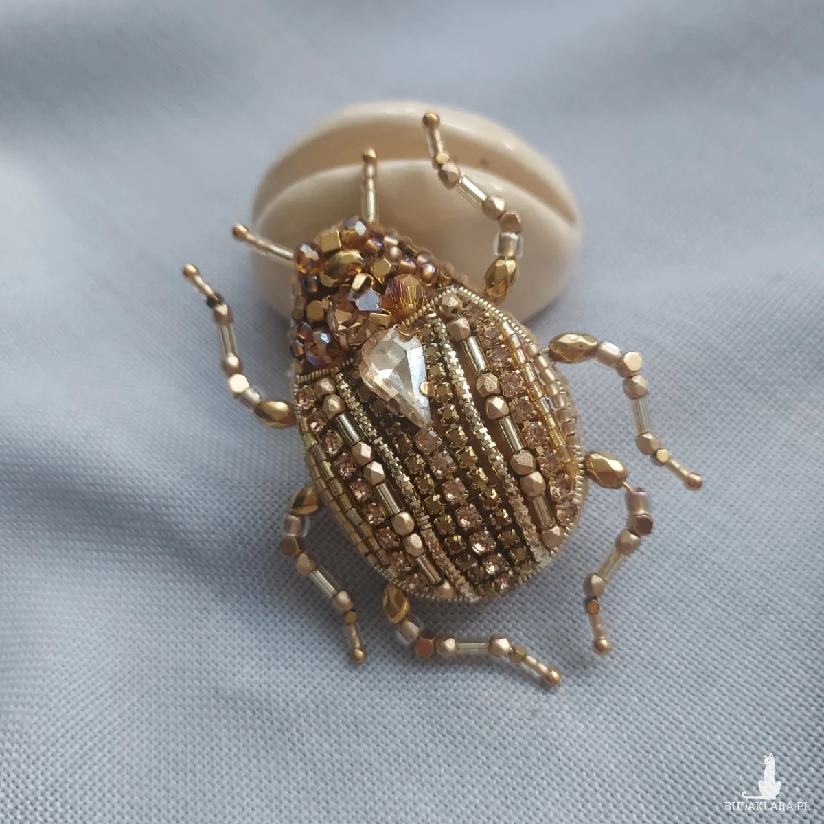 Wyjątkowa, jedyna w swoim rodzaju broszka ŻUCZEK w kolorze złotym przyciągnie uwagę niespotykanym blaskiem koralików oraz kryształków pięknie mieniących się w promieniach sierpniowego słońca.
