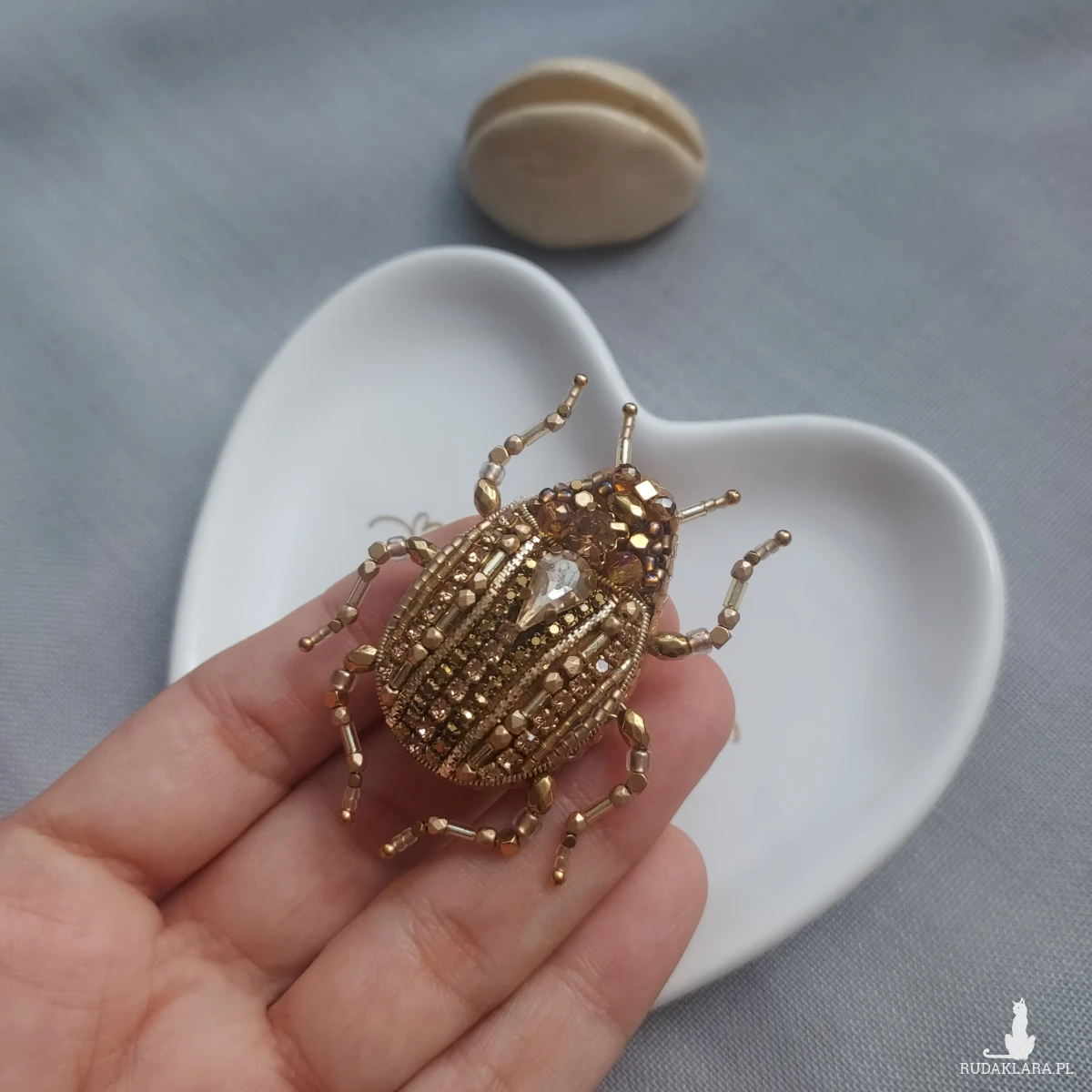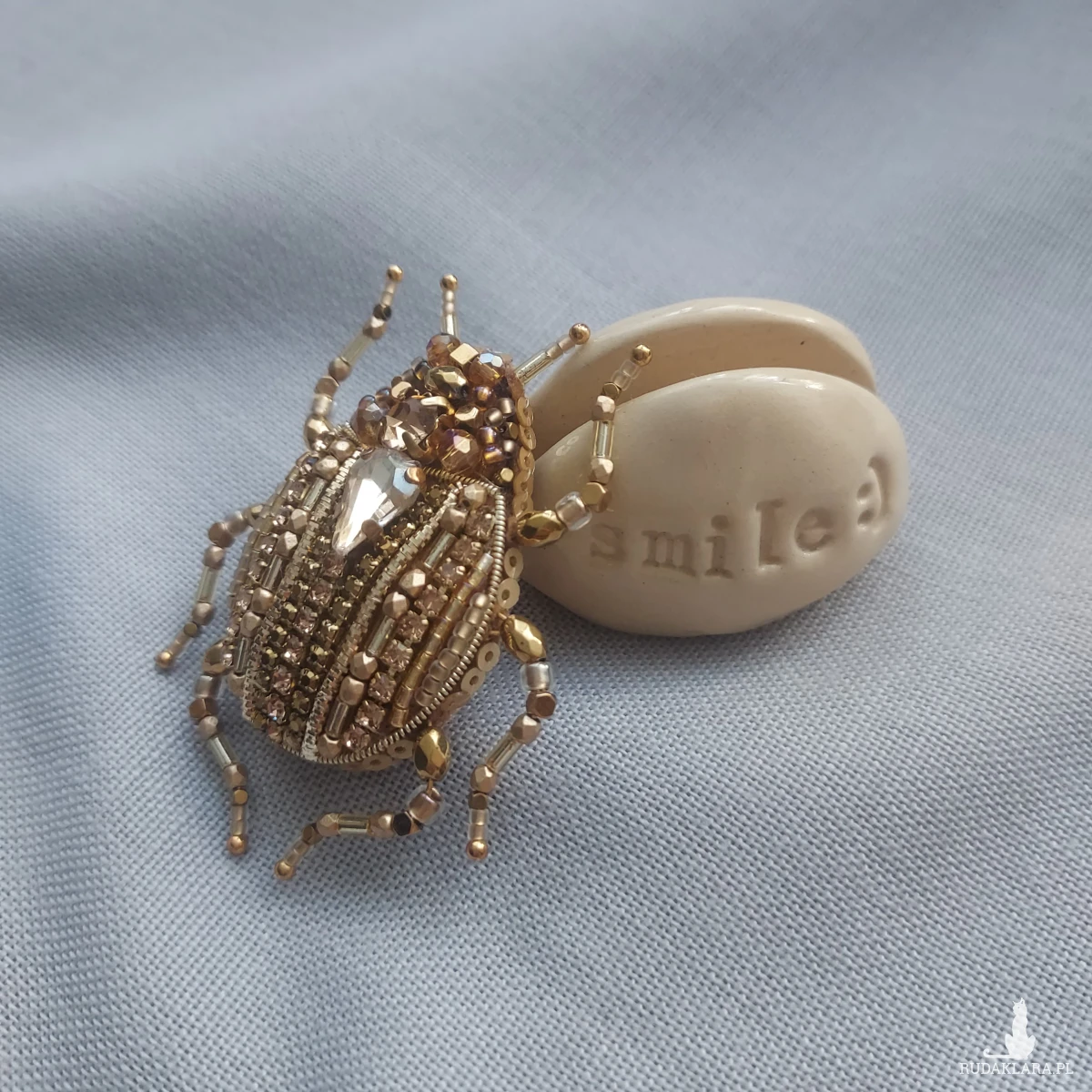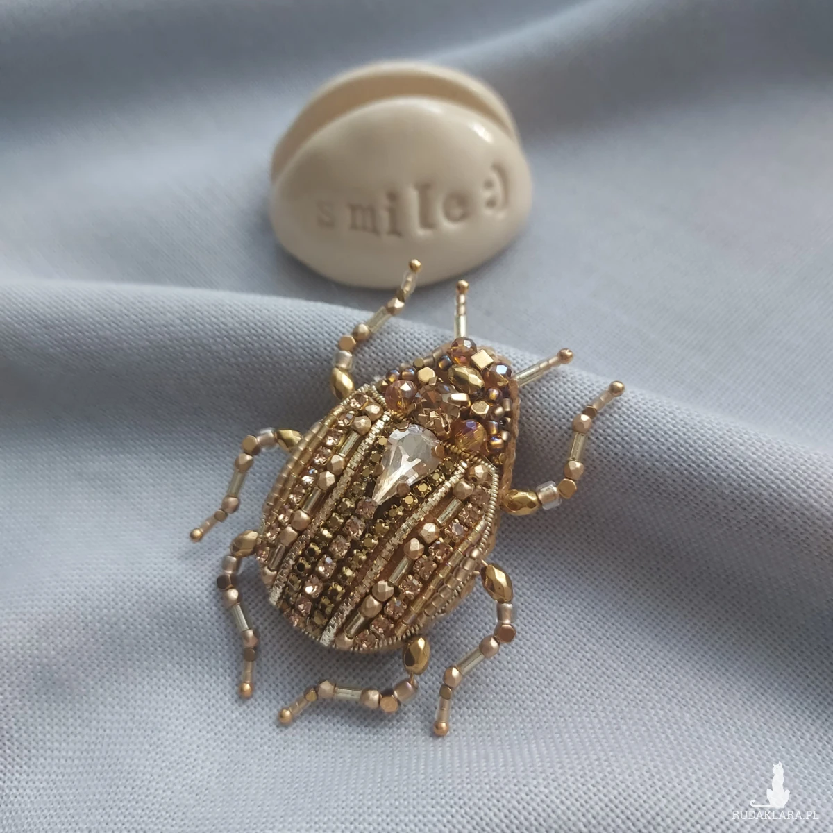 Wyjątkowa, jedyna w swoim rodzaju broszka ŻUCZEK w kolorze złotym przyciągnie uwagę niespotykanym blaskiem koralików oraz kryształków pięknie mieniących się w promieniach sierpniowego słońca.