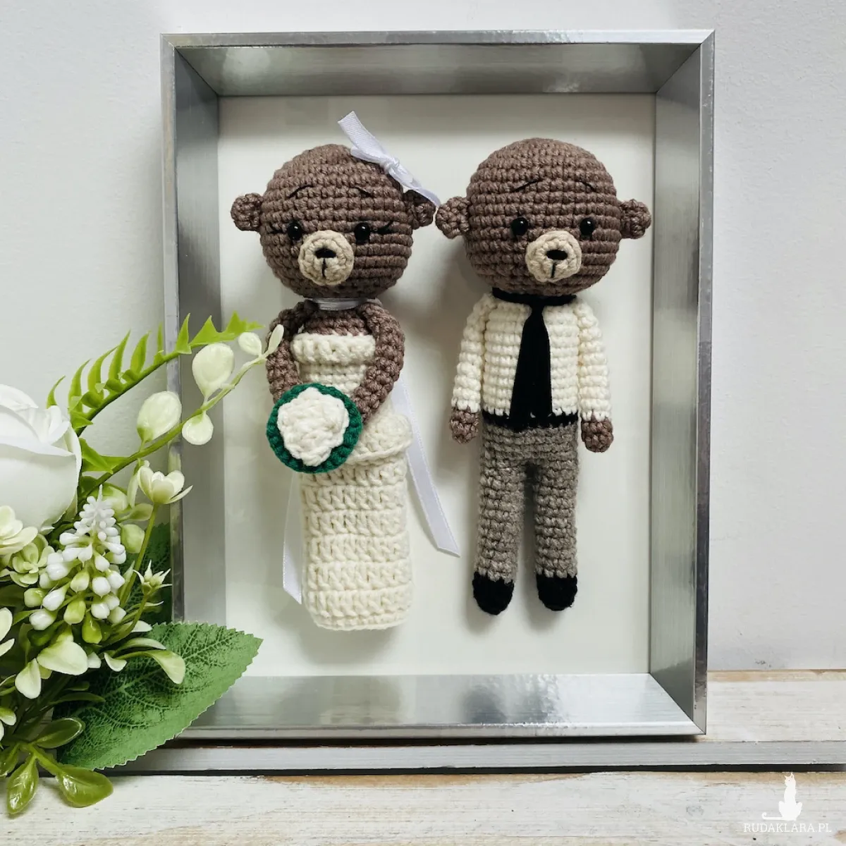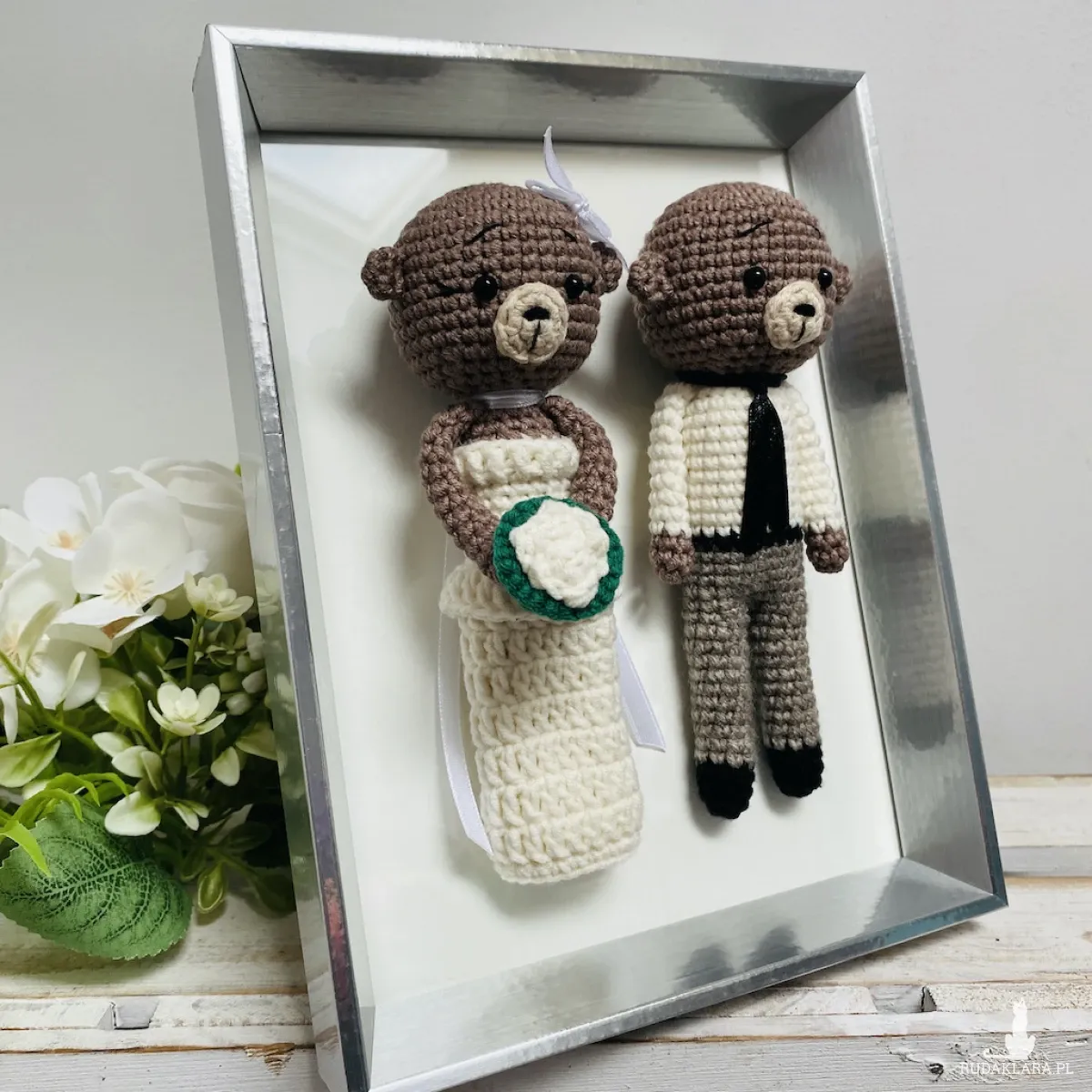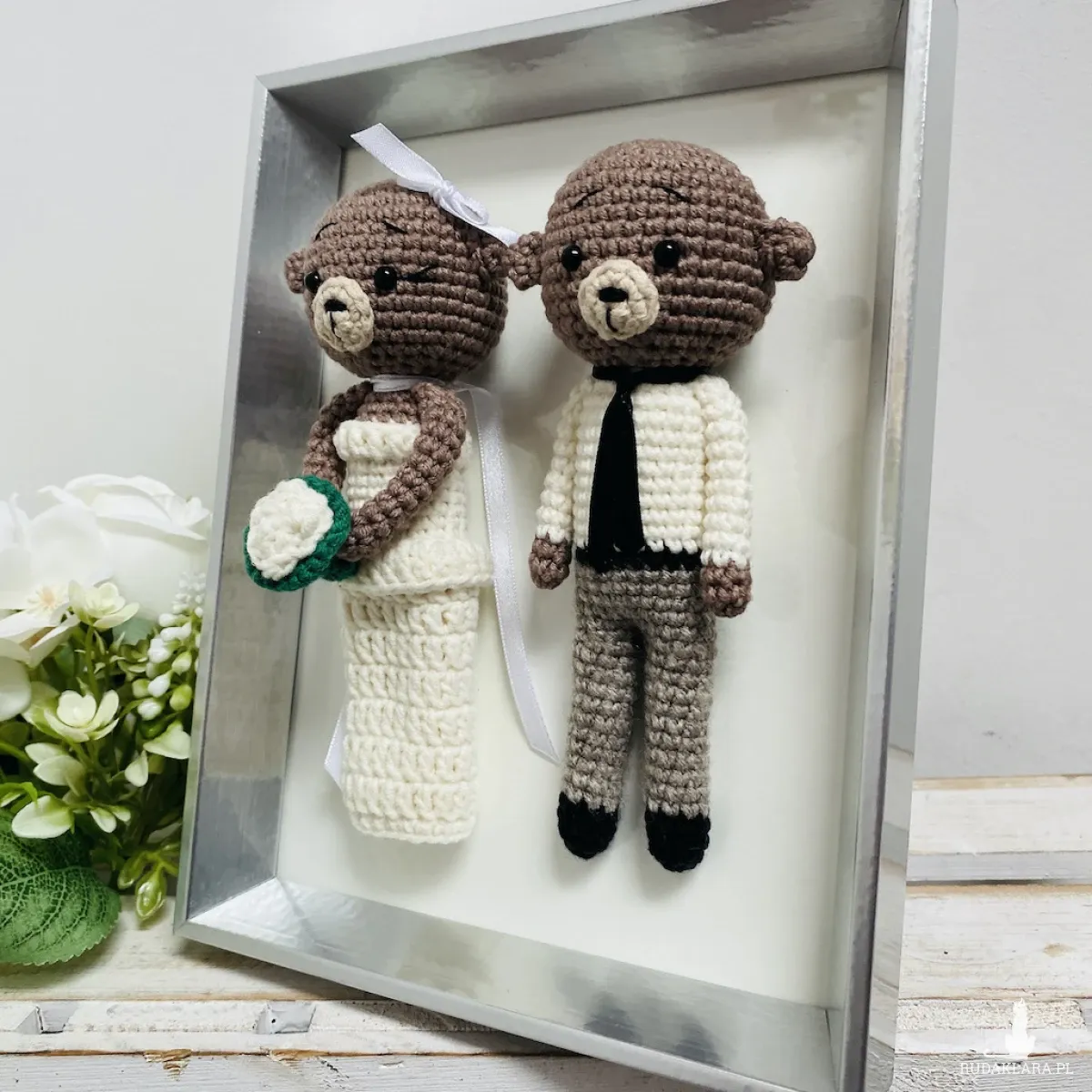 Szukasz unikalnego prezentu ślubnego? Te ręcznie wykonane, szydełkowe misie w ramce stanowią oryginalną pamiątkę ślubu, podziękowanie dla gości lub subtelną dekorację weselną.