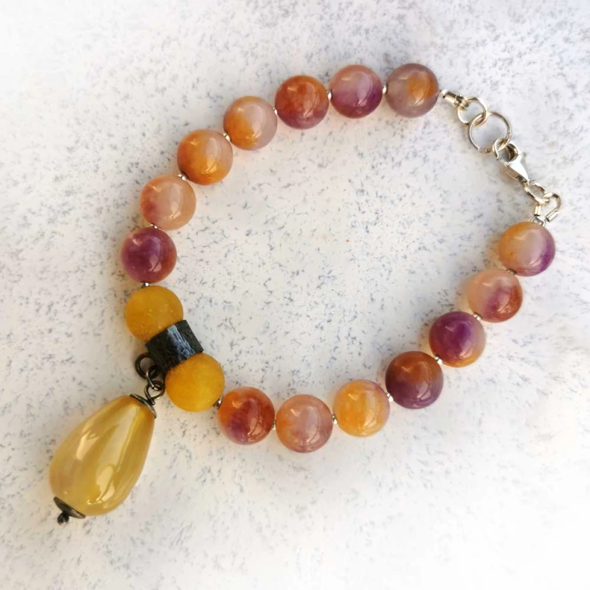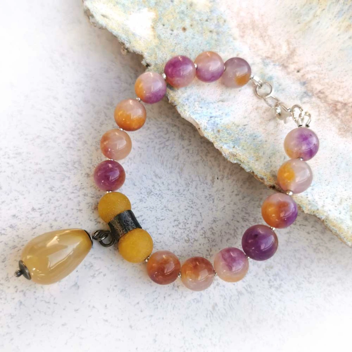 Bransoletka została wykonana z gładkich korali o średnicy 8 mm w energetycznym połączeniu kolorów, które pięknie ze sobą kontrastują. Uroku dodaje jej zawieszka w formie kropli agatu w ciepłym, słonecznym kolorze, przyciągająca wzrok swoim blaskiem. Całość uzupełniają srebrne elementy próby 925 oraz wygodne zapięcie na karabińczyk, które zapewnia komfort noszenia. To stylowy dodatek, który doskonale sprawdzi się jako prezent lub jako barwne uzupełnienie letnich i codziennych stylizacji.