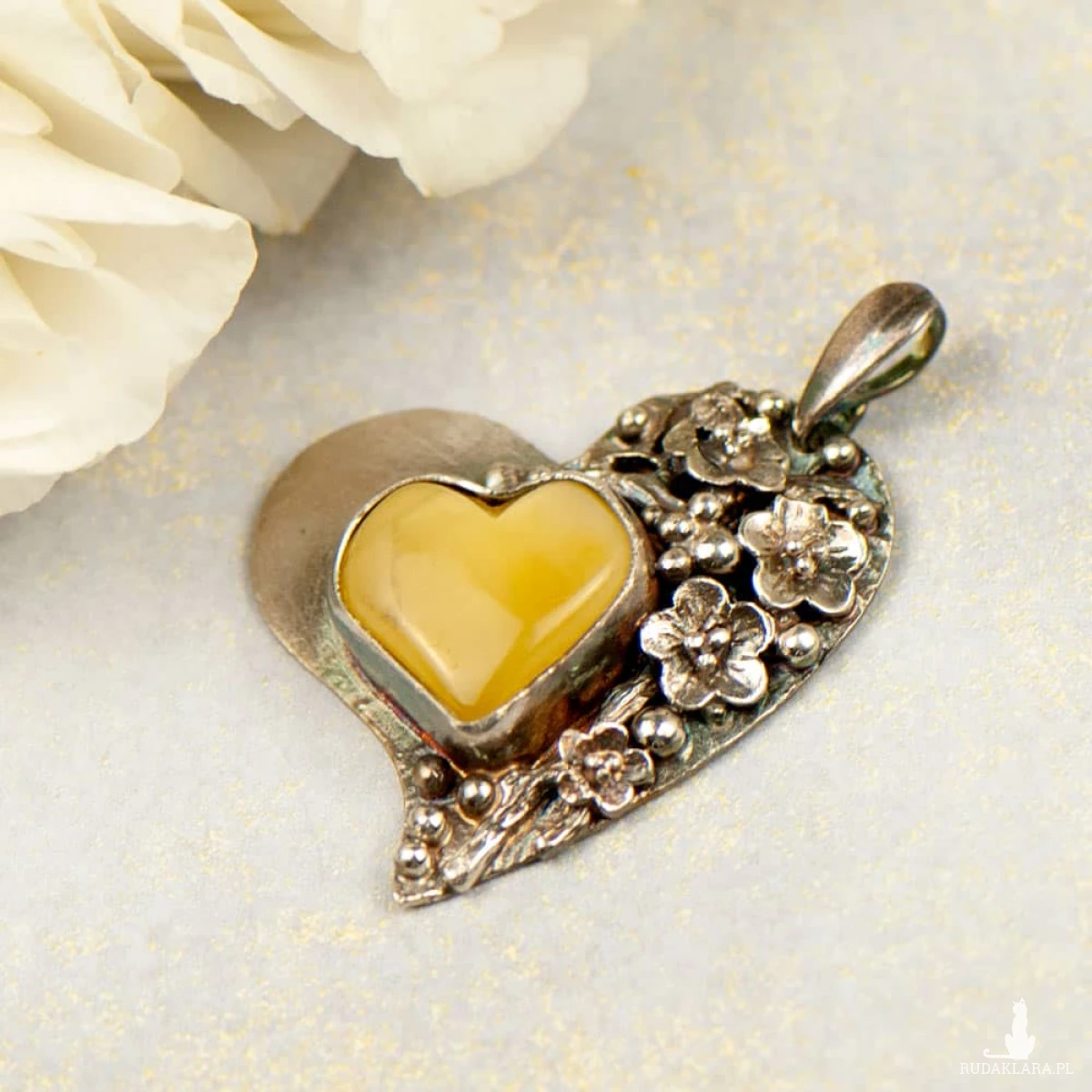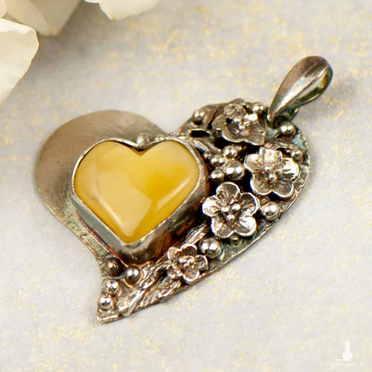 Wisior w kształcie serca został wykonany ze srebra próby 925 i ozdobiony mlecznym bursztynem, którego ciepła barwa przywodzi na myśl blask słońca. Delikatne, srebrne kwiatuszki – charakterystyczny motyw pracowni Artseko – nadają mu romantycznego, subtelnego uroku. Powierzchnia srebra została oksydowana i ręcznie przecierana, dzięki czemu biżuteria zyskała wyjątkową głębię oraz subtelne refleksy mieniące się niczym tęcza. To unikalna, sygnowana praca, która sprawdzi się zarówno jako pamiątka związana z nadmorskimi wspomnieniami, jak i wyjątkowy prezent dla bliskiej osoby.