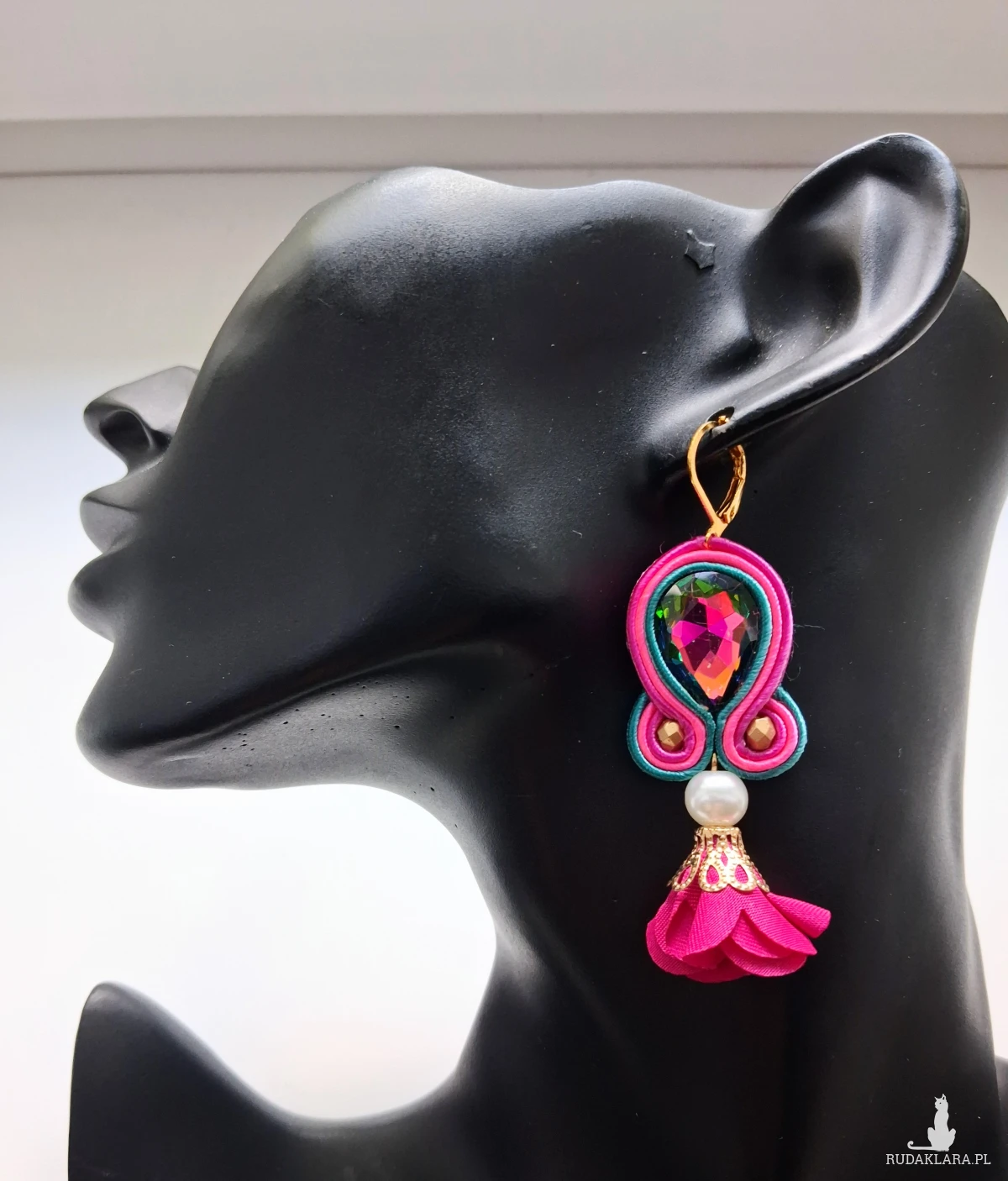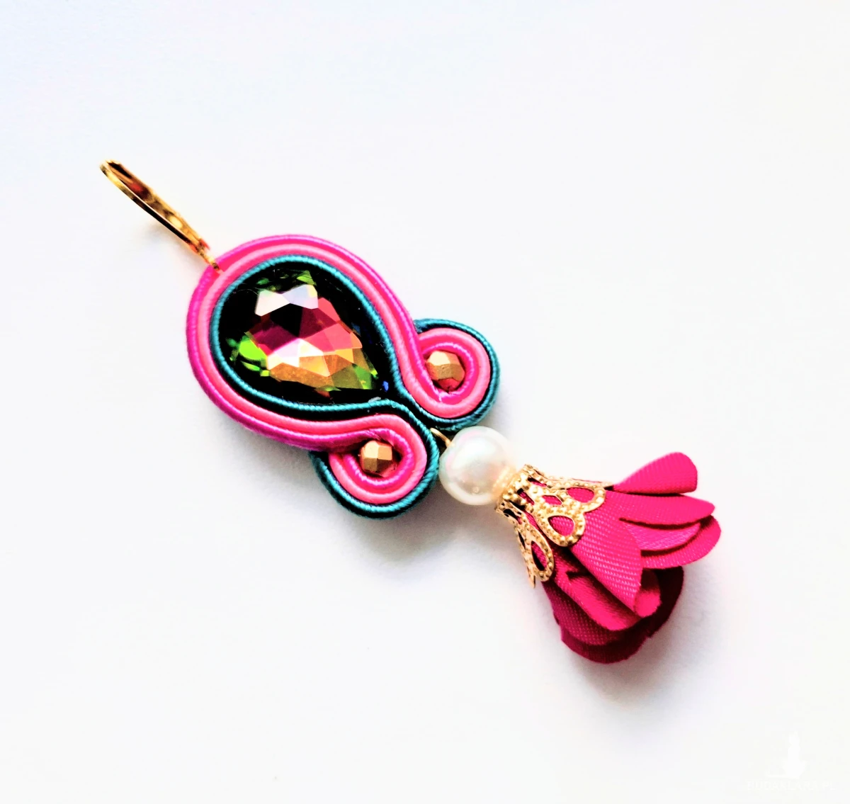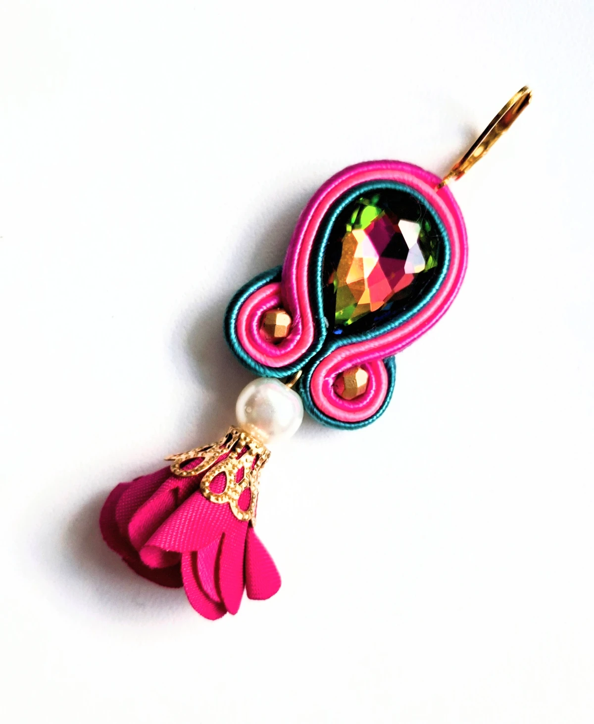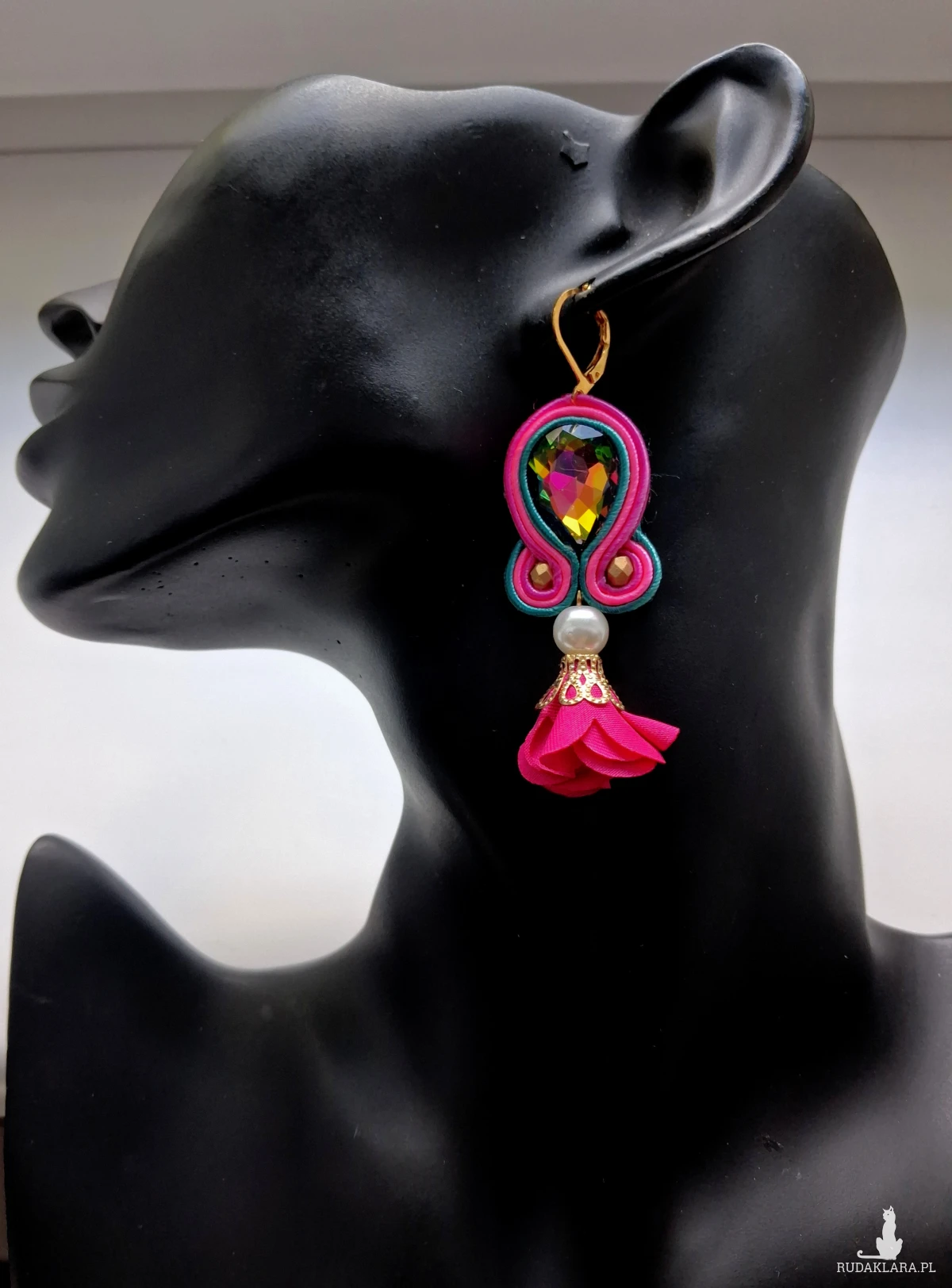 Materiał: sutasz, kwiat satynowy, koraliki Fire Polish, kryształ szlifowany.