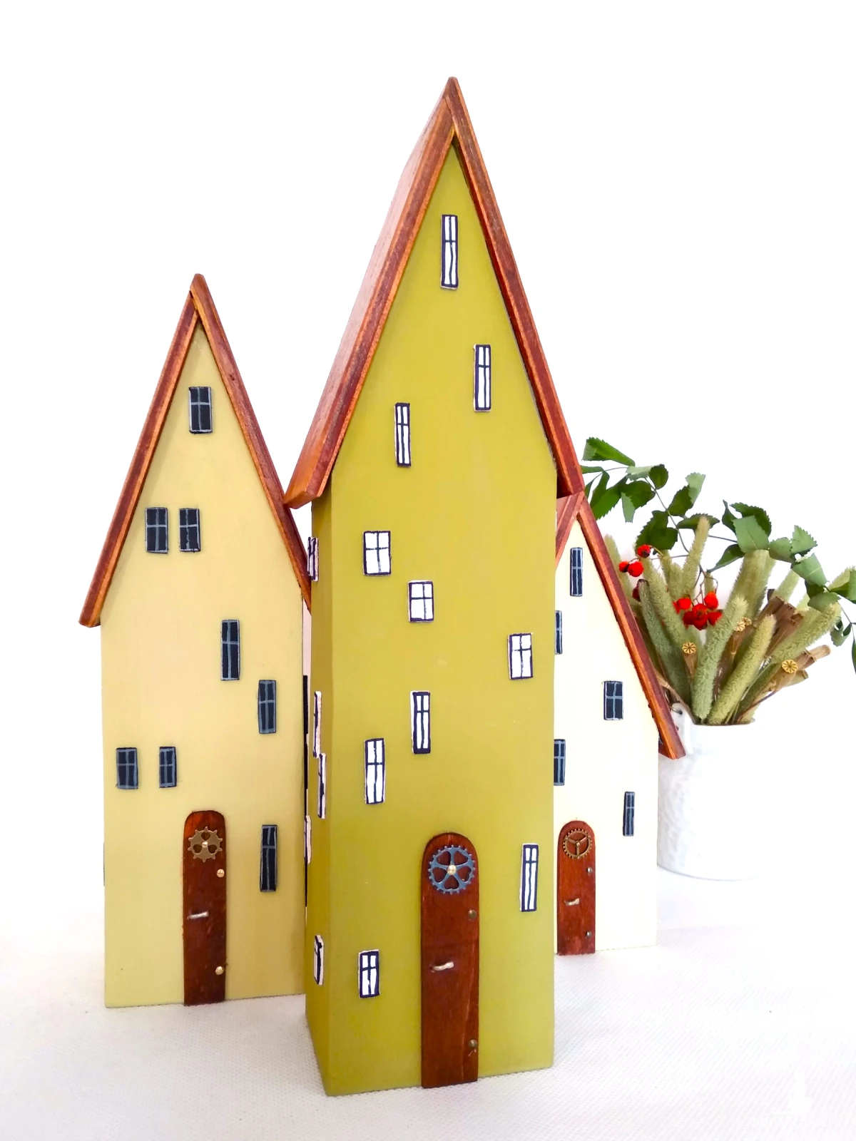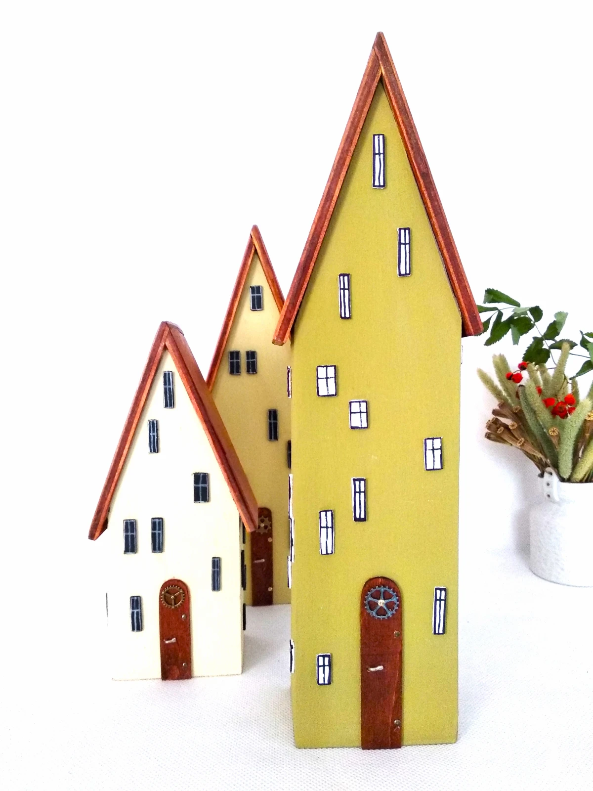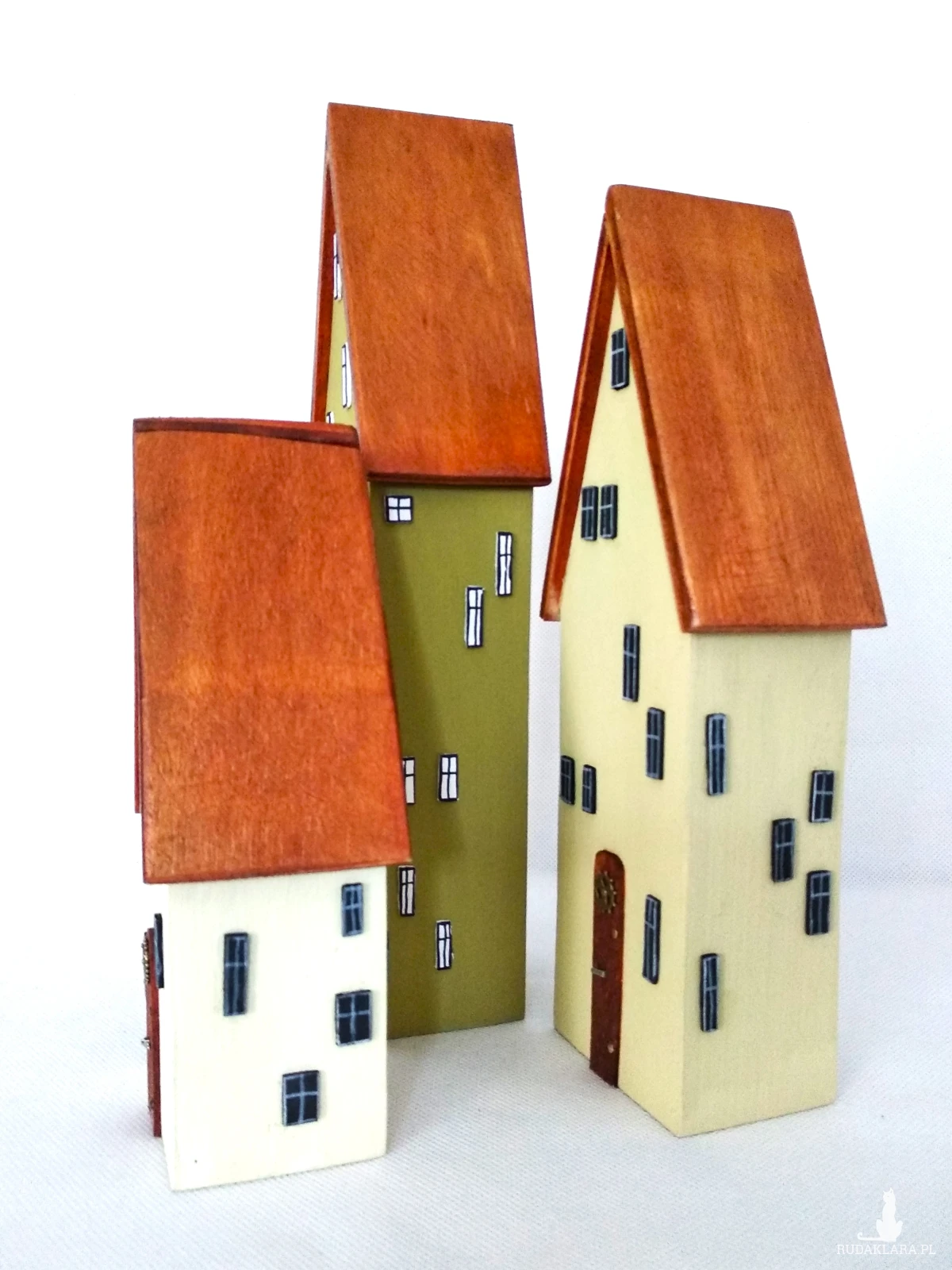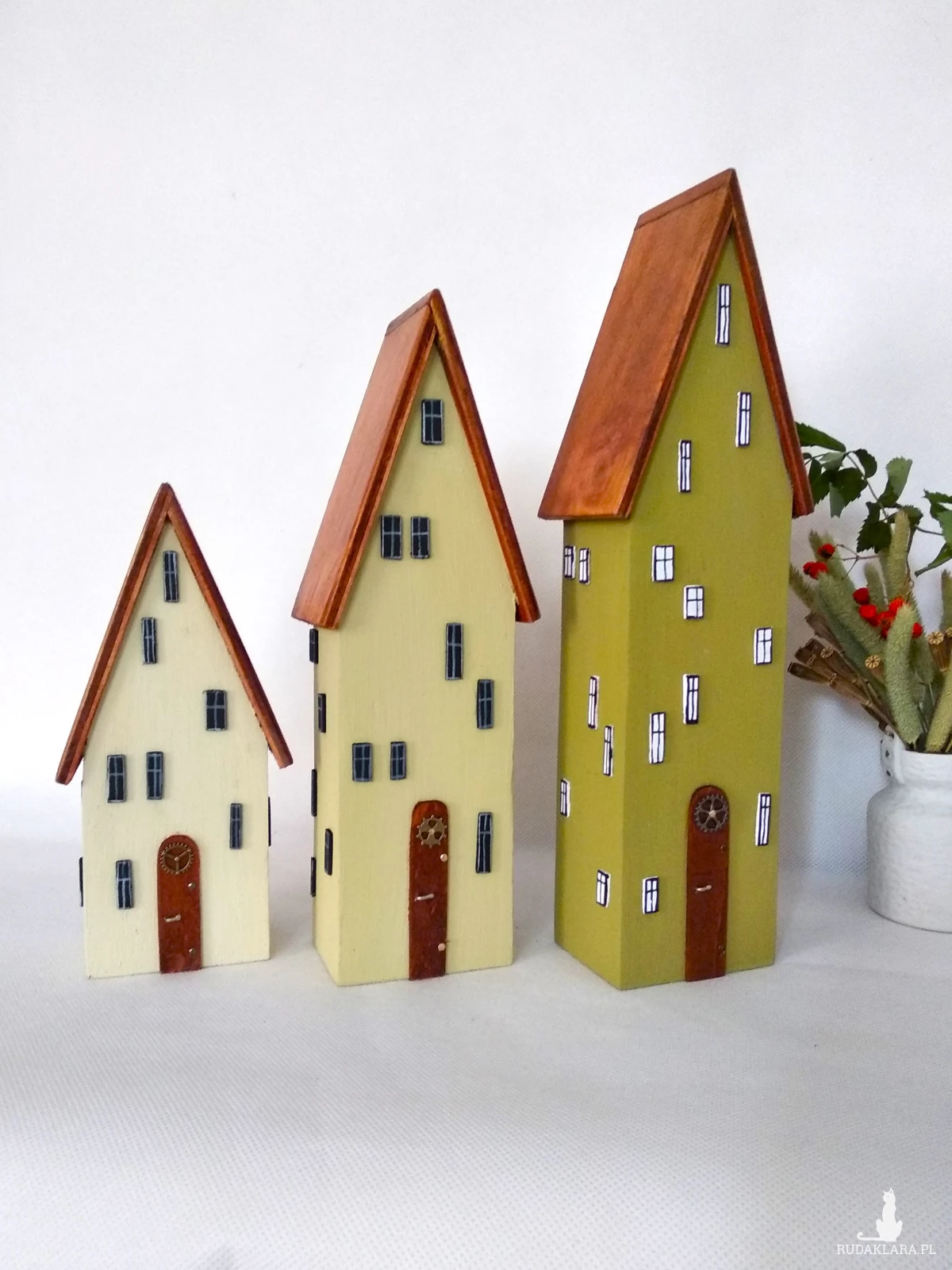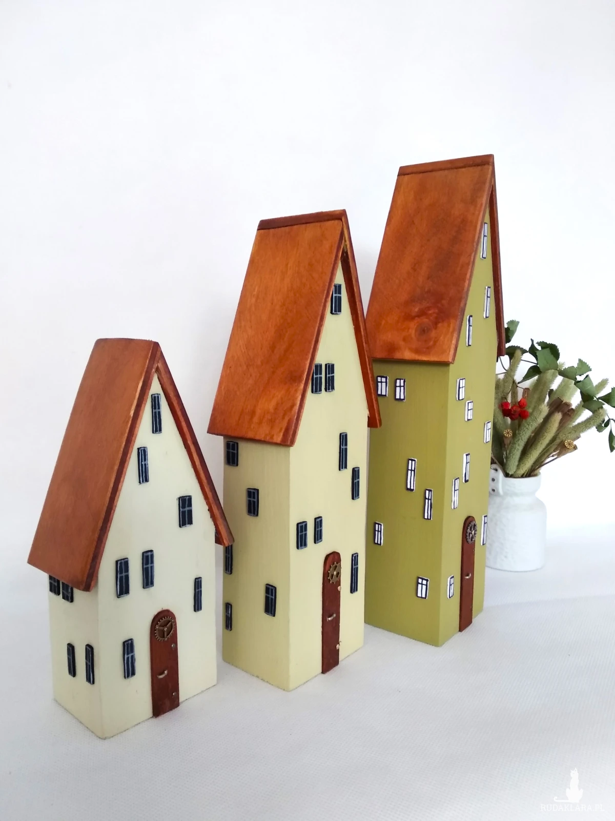 Domki zostały wykonane ręcznie z litego drewna sosnowego – każdy z nich to mała historia zamknięta w kształcie i fakturze. Malowane farbami akrylowymi, a spokojna, pastelowa paleta barw w dodaje im ciepła i harmonii. Dachy domków barwionymi bejcą wodną i zabezpieczone satynowym lakierem.