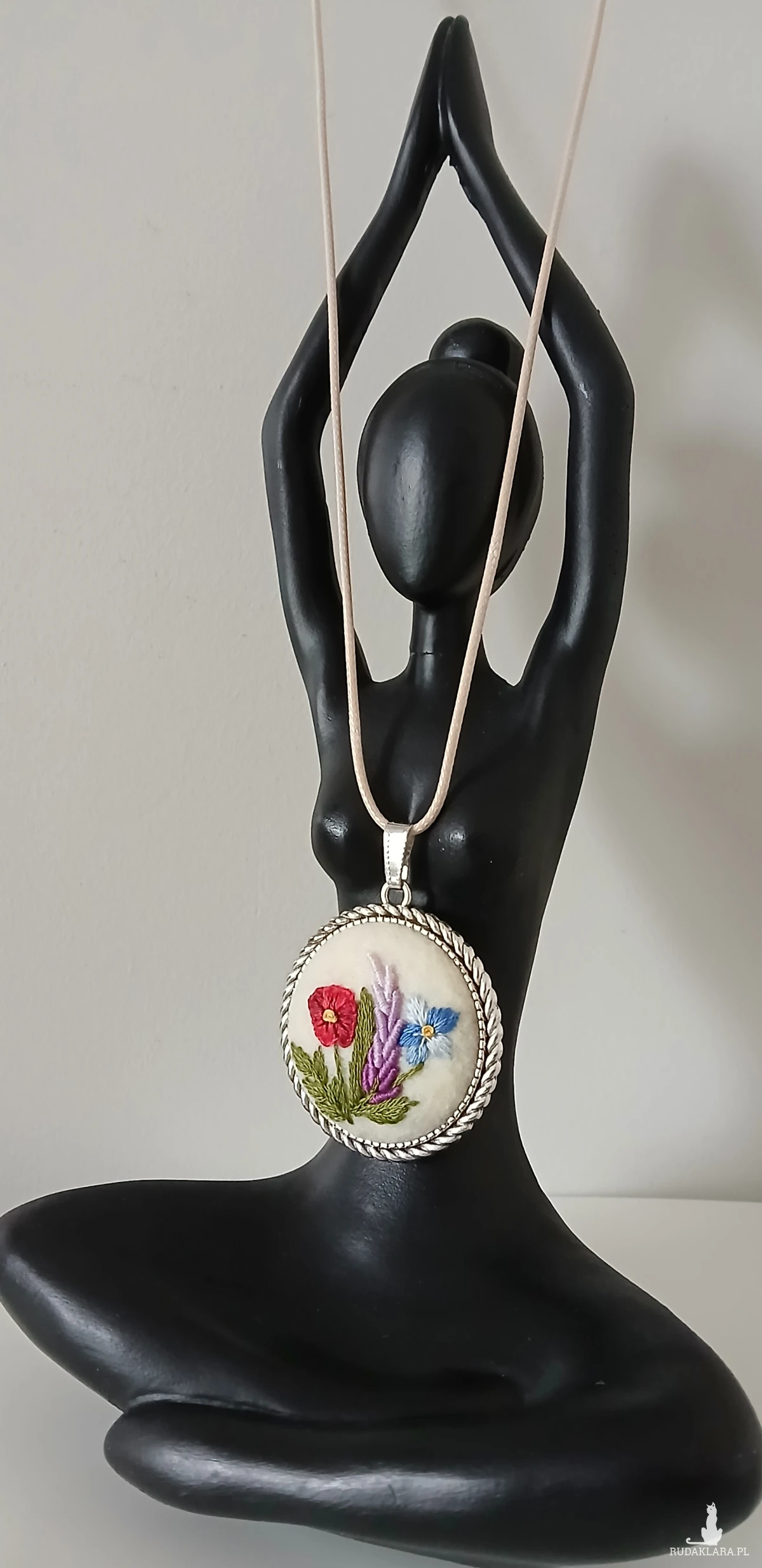 Perfekcyjnie dopracowany haft na filcu wykonałam polską bawełnianą muliną za pomocą igły. Jest on zabezpieczony impregnatem do tkanin ale po dłuższym użytkowaniu można go odświeżyć przy pomocy delikatnego mydła i letniej wody.
